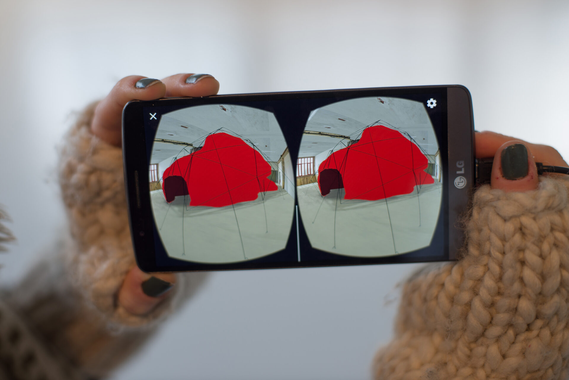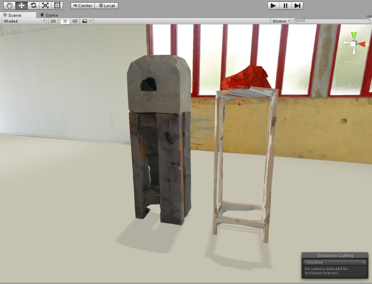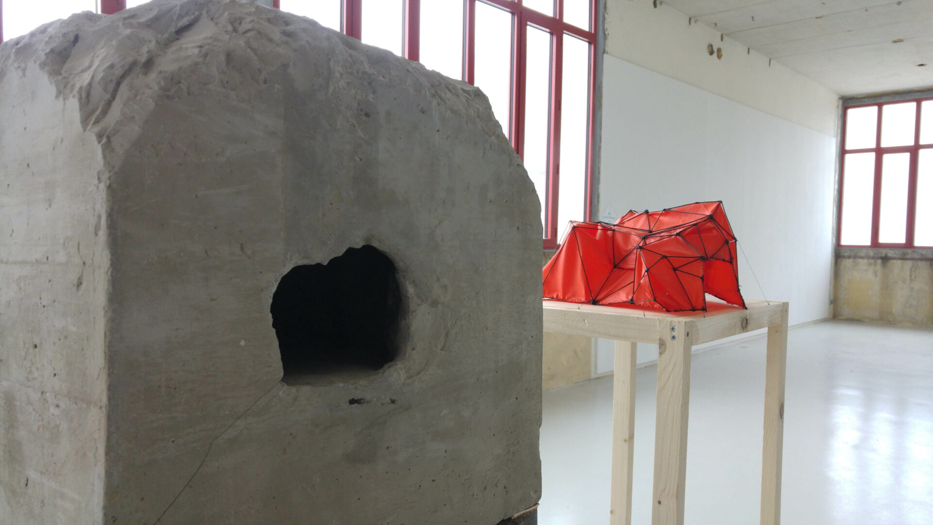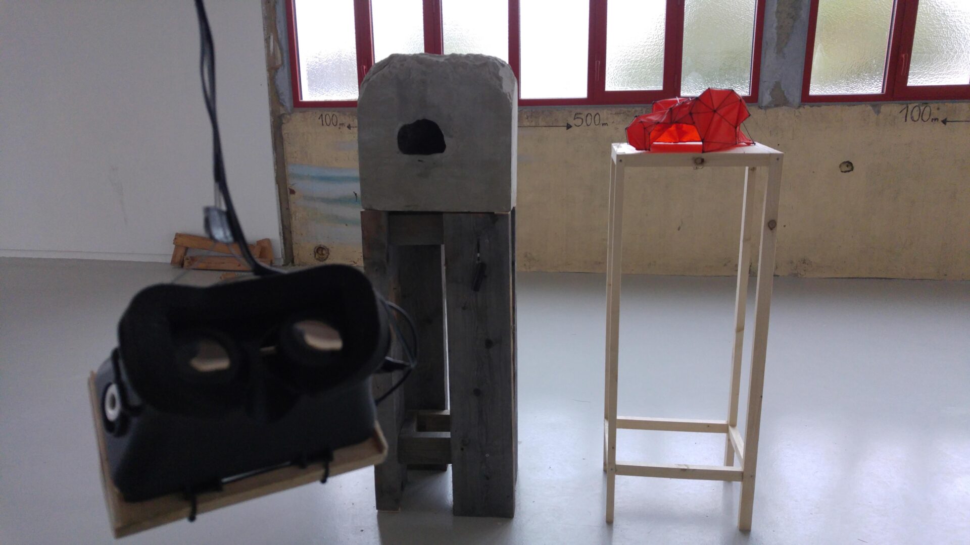 _Je pense pouvoir dire que ce travail concentre trois «réalités» aux attributs différents mais interconnectées. La première n’en n’est pas tout à fait une. C’est celle de la matière, du concret. Ici cette matière est fausse, dans le sens où cette «roche» est une fiction d’elle même : la caverne apparaît en miniature dans un bloc de pierre artificiel fait de béton pur. Malgré sa présence, son poids, sa pesanteur, ce n’est que l’image de ce quelle représente. Il est cependant intéressant de savoir que le terme anglais pour dire béton est «concrète»…Voila qui referme la boucle ! Le deuxième élément est une maquette de tente, dont la forme découle des volumes de la petite caverne précédent. Elle appartient donc à cette première réalité elle aussi mais pas seulement. En effet, l’espace en ces deux formes similaire, cet «entre-deux» crée une autre réalité ou plutôt une autre dimension : celle de la translation. C’est cet espace vide qui donne corps au «glissement» entre les deux objets. L’un se transforme en l’autre et change de nature tout en gardant certains attribut tel que la forme ou la fonction d’abriter. La dernière réalité, quant à elle, est purement virtuelle. Elle permet de «re-fictionner» ce qui existe déjà, de créer des représentations de représentations. A travers le casque de réalité virtuelle, les notion de contraintes et d’échelle ne sont plus des problèmes et l’ambition peut apparaître «grandeur nature».