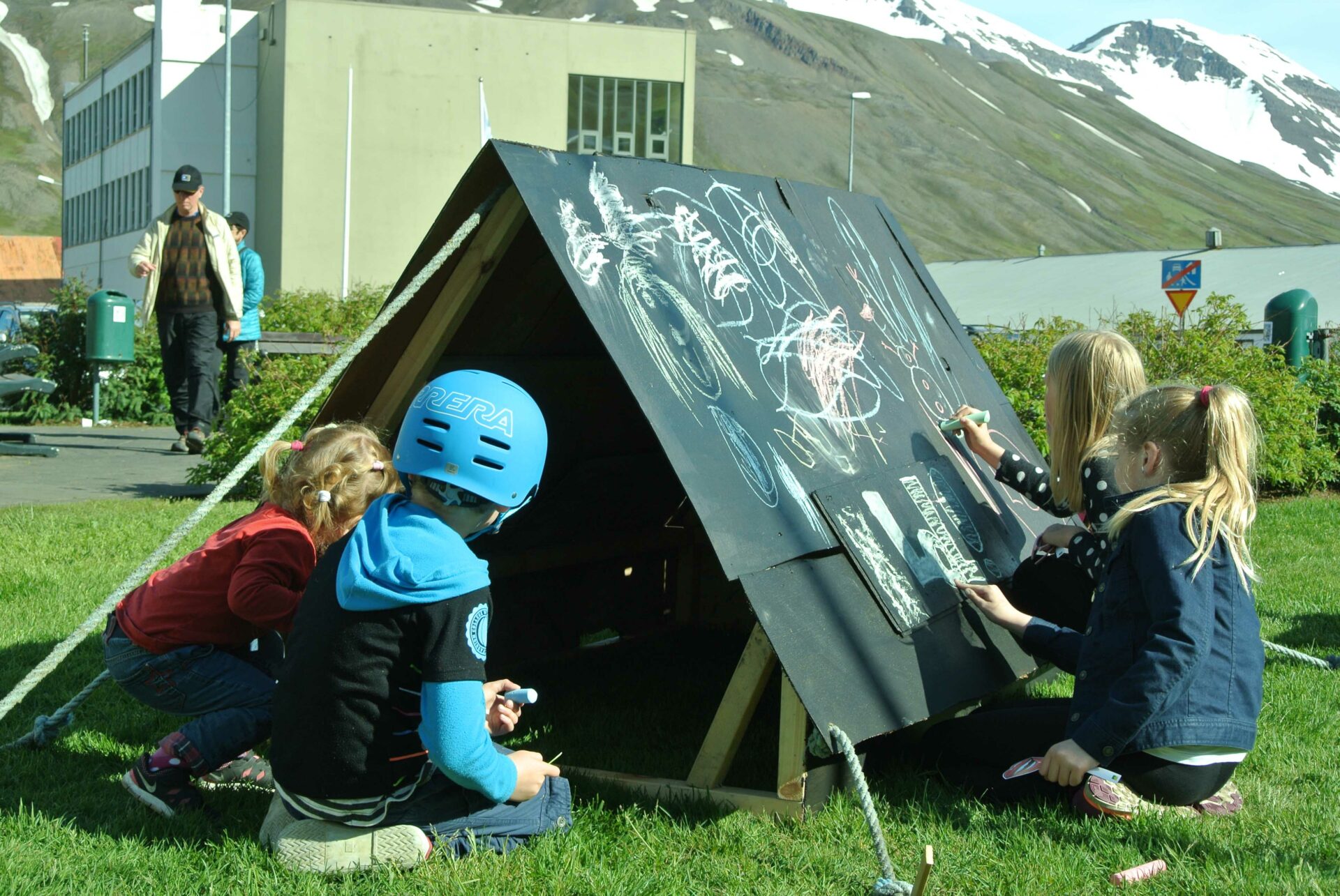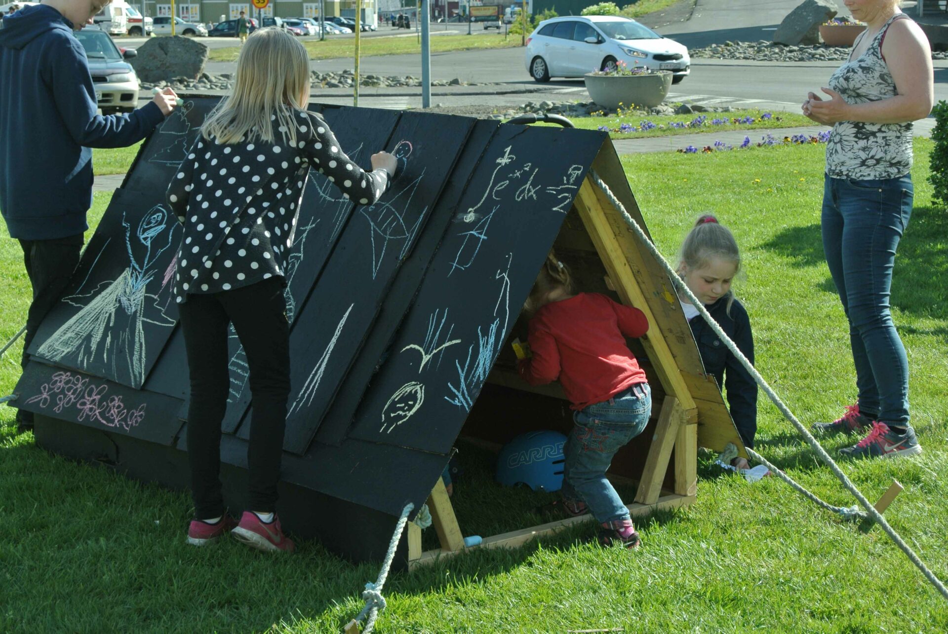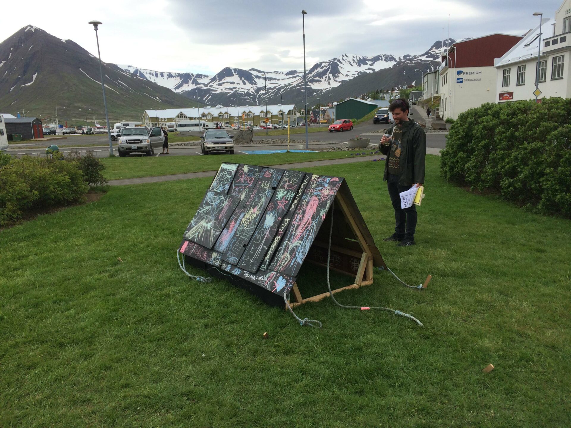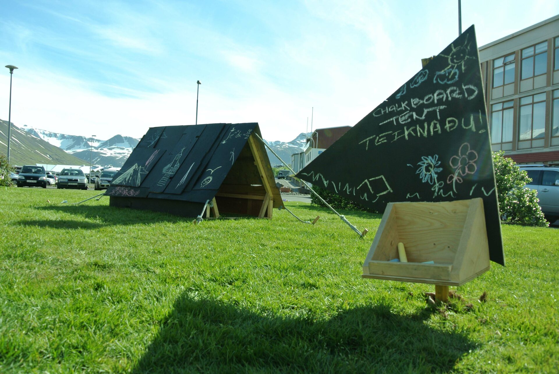 Le tourisme étant la nouvelle activité qui fait vivre la ville, créer un objet figurant le monde du camping mais ayant aussi un lien direct avec le passé ouvrier de la ville était important. Cette tente est constituée des débris provenant de la déchetterie de Siglufjörður. Certains panneaux de bois la constituant proviennent des anciens bâtiments de la ville : en particulier de l’ancienne école. On peut y voir encore de vieux dessins d’enfants, sans doute de ceux là même qui ont fréquenté l’école avant sa destruction. Cette “tente-tableau noir” a donc été construite et installée au centre de la ville. Un panneau invitait les gens, et en particulier les enfants, à dessiner à la craie en laissant libre cours à leur imagination. Un lien ténu s’est ainsi créée entre les enfants d’aujourd’hui et ceux du passé.