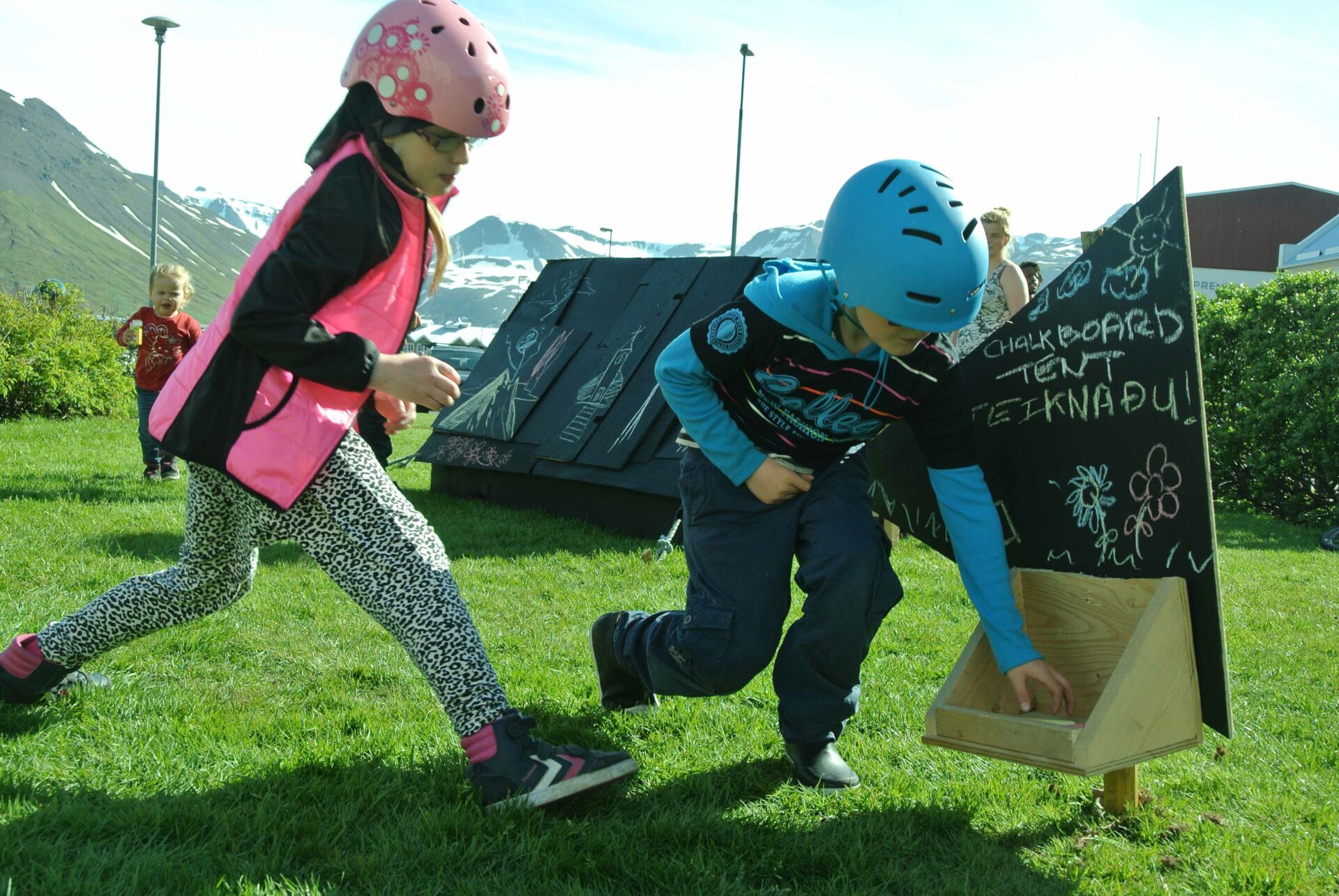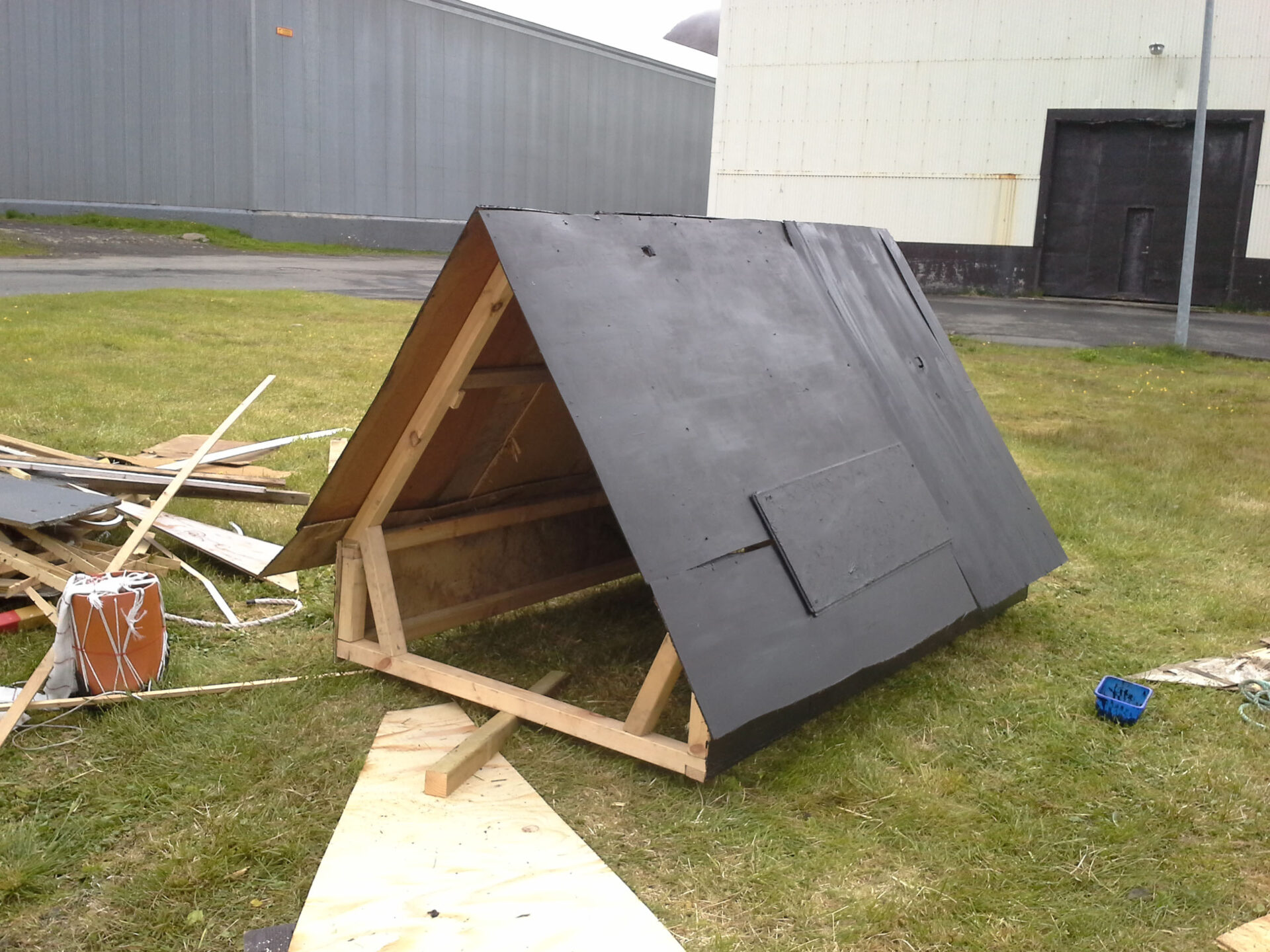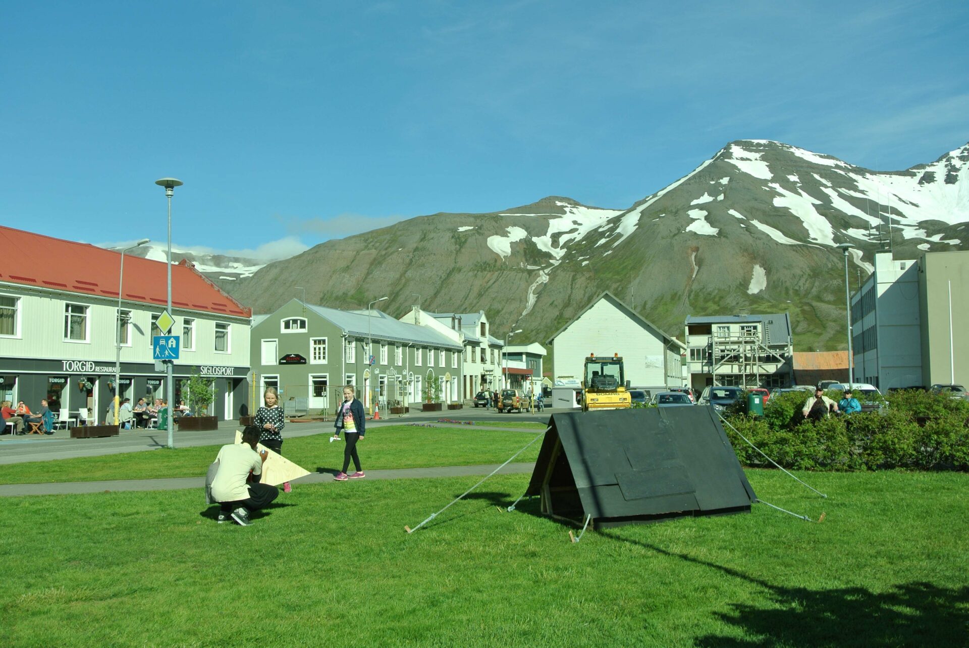 Le tourisme étant la nouvelle activité qui fait vivre la ville, créer un objet figurant le monde du camping mais ayant aussi un lien direct avec le passé ouvrier de la ville était important. Cette tente est constituée des débris provenant de la déchetterie de Siglufjörður. Certains panneaux de bois la constituant proviennent des anciens bâtiments de la ville : en particulier de l’ancienne école. On peut y voir encore de vieux dessins d’enfants, sans doute de ceux là même qui ont fréquenté l’école avant sa destruction. Cette “tente-tableau noir” a donc été construite et installée au centre de la ville. Un panneau invitait les gens, et en particulier les enfants, à dessiner à la craie en laissant libre cours à leur imagination. Un lien ténu s’est ainsi créée entre les enfants d’aujourd’hui et ceux du passé.