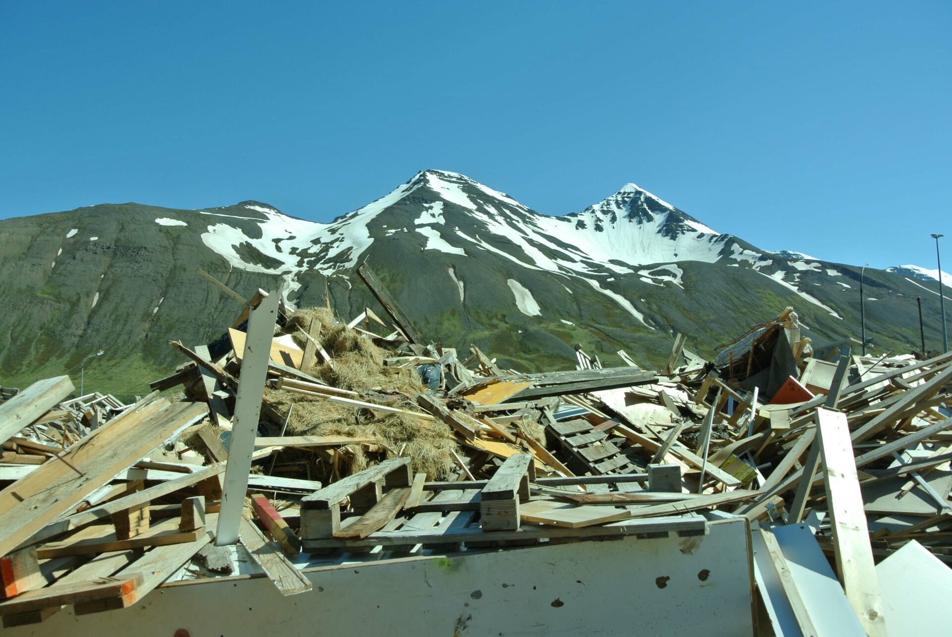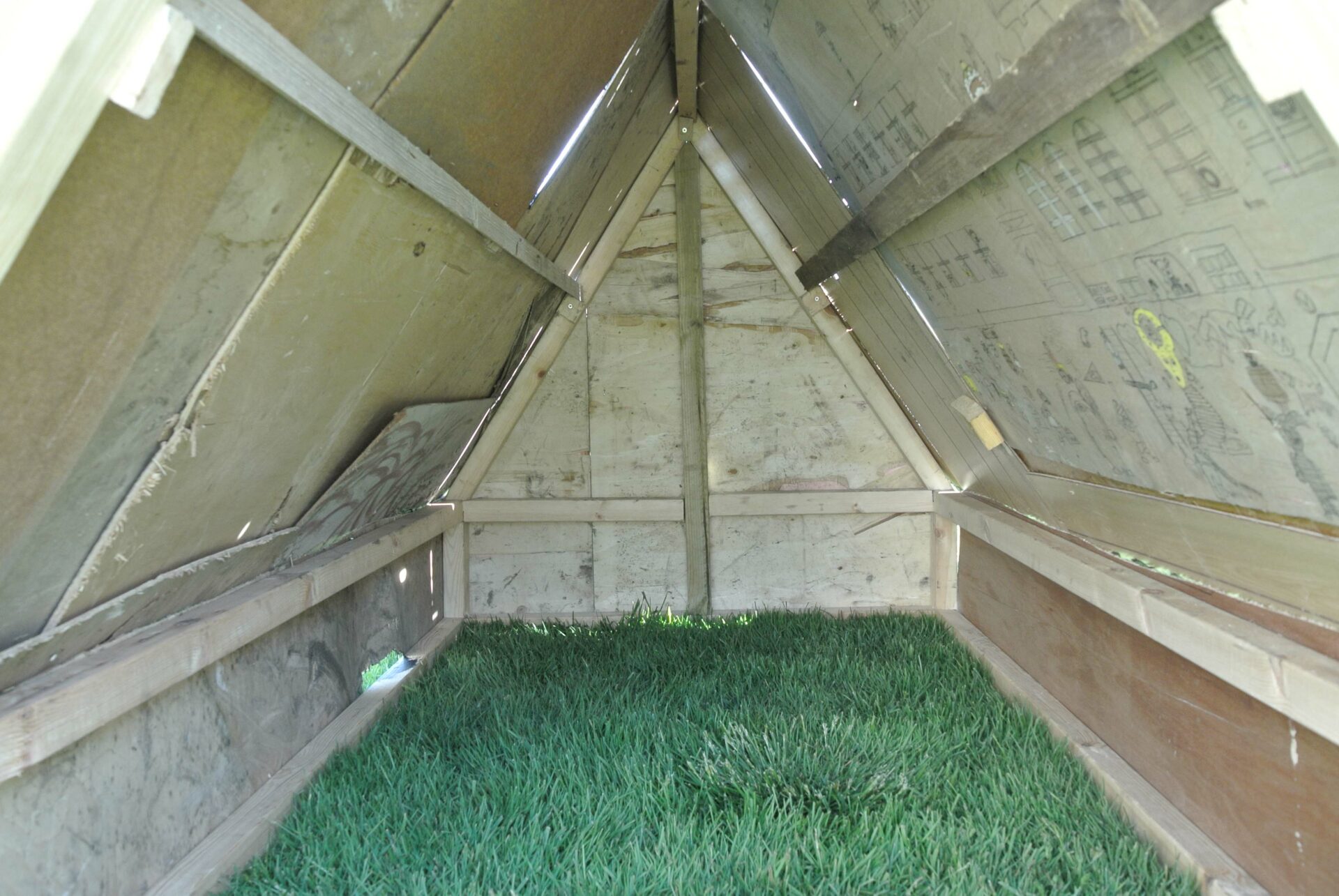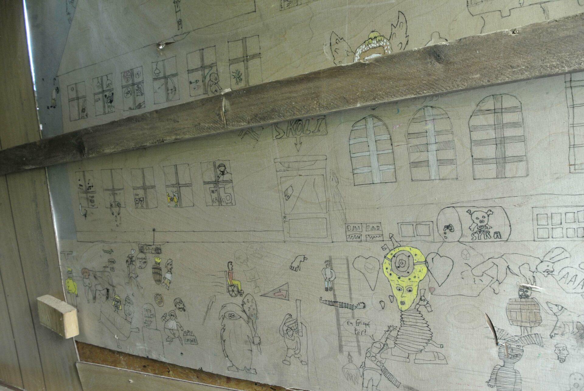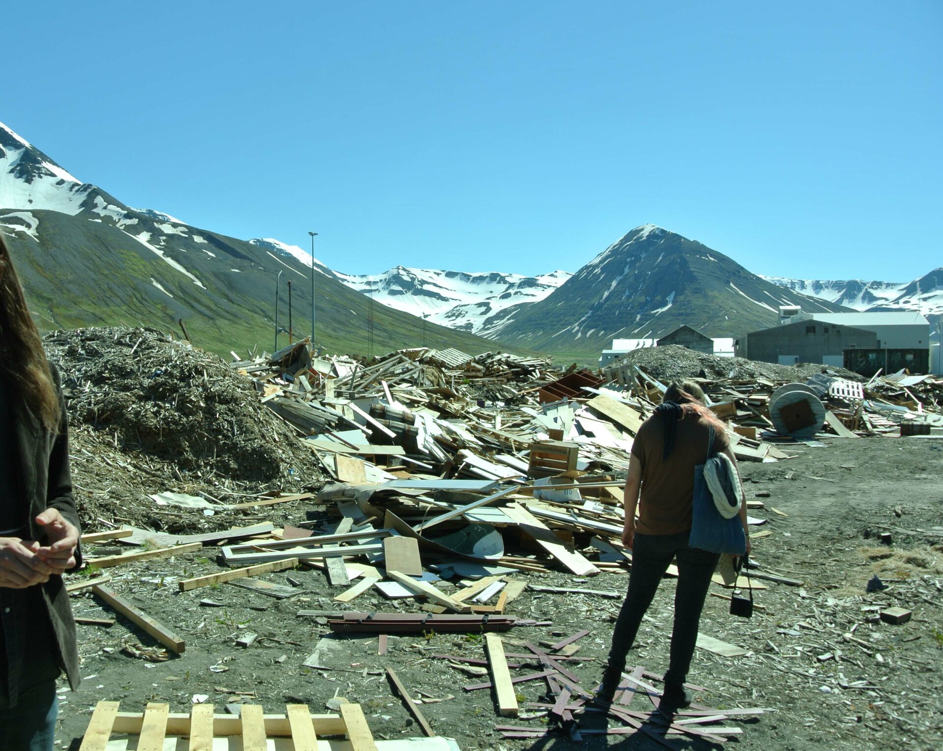 Le tourisme étant la nouvelle activité qui fait vivre la ville, créer un objet figurant le monde du camping mais ayant aussi un lien direct avec le passé ouvrier de la ville était important. Cette tente est constituée des débris provenant de la déchetterie de Siglufjörður. Certains panneaux de bois la constituant proviennent des anciens bâtiments de la ville : en particulier de l’ancienne école. On peut y voir encore de vieux dessins d’enfants, sans doute de ceux là même qui ont fréquenté l’école avant sa destruction. Cette “tente-tableau noir” a donc été construite et installée au centre de la ville. Un panneau invitait les gens, et en particulier les enfants, à dessiner à la craie en laissant libre cours à leur imagination. Un lien ténu s’est ainsi créée entre les enfants d’aujourd’hui et ceux du passé.