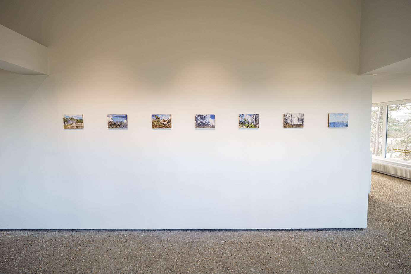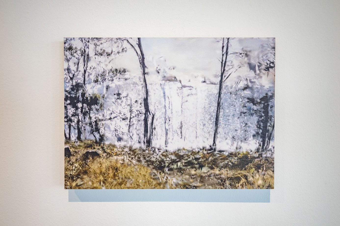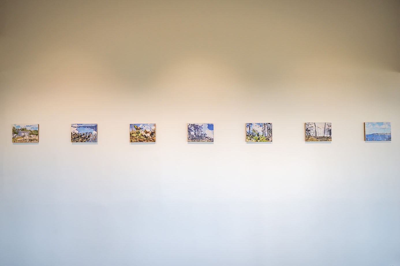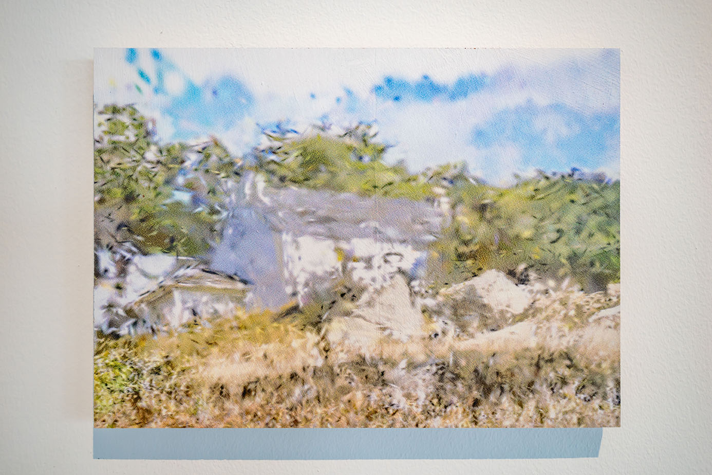 Issues de photogrammétries réalisées à la galerie du Dourven, ces impressions sont obtenues par des recadrages sur les arrière plans et le paysage environnant, évacuant ainsi le sujet original. Le photo-réalisme vacille, le numérique glisse alors vers une matière qui évoque la technique picturale : aplats incertains, contours vibrants, textures qui hésitent entre le pixel et la touche. Les supports, simples plaques de bois peintes, sèment le doute entre images numériques et techniques traditionnelles. Cette série propose une représentation de paysages qui s’auto-recomposent à travers leurs propres accidents. Un fil fragile les traverse : une oscillation entre une nature contrôlée et son propre réensauvagement.