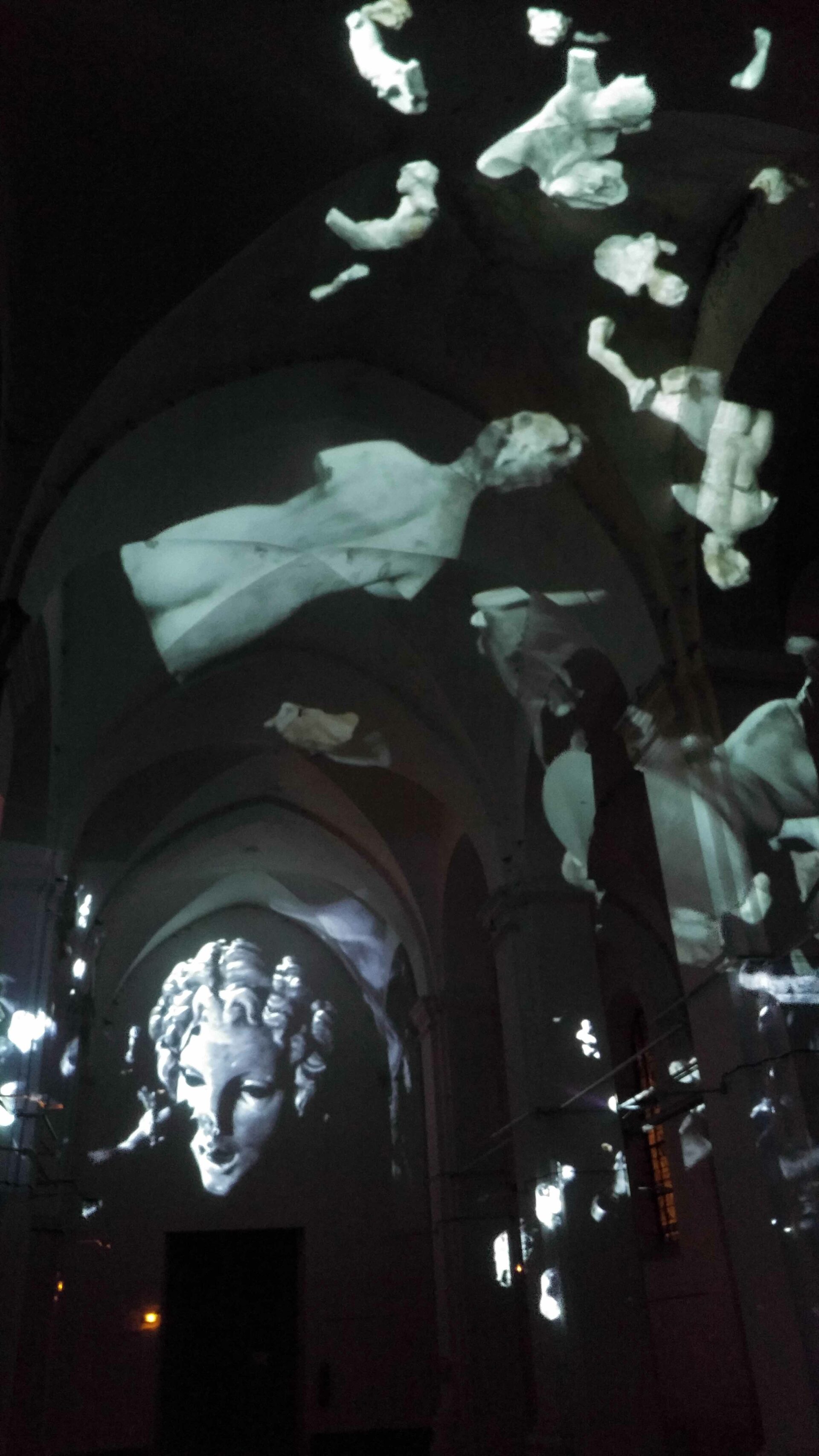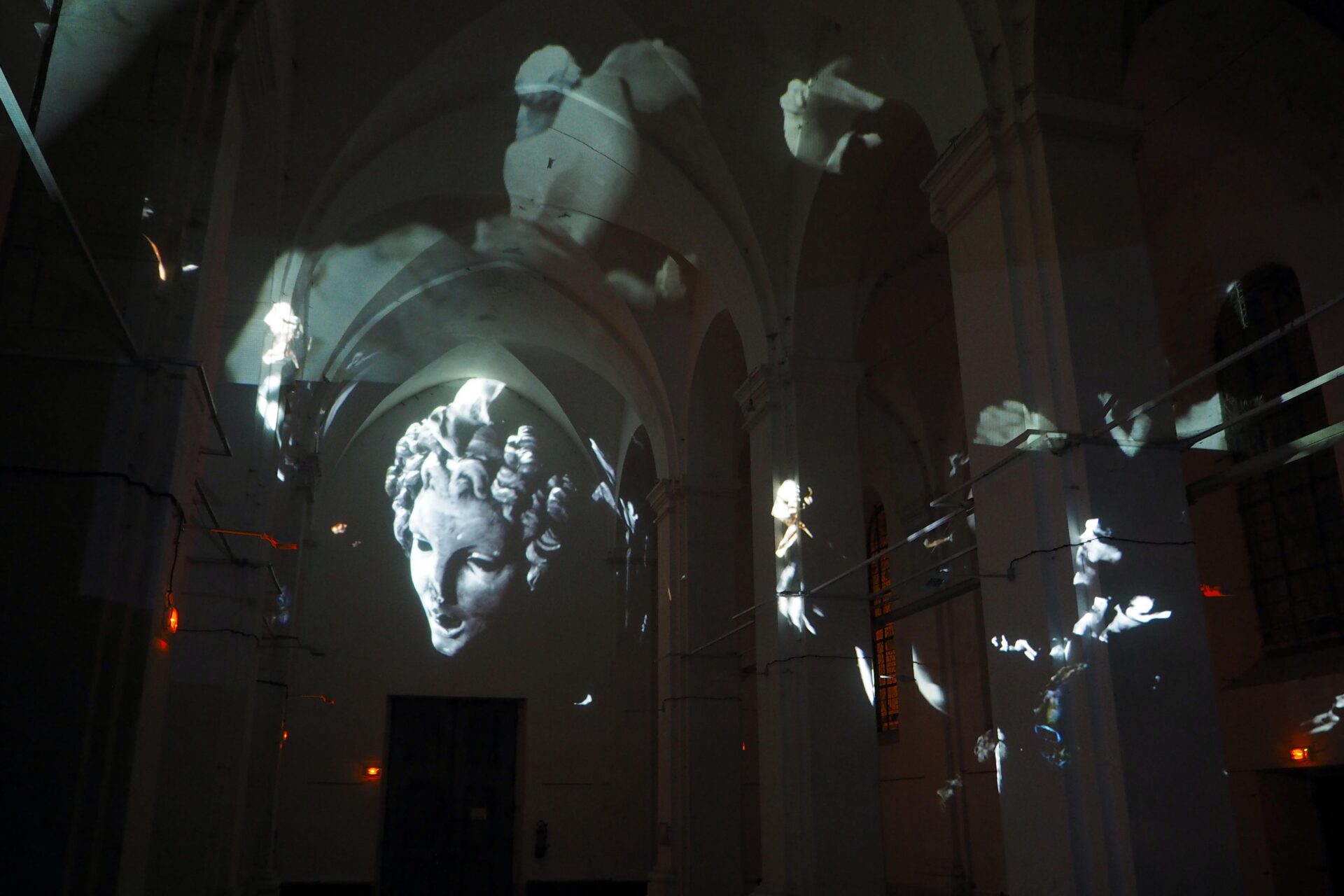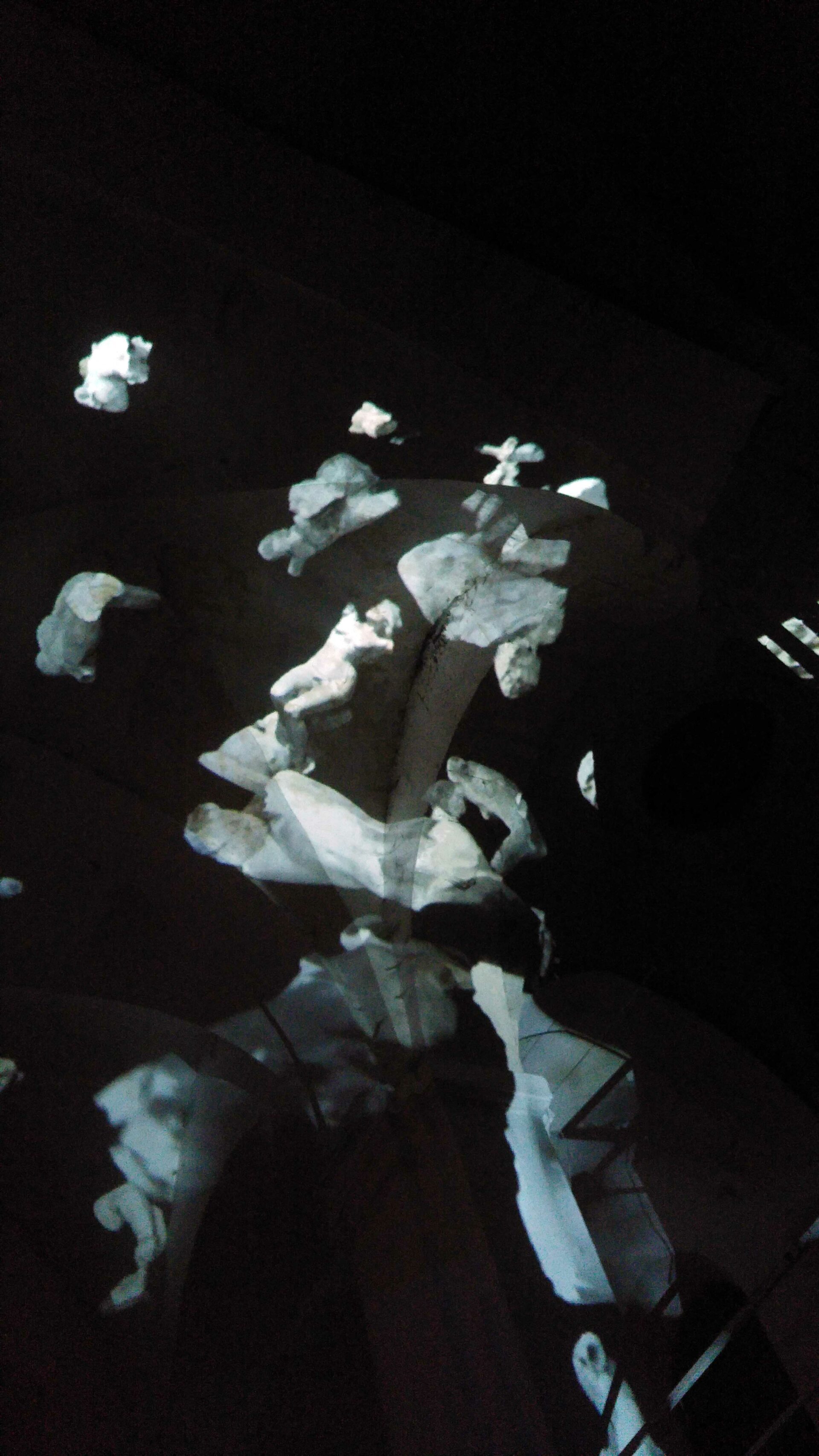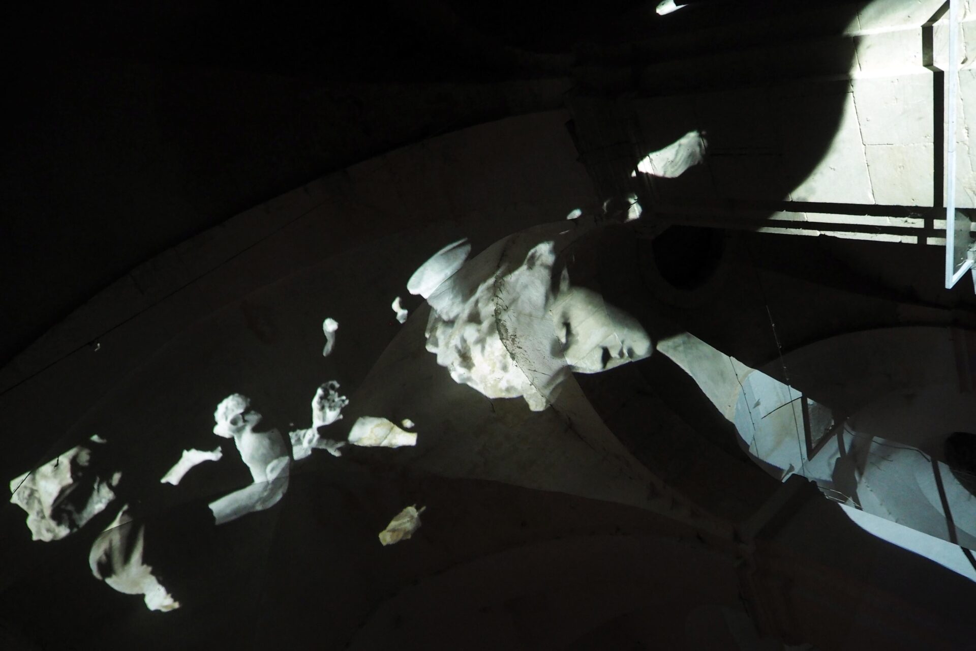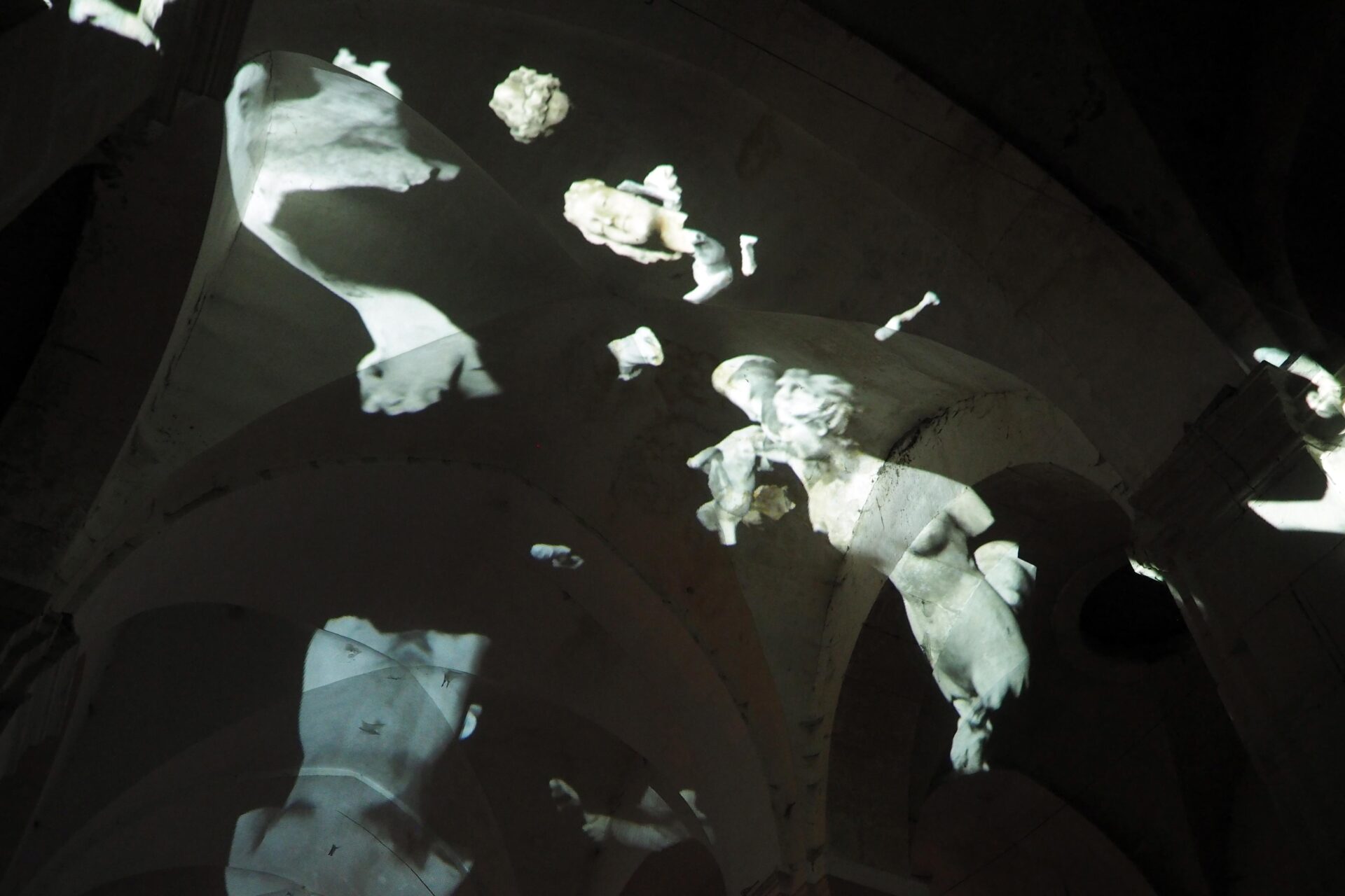 L’idée de ce projet est simple : transformer en corps célestes les différents plâtres du Paradis de Sommevoire. Ici ce n’est pas une vidéo qui diffuse des objets en lévitation sur la voute, les colonnes et le mur d’entrée de l’église Saint Pierre, mais un programme générant des déplacements aléatoires en temps réel. Figure centrale de la projection, la Gorgone du paradis apparait ici géante, monumentale, tel un masque à la bouche béante. Des morceaux de corps, sortes d’astéroïdes perdus, s’entrechoquent au hasard de leur pérégrination. Durant la soirée de présentation de cette création, le public était invité à prendre une tasse de vin chaud sous les arches de l’édifice désacralisé tout en prenant le temps d’observer les mouvements de cette « voute céleste ».