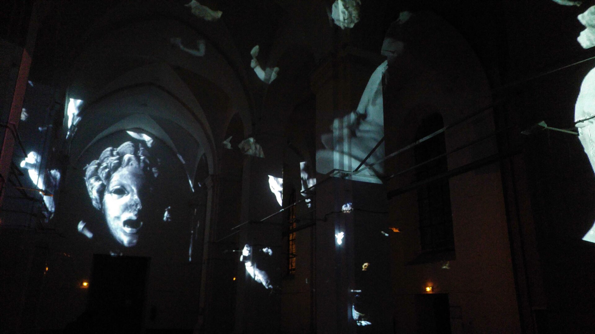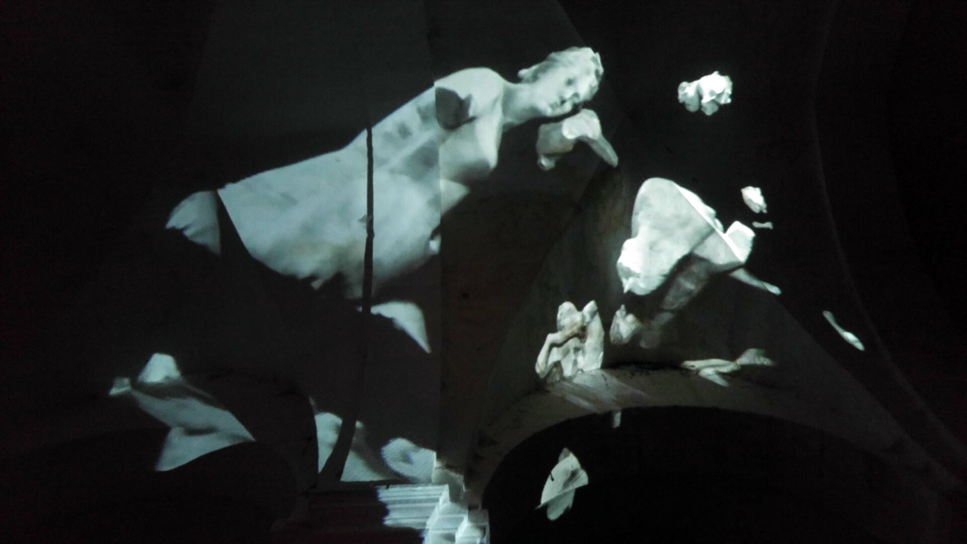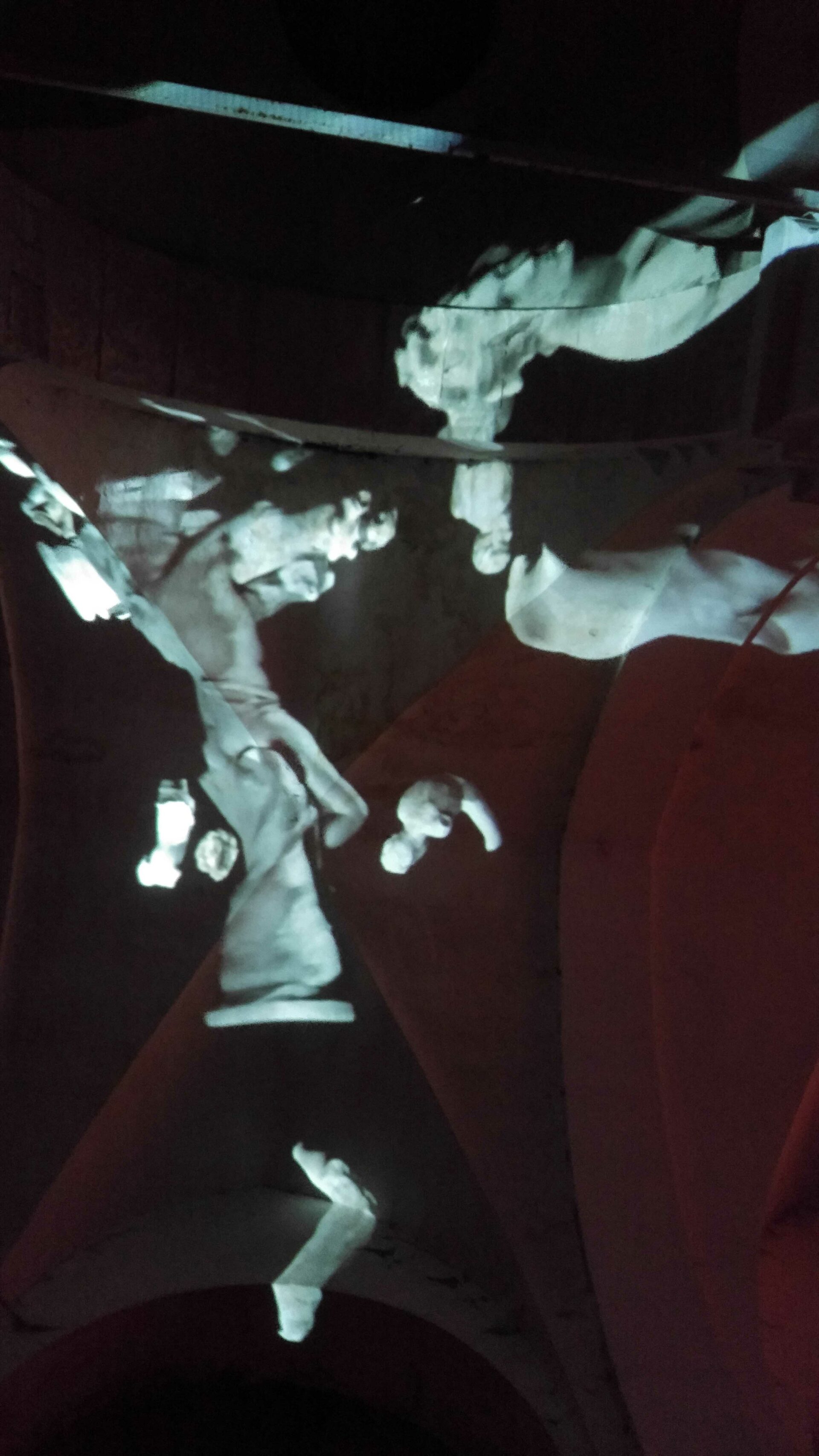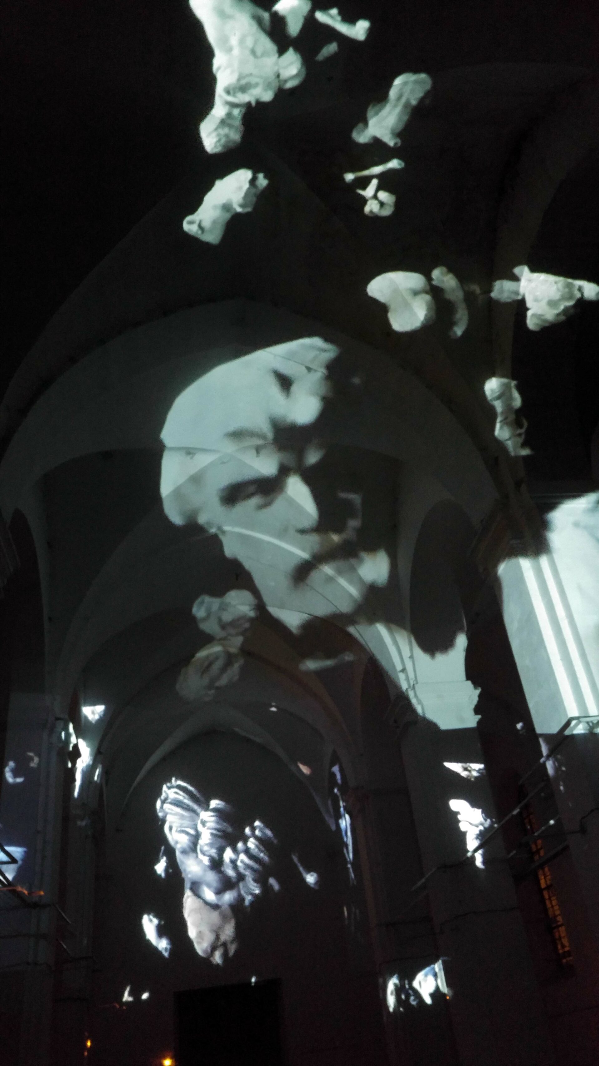 L’idée de ce projet est simple : transformer en corps célestes les différents plâtres du Paradis de Sommevoire. Ici ce n’est pas une vidéo qui diffuse des objets en lévitation sur la voute, les colonnes et le mur d’entrée de l’église Saint Pierre, mais un programme générant des déplacements aléatoires en temps réel. Figure centrale de la projection, la Gorgone du paradis apparait ici géante, monumentale, tel un masque à la bouche béante. Des morceaux de corps, sortes d’astéroïdes perdus, s’entrechoquent au hasard de leur pérégrination. Durant la soirée de présentation de cette création, le public était invité à prendre une tasse de vin chaud sous les arches de l’édifice désacralisé tout en prenant le temps d’observer les mouvements de cette « voute céleste ».