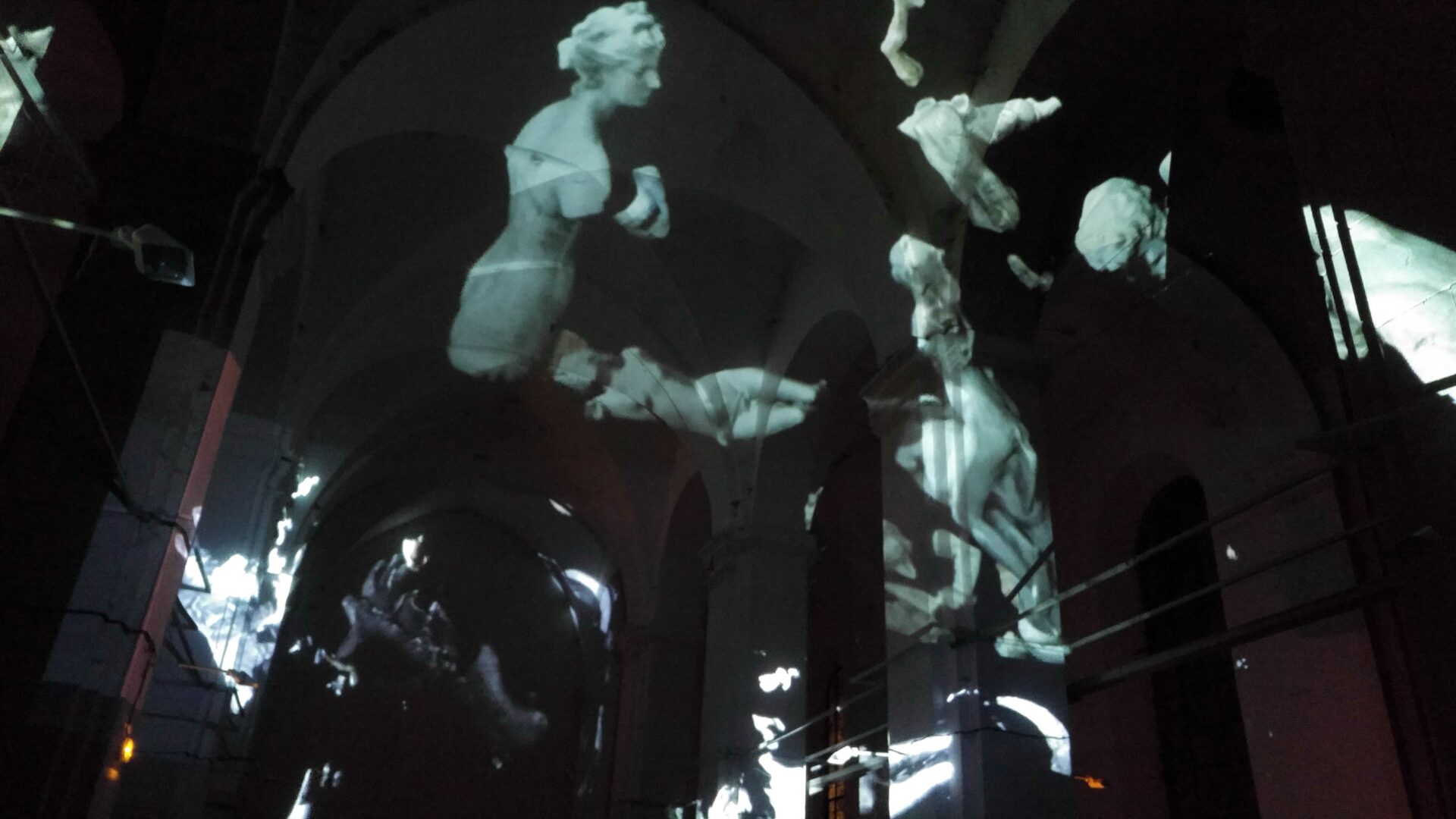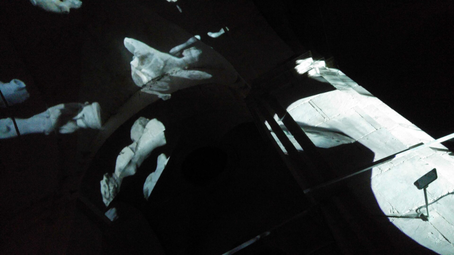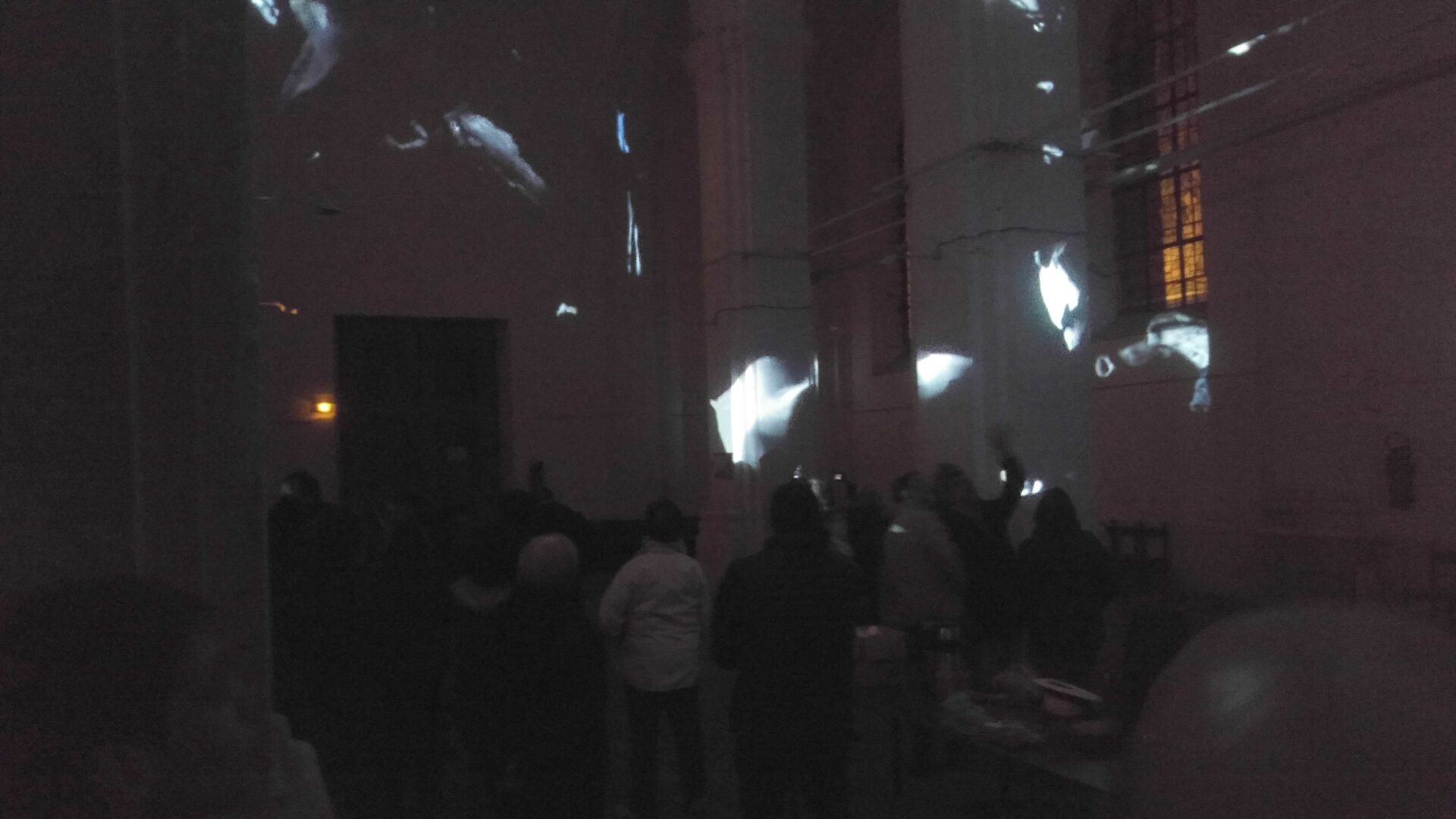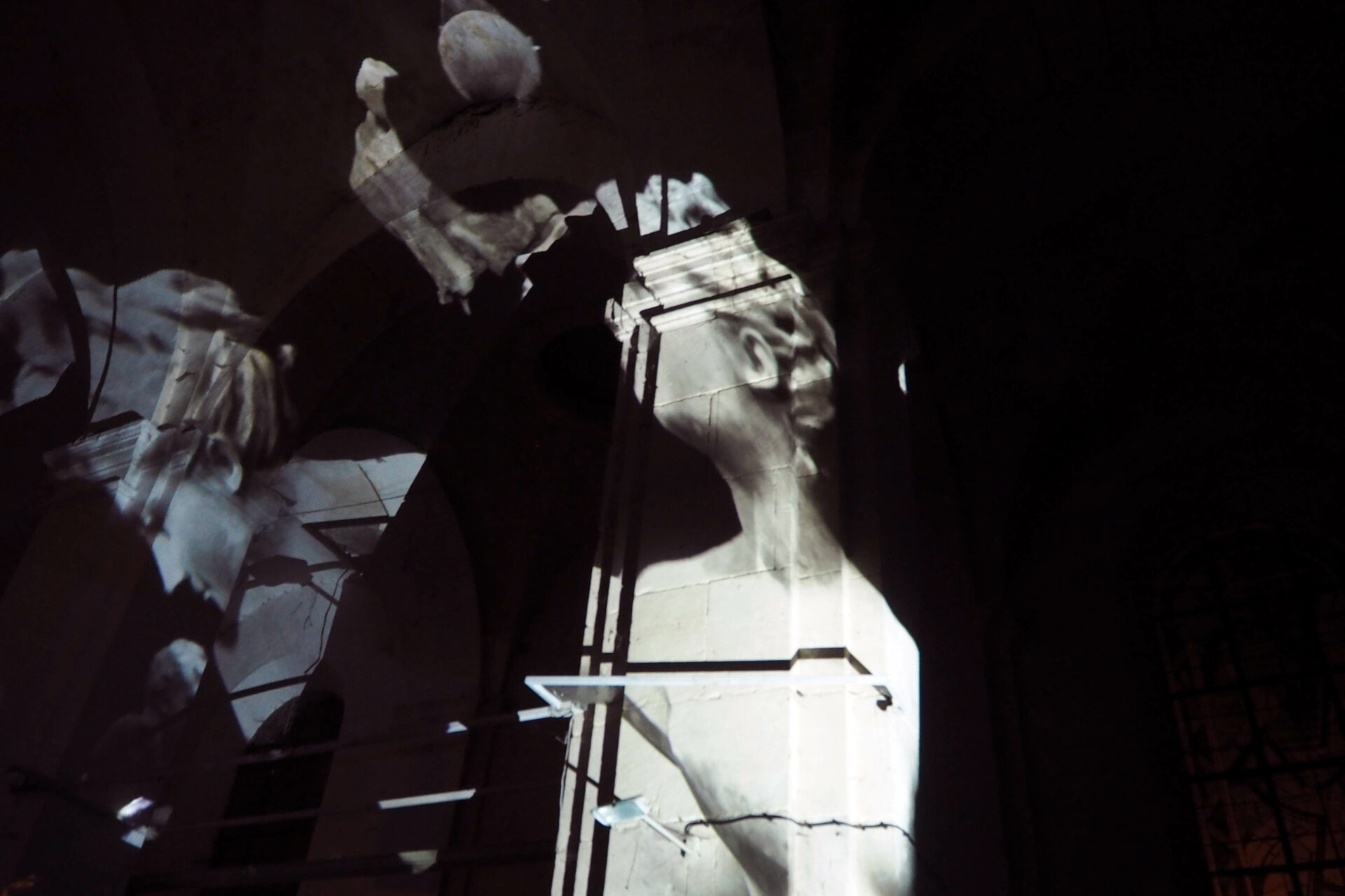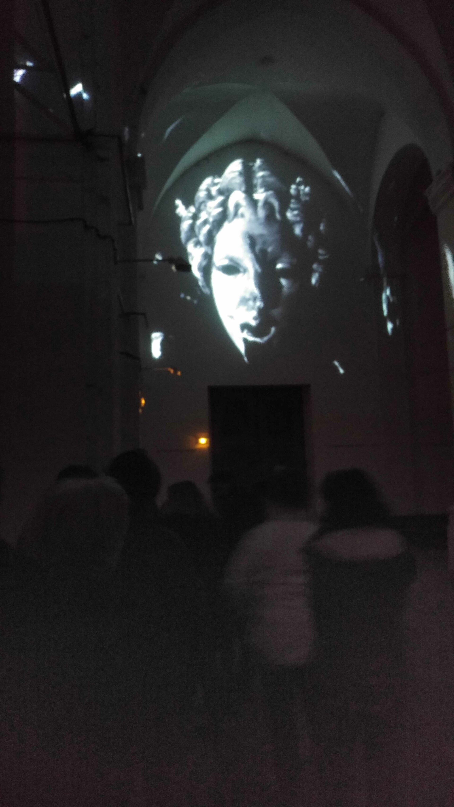 L’idée de ce projet est simple : transformer en corps célestes les différents plâtres du Paradis de Sommevoire. Ici ce n’est pas une vidéo qui diffuse des objets en lévitation sur la voute, les colonnes et le mur d’entrée de l’église Saint Pierre, mais un programme générant des déplacements aléatoires en temps réel. Figure centrale de la projection, la Gorgone du paradis apparait ici géante, monumentale, tel un masque à la bouche béante. Des morceaux de corps, sortes d’astéroïdes perdus, s’entrechoquent au hasard de leur pérégrination. Durant la soirée de présentation de cette création, le public était invité à prendre une tasse de vin chaud sous les arches de l’édifice désacralisé tout en prenant le temps d’observer les mouvements de cette « voute céleste ».