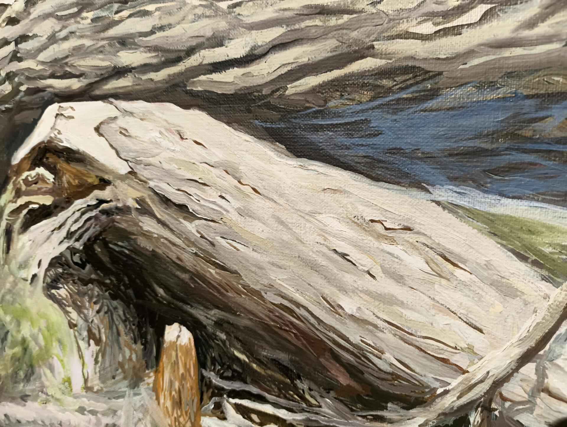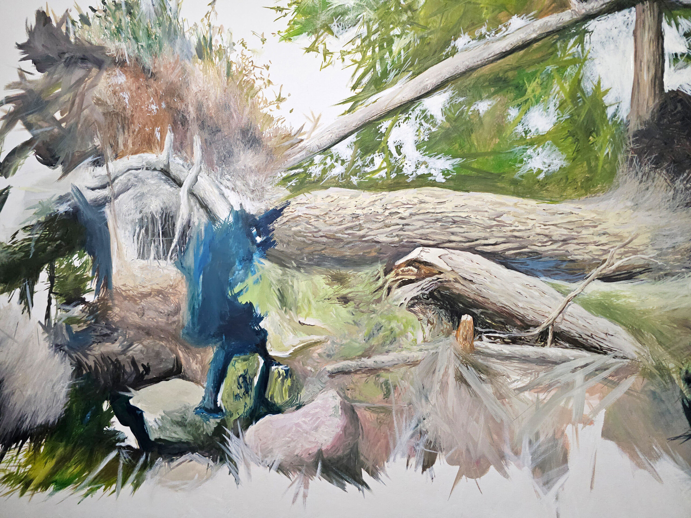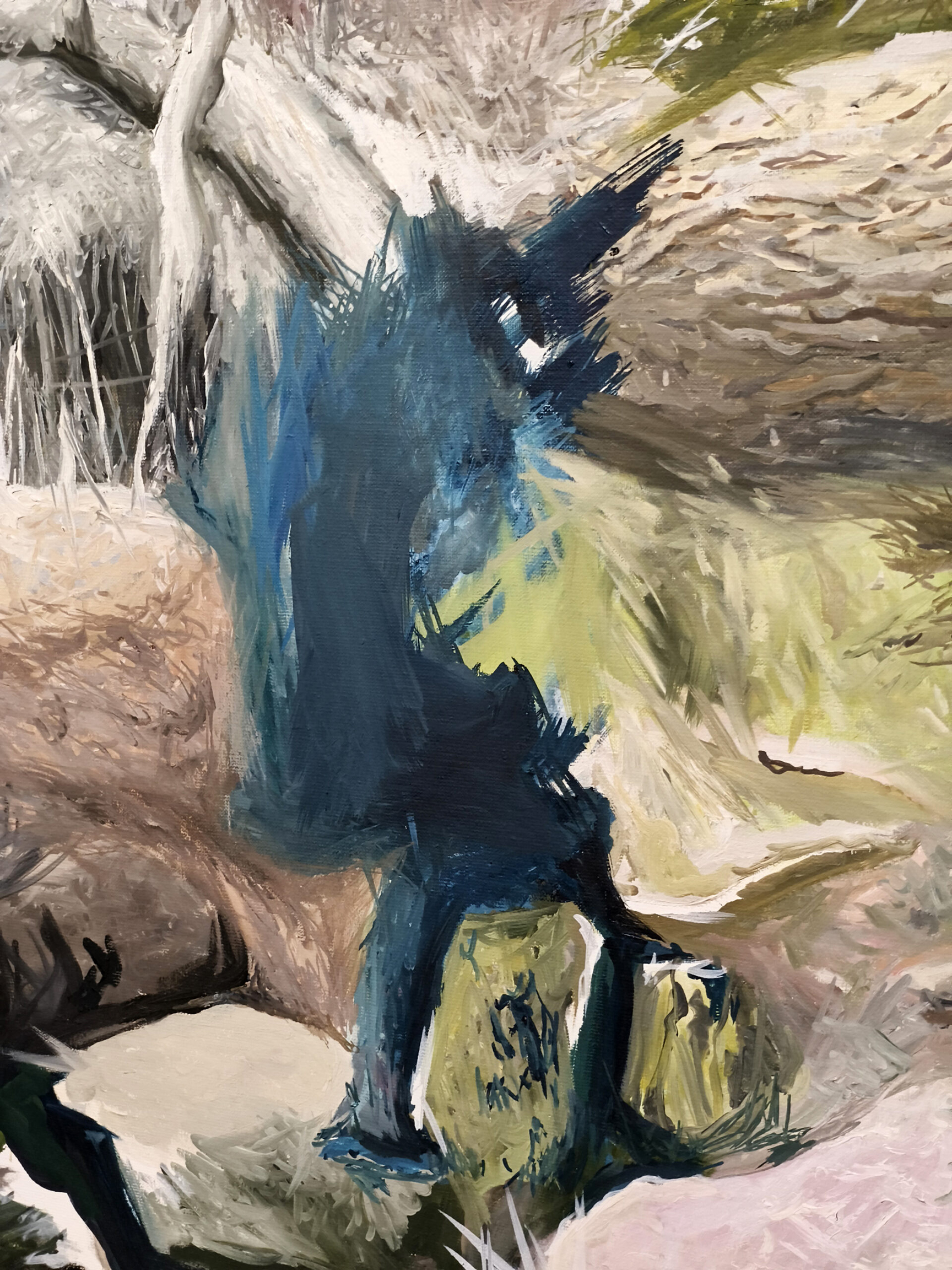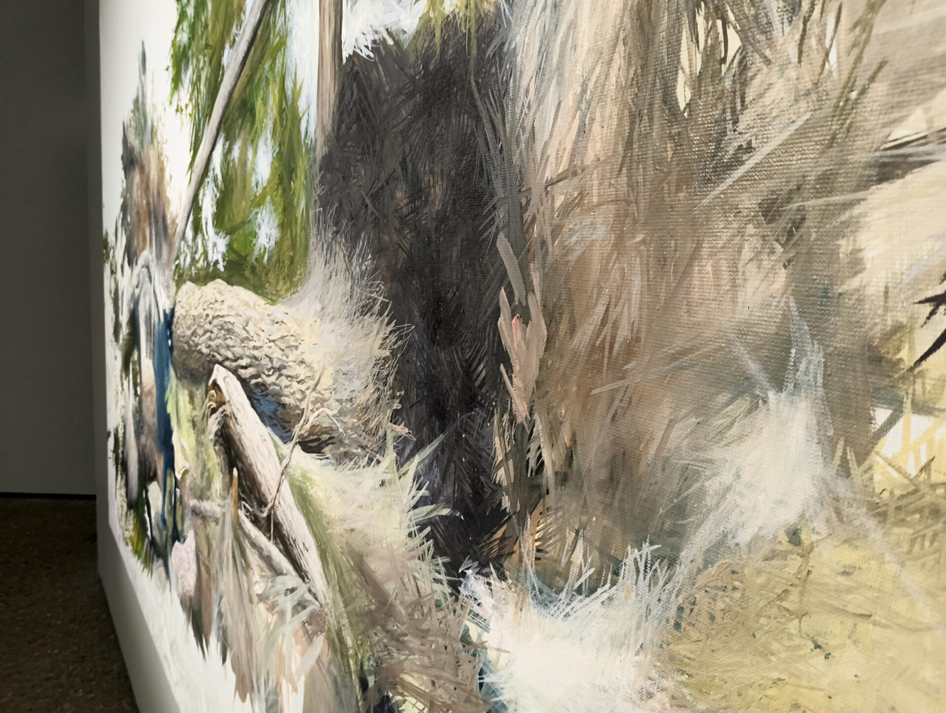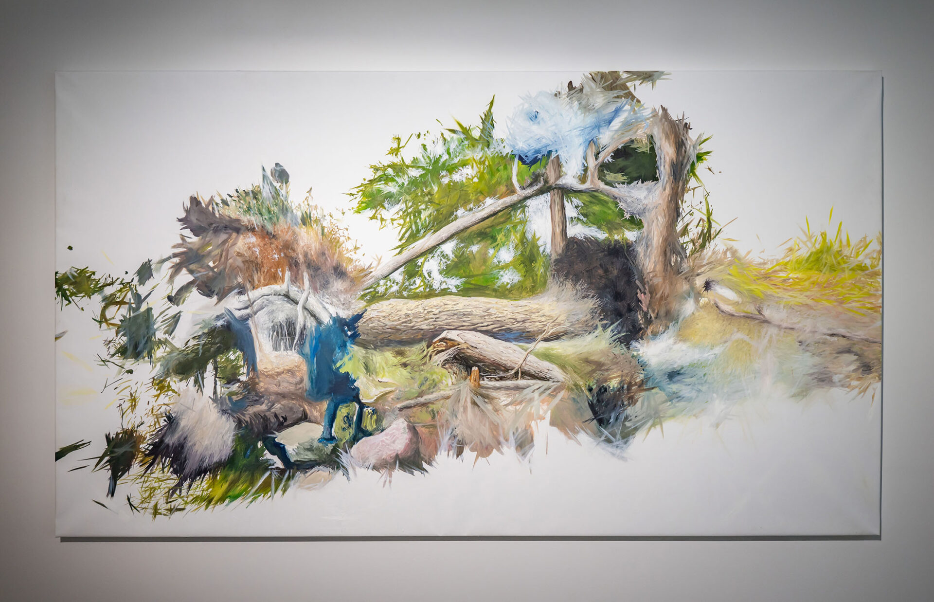 Cette peinture referme le cycle de création de la résidence à la galerie du Dourven, non comme le désir d’un retour à des techniques traditionnelles, mais dans l’optique de se confronter à une nouvelle physicalité. Le pinceau reprend là où la vidéo, la photographie et la photogrammétrie s’arrêtent. Ce dernier geste, lent et manuel, n’efface pas le numérique : il le digère et le poursuit.