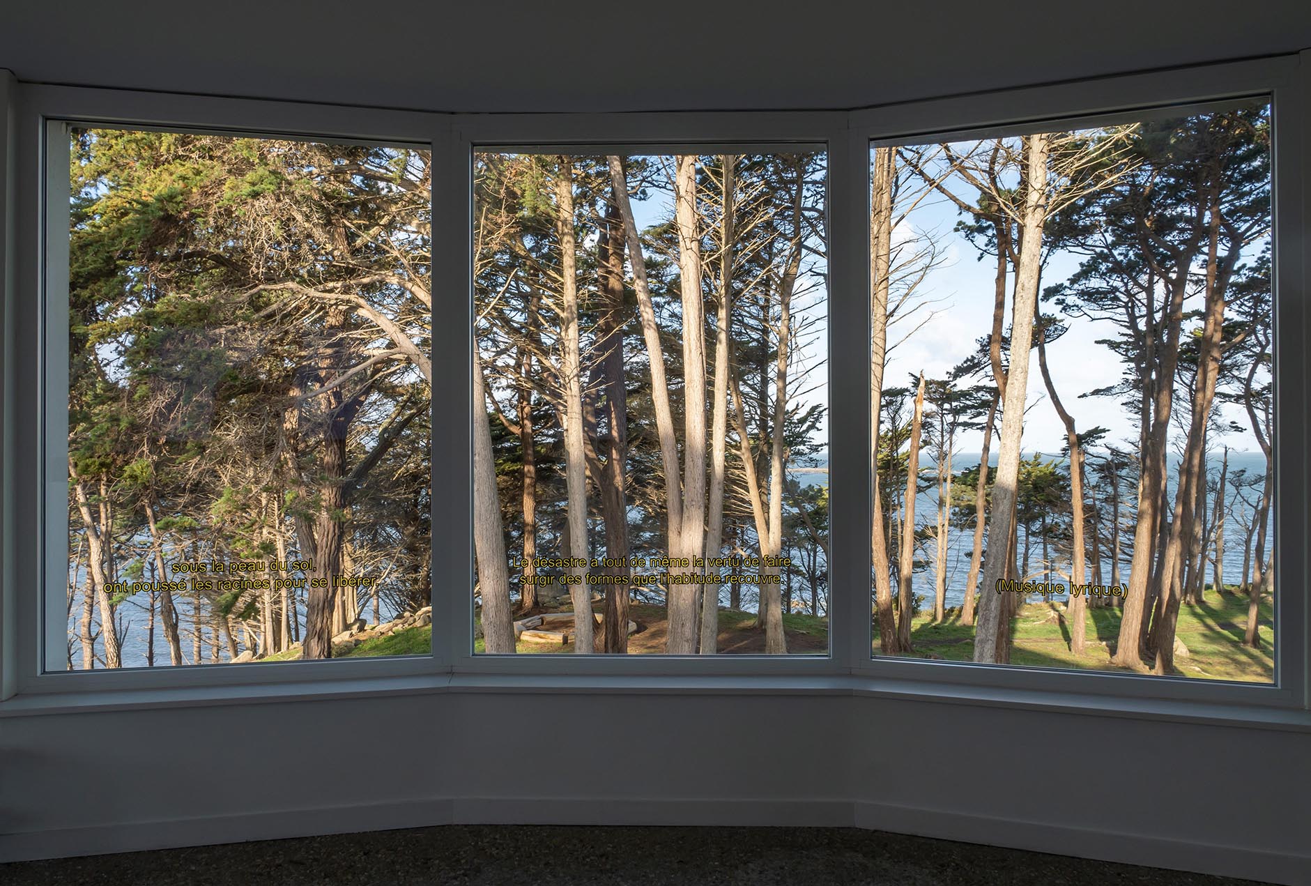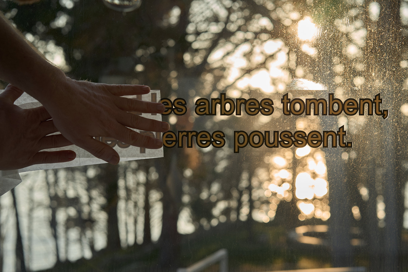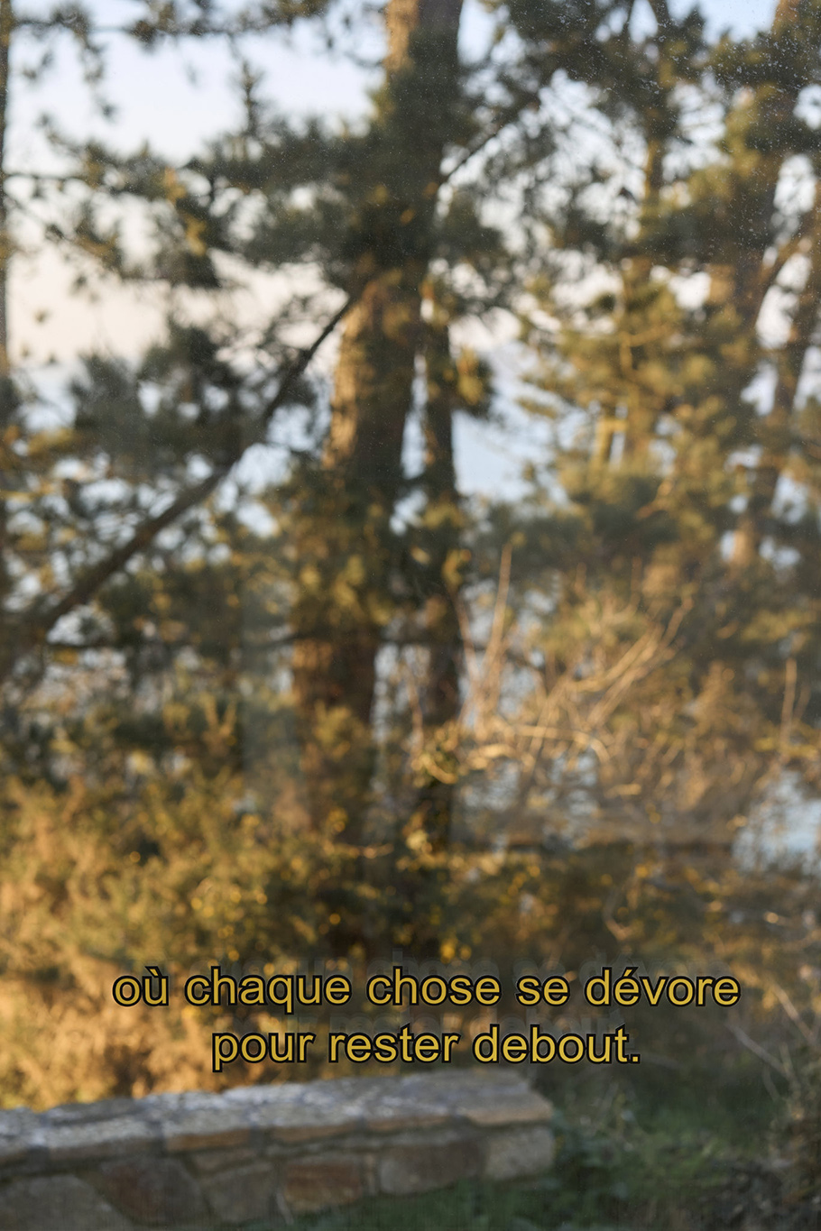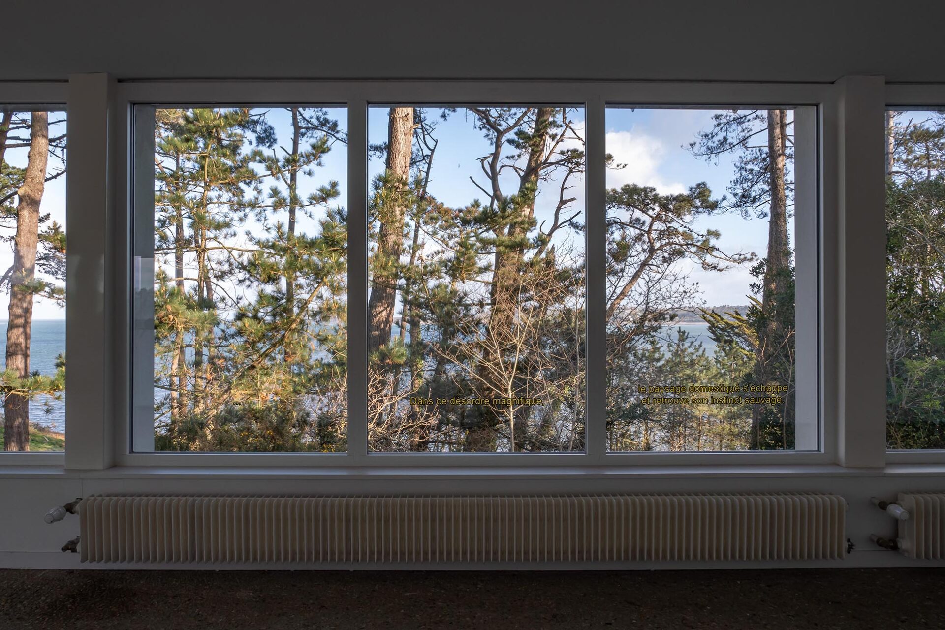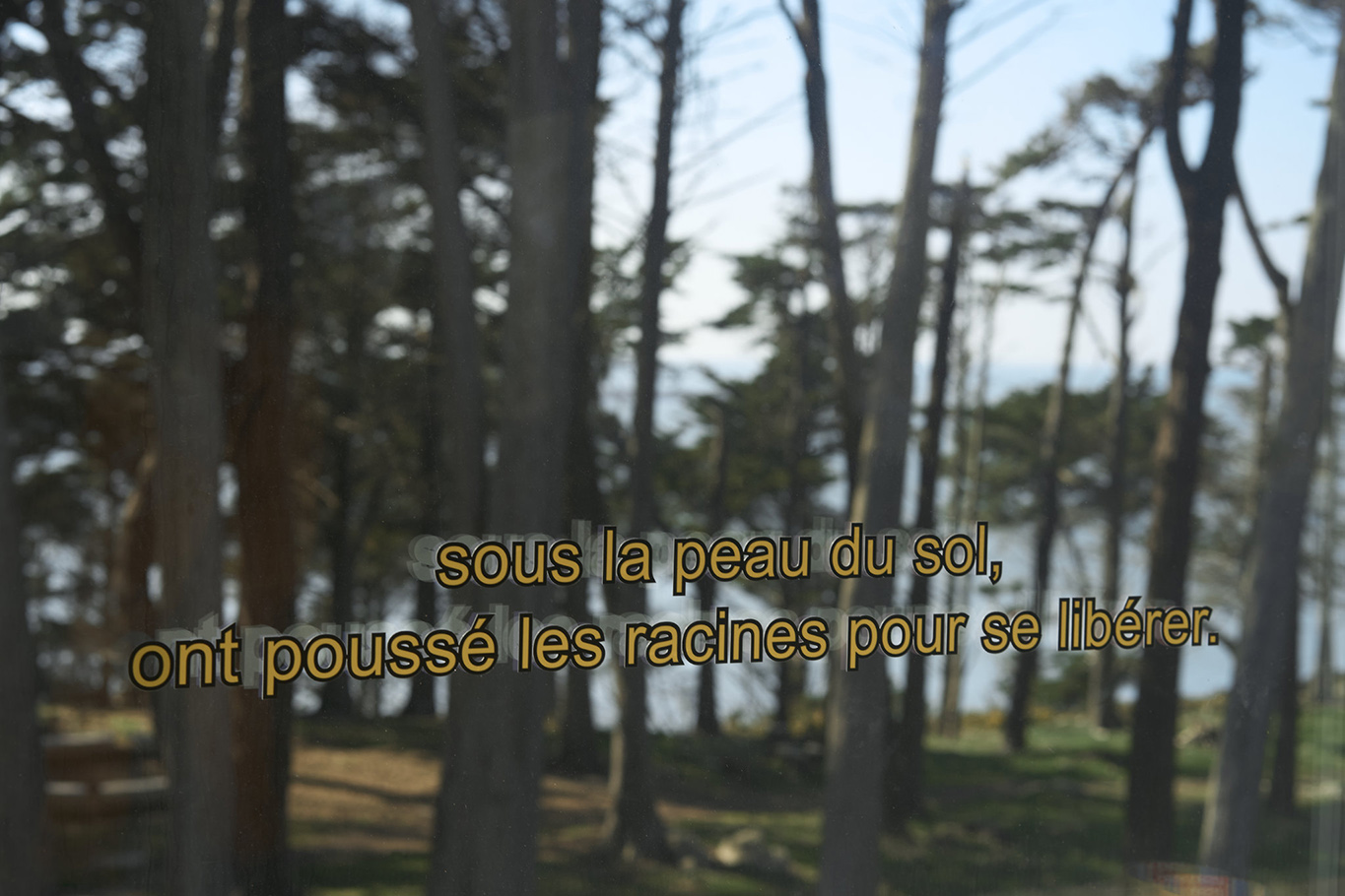 Réflexion lyrique sur la découverte et le ressenti des artistes vis-à-vis du domaine du Dourven, ce dialogue s’inspire de leurs références (Guillevic, Herzog, Cocteau, Daumal,…) Présentés sous forme de sous-titres collés à même les vitres, ces textes transforment chaque fenêtre de la galerie en un écran qui dévoile un paysage cinématographique.