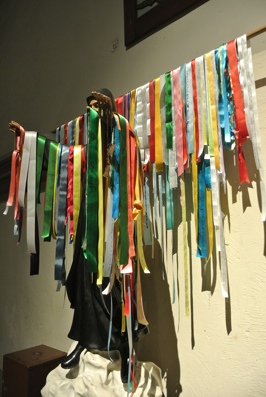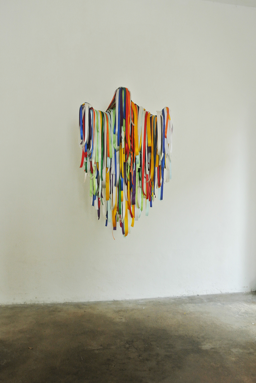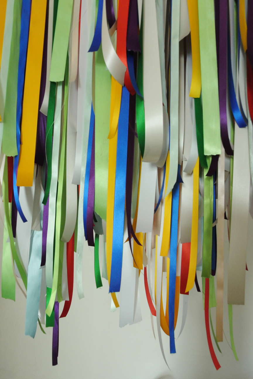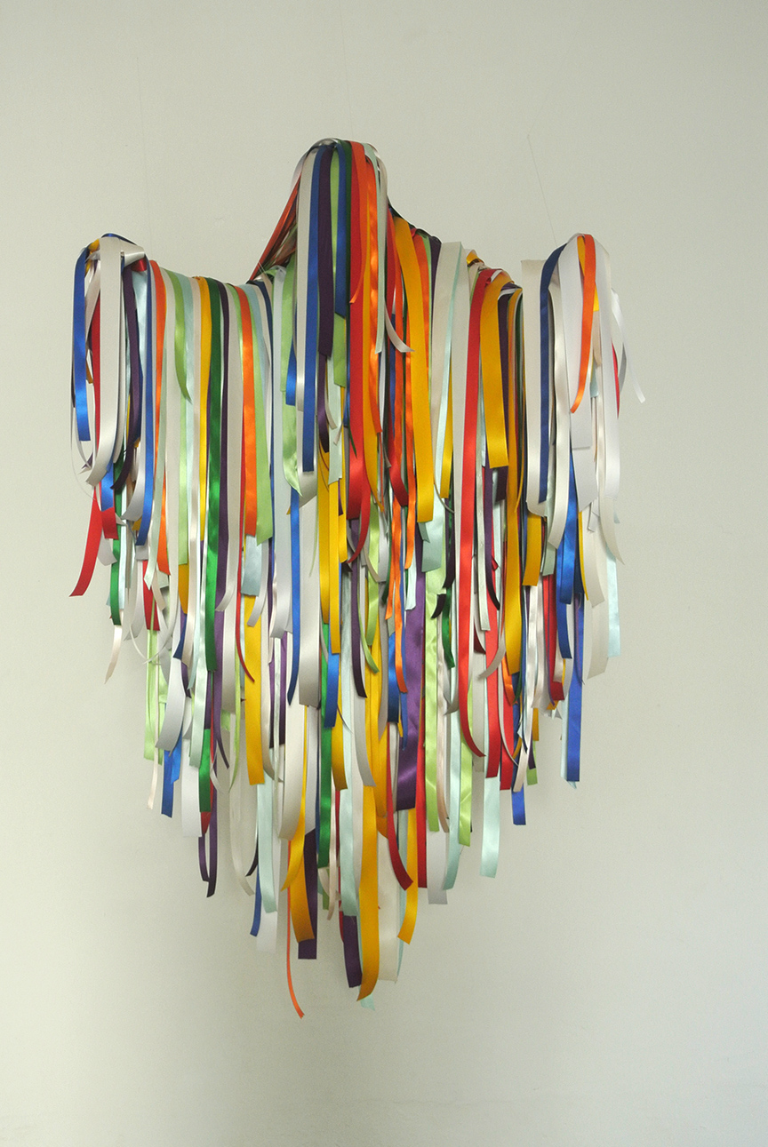 À travers cette installation j’imagine un rituel qui s’emballe, une frénésie de rubans semblables à des prières. Cette multitude révèle une silhouette fantomatique, non pas comme un présence qui hante la nuit mais plutôt comme un spectre surchargé de couleurs.