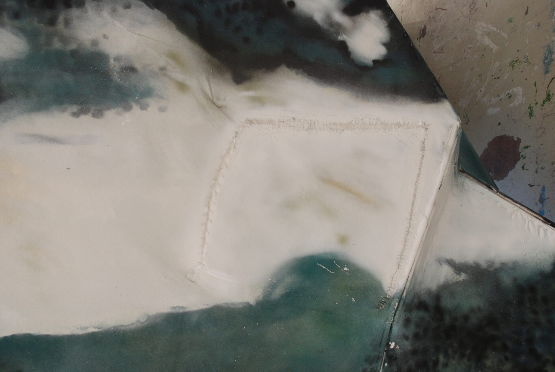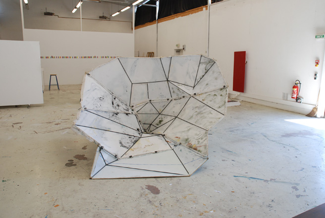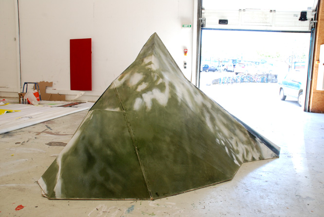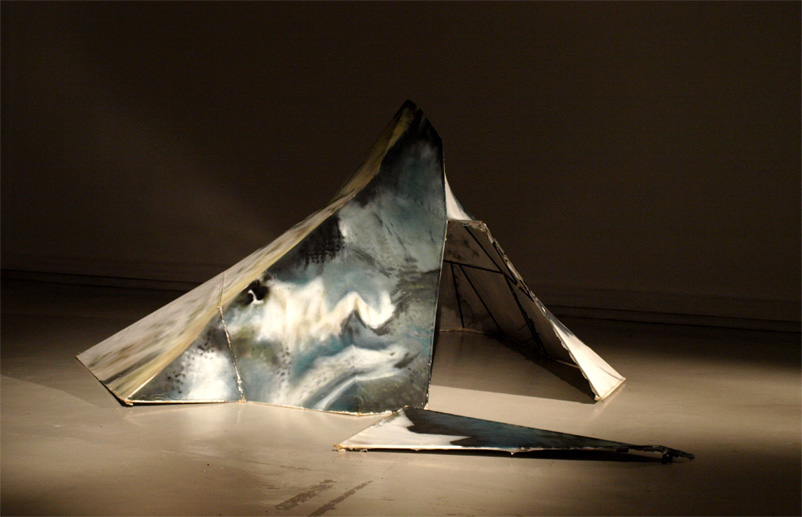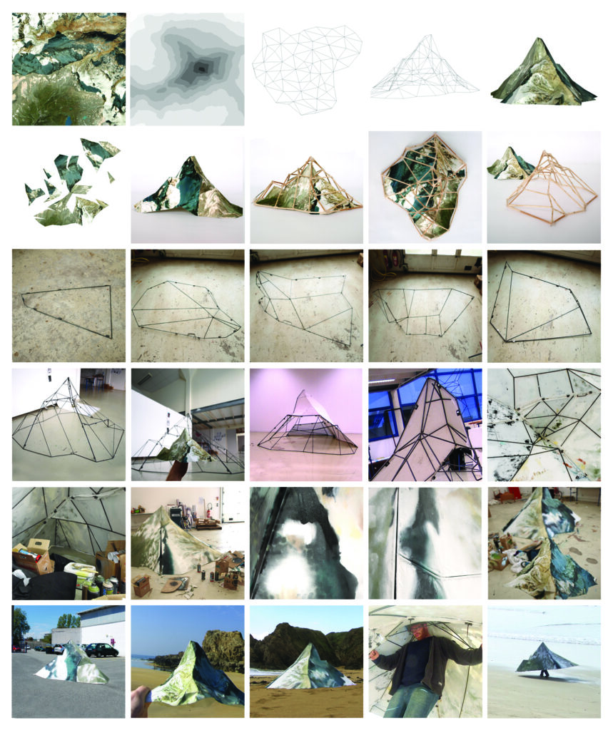 Travailler avec un motif : celui d’une montagne . Une modélisation en 3D du Mont Cervin est extraite de GoogleEarth. L’objet 3D, une fois simplifié, conserve son statut de représentation tout en affirmant clairement ses origines virtuelles. Il devient une sorte d’outil d’expérimentation et d’exploration des notions de réel/virtuel et du rapport regardeur/paysage. Avec cette sculpture, l’objet virtuel se voit «matérialisé» dans le réel. Il échappe à l’espace de l’écran, au monde numérique, maîtrisé et programmé, le voila qui s’use, se déchire, se casse et se raccommode. La matière de l’image informatique (compression, format d’enregistrement, résolution, etc) devient sujet de peinture.