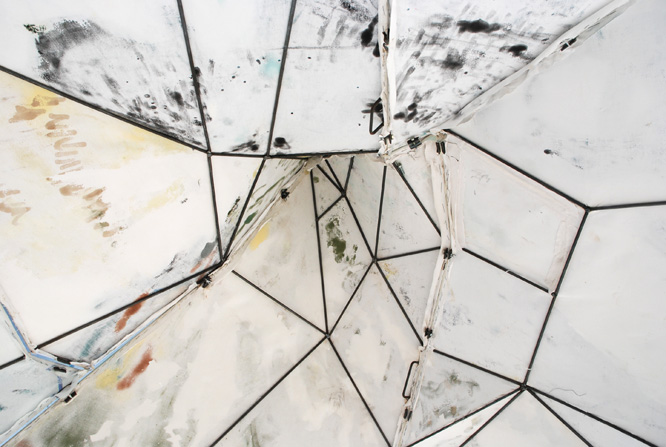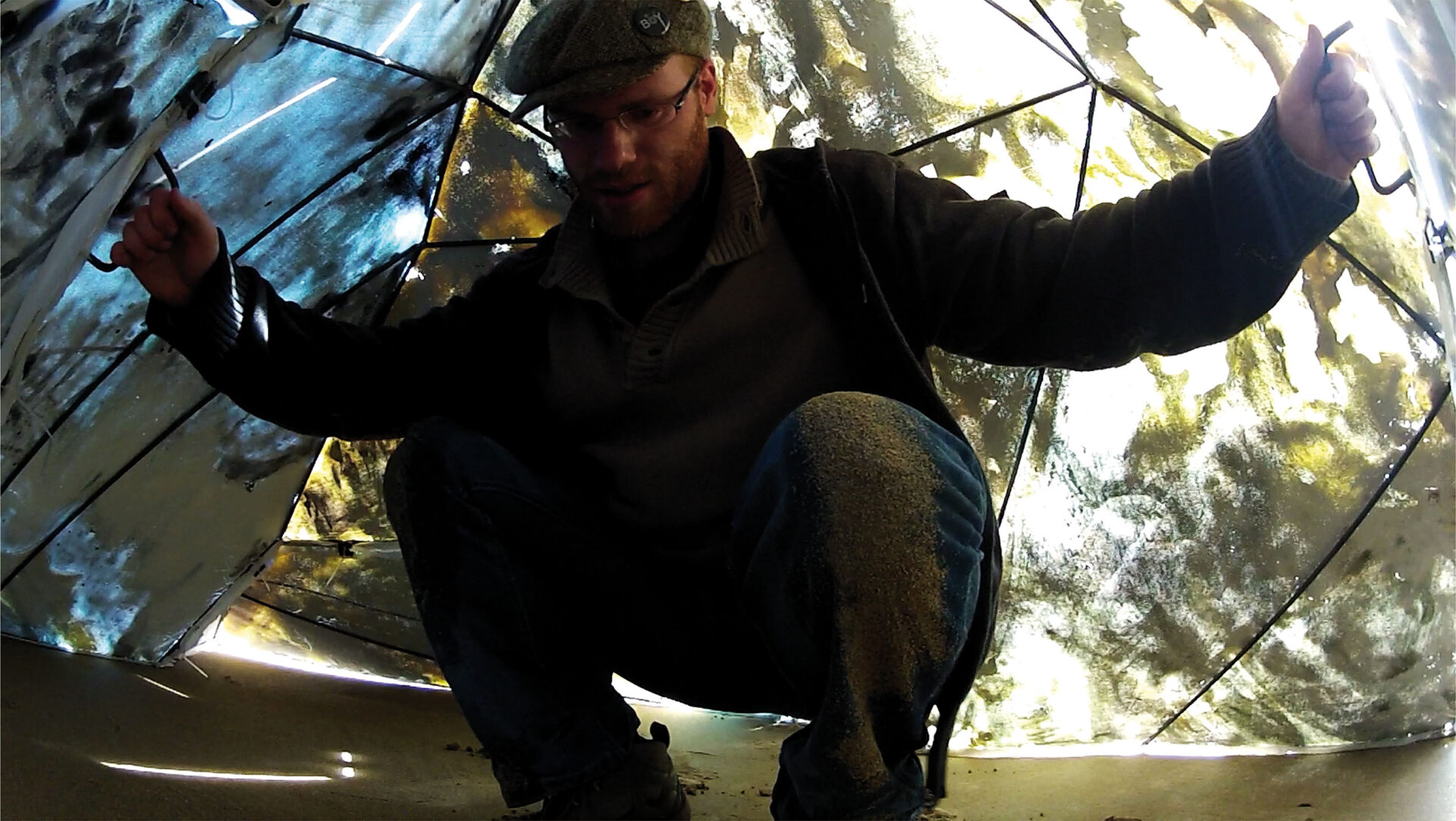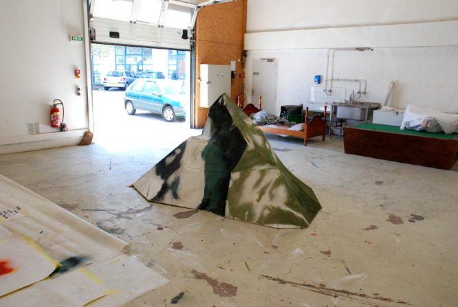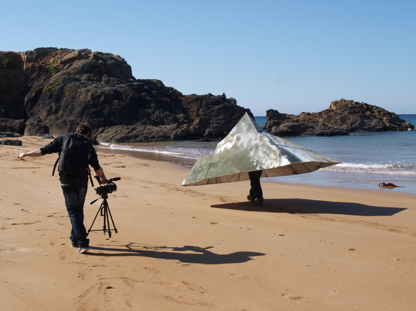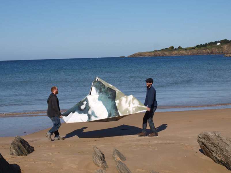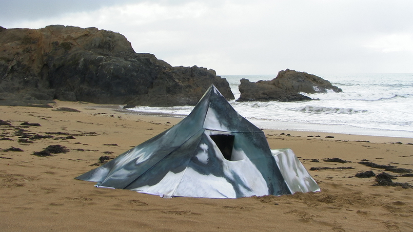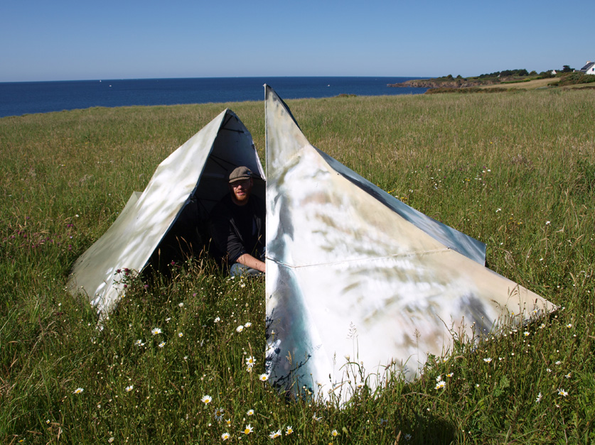 Un châssis mobile, démontable et remontable comme une toile de tente. Tout au long de sa progression dans la vidéo qui enregistre sa pérégrination, cette structure devient tour à tour costume, châssis, totem, objet de dissimulation grotesque… Une sorte « d’anti-camouflage » mais qui s’affirme en tant que désir de fusion avec le paysage.