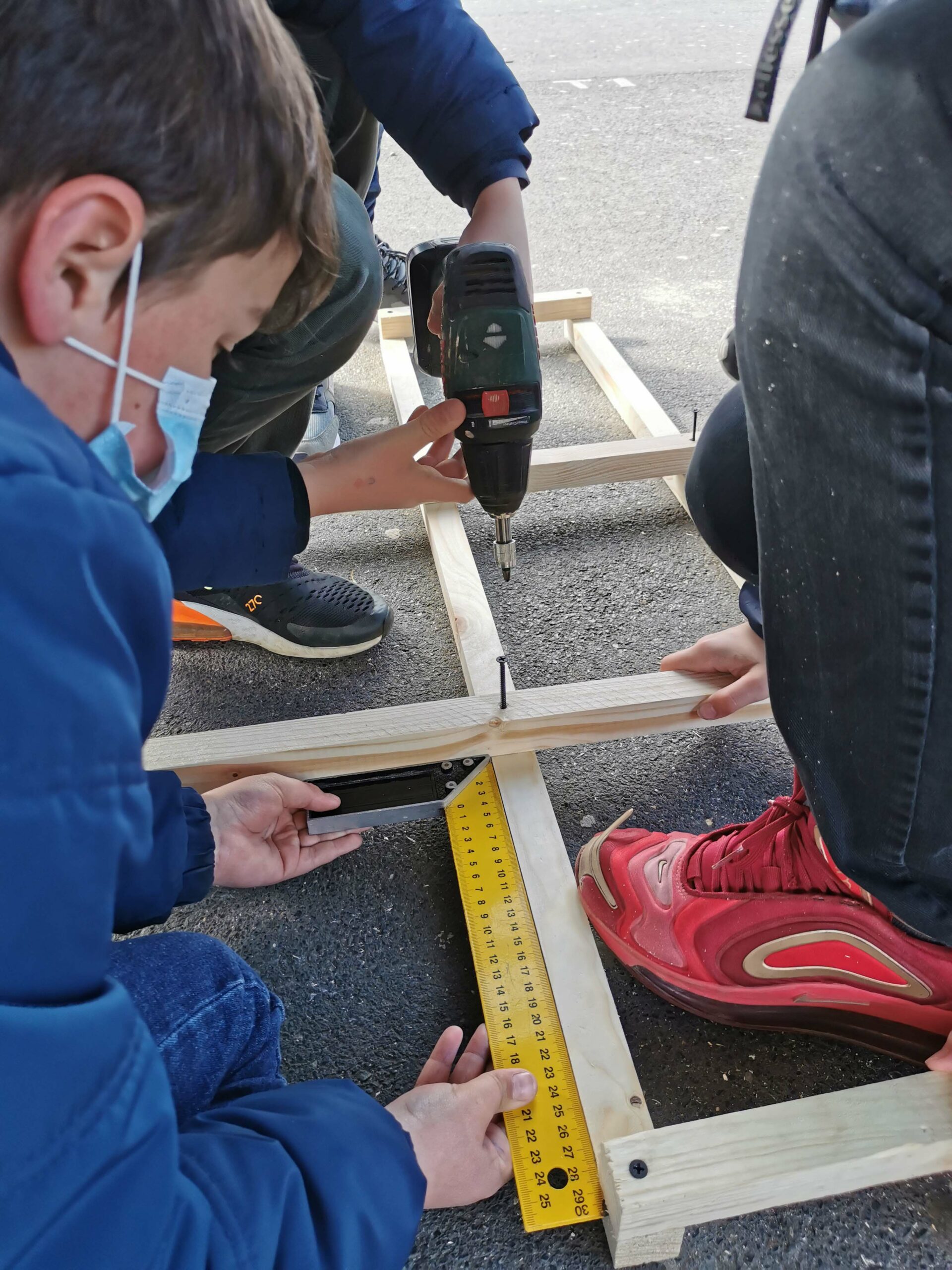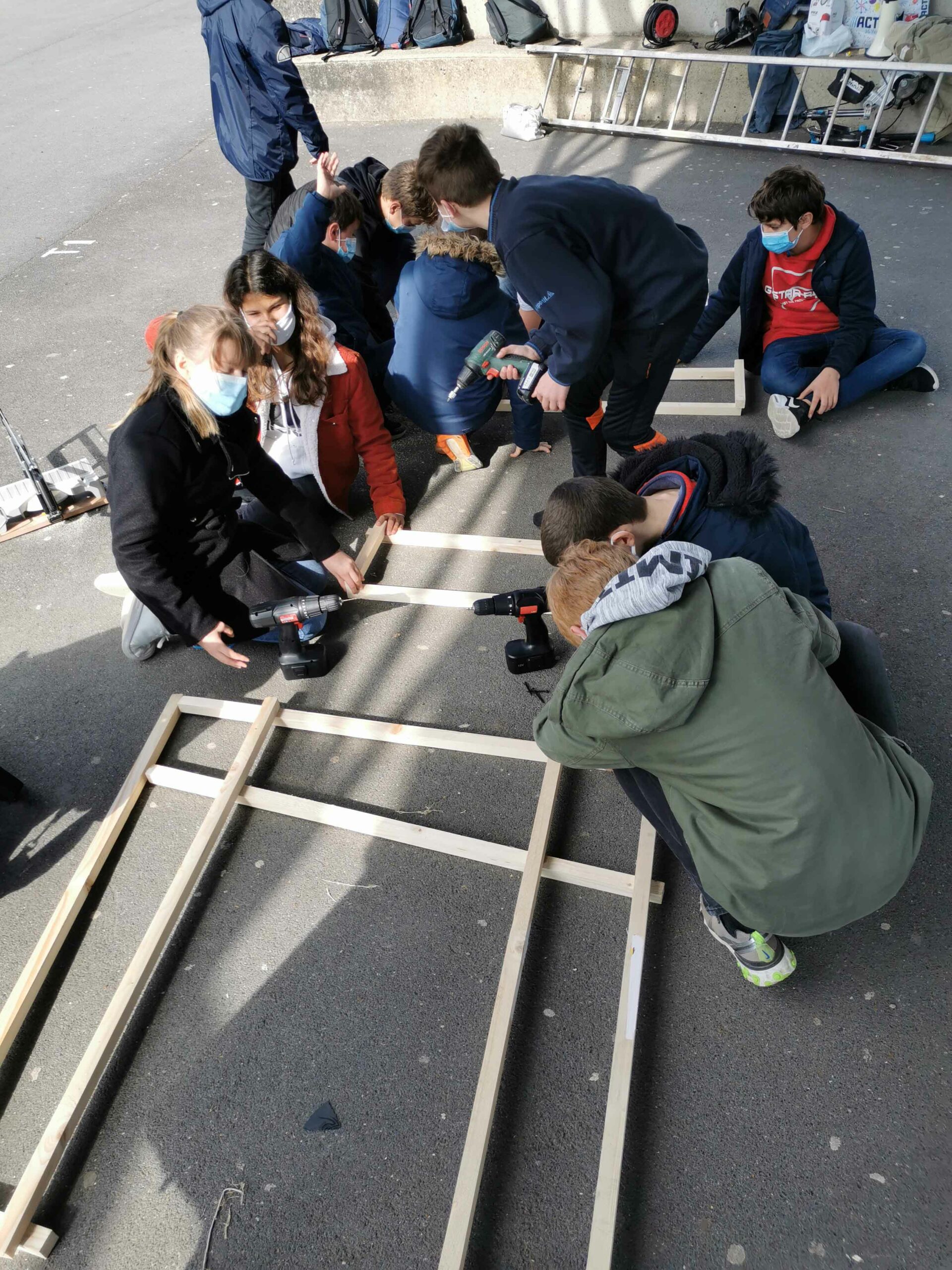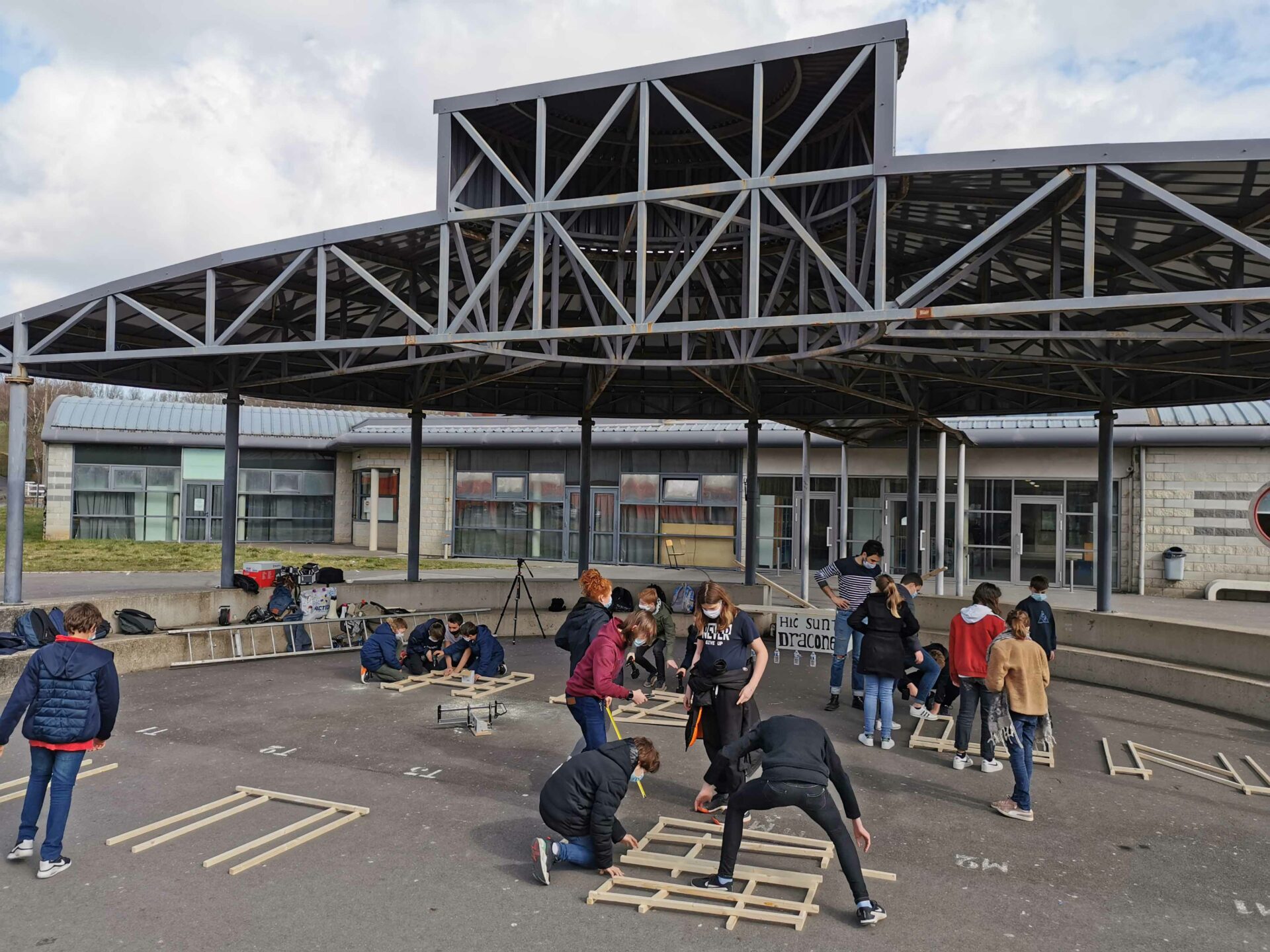 Très vite, l’intention est fixée, le cadre annoncé, soutenu par les enseignantes et la direction de l’établissement. Pour réaliser cette performance, l’implication de tous les élèves, des familles, des acteurs locaux et de la communauté éducative aura été nécessaire. Durant 4 mois, plusieurs moments et rencontres se succèdent : harangue d’ouverture au chantier à venir, travail de recherche et de documentation cartographiques, collecte des matériaux nécessaires, chantier de construction des lettres, déambulation collective et documentation vidéo, et enfin, la réalisation du court-métrage, témoin de l’expérience vécue avec les élèves.