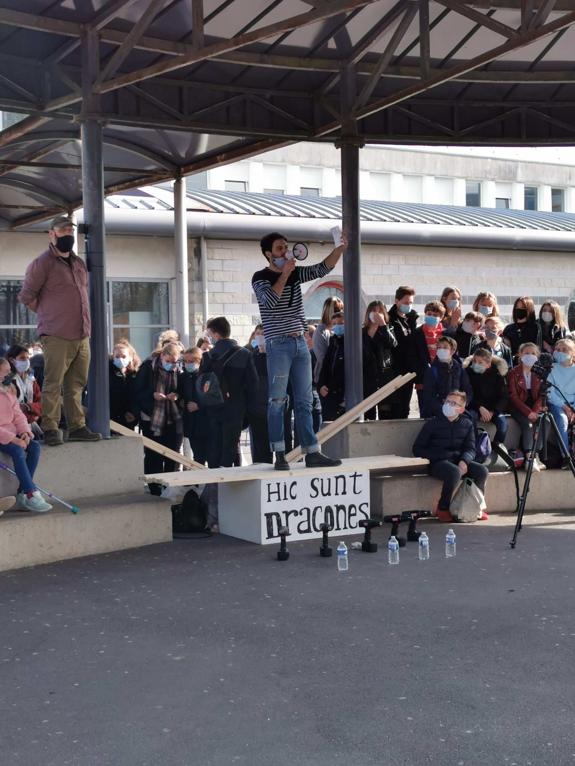 Printemps 2021, un artiste et un géographe organisent, avec le concours de 632 collégiens, une performance à la fois éphémère et monumentale visant à inscrire la carte dans le territoire. L’action, telle qu’elle a été documentée par des photographies et des vidéos, se veut le témoin de la relation dynamique, et réciproque, entre la réalité du territoire et la représentation que l’on en a. Partant, si la carte n’est pas le territoire selon la formule largement rebattue, elle n’en est pas pour autant qu’une pure abstraction mathématique, mais bien l’échelle qui nous relie concrètement au territoire. C’est à partir de ces premières considérations que s’est orientée la performance artistique et cartographique Hic sunt Dracones.