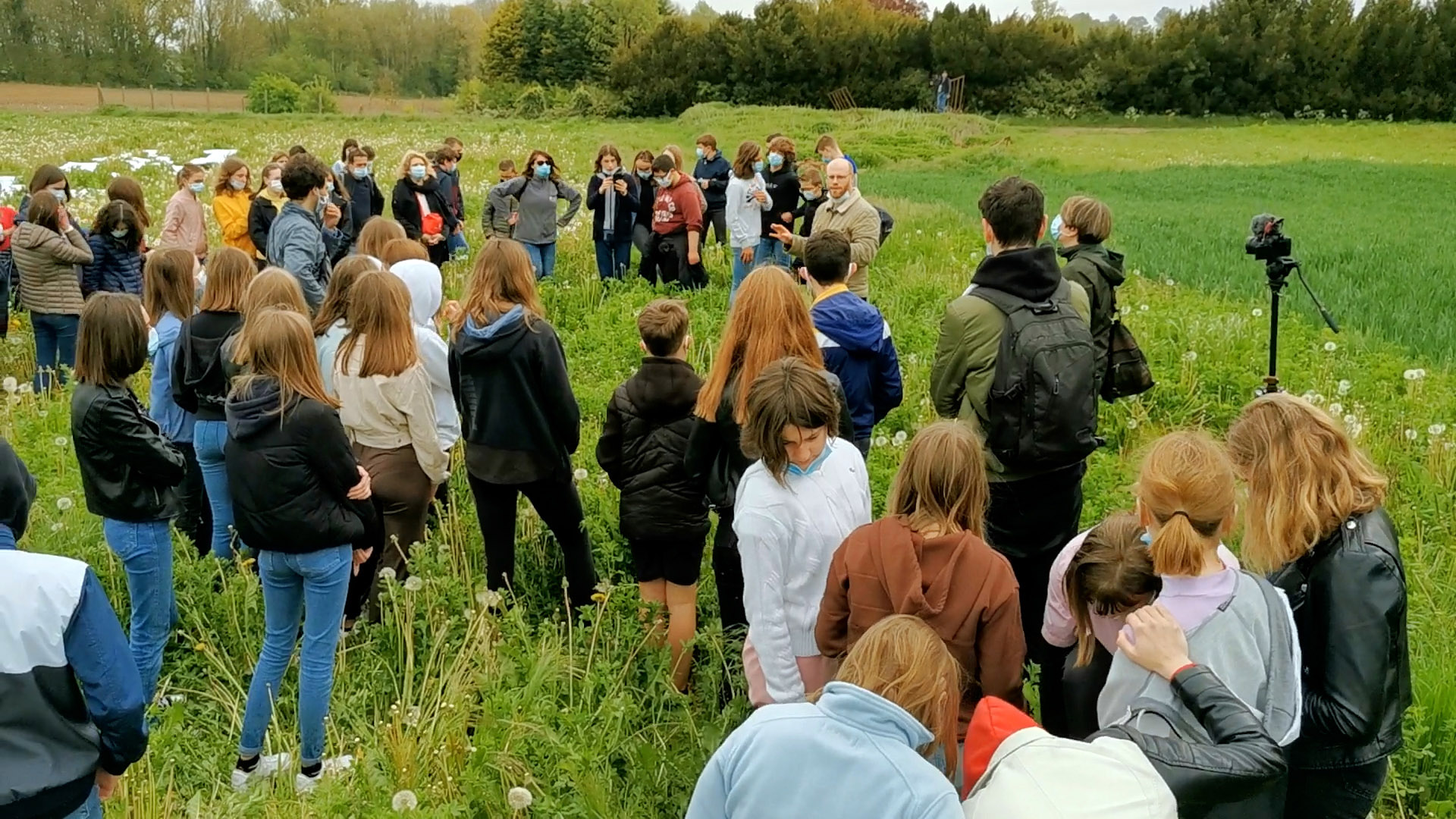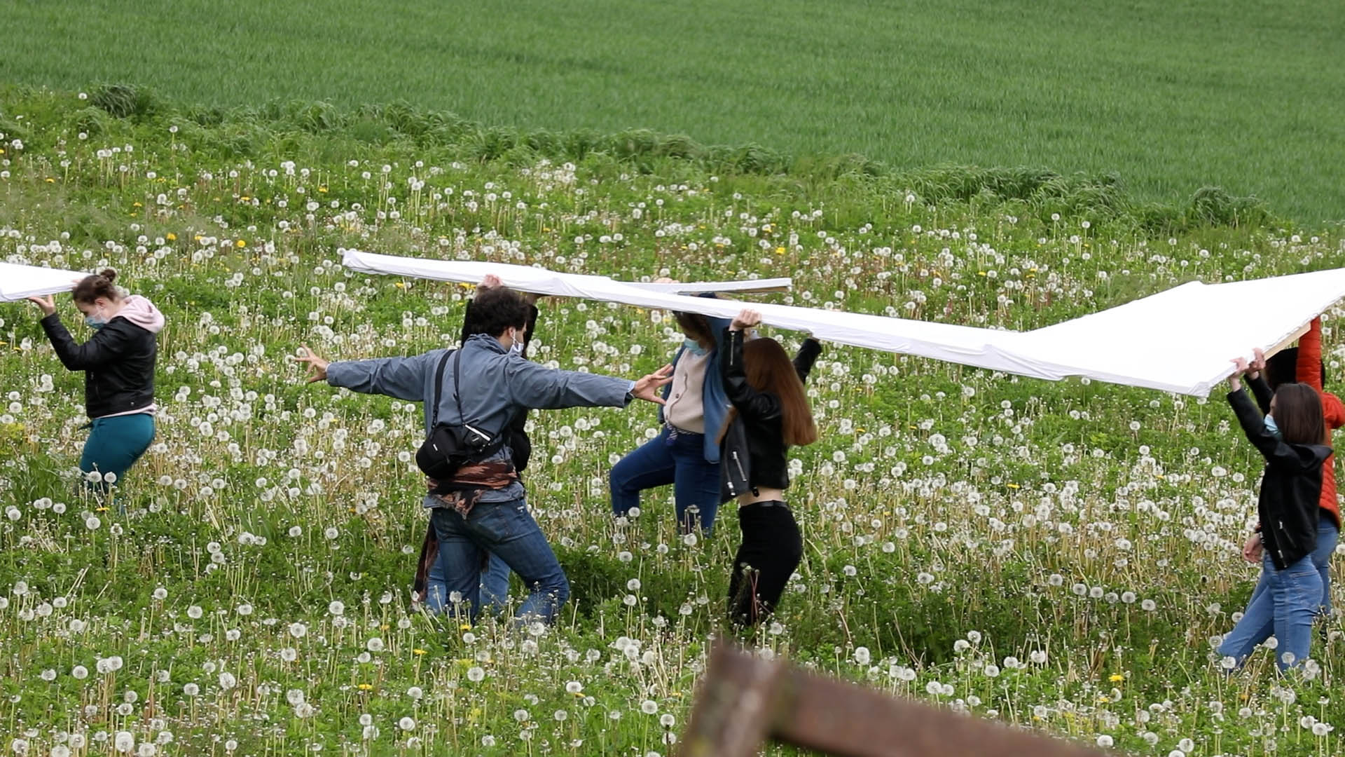 632 élèves d’un collège de campagne traversent le territoire en soulevant des lettres monumentales. En mouvement dans le paysage, ces lettres forment la locution cartographique Hic sunt dracones. Considérant l’idée selon laquelle la carte n’est pas le territoire, les élèves contribuent ici à en tester l’hypothèse inverse de manière concrète et collective. Et si la carte pouvait imprimer le territoire le temps d’une performance monumentale ?
