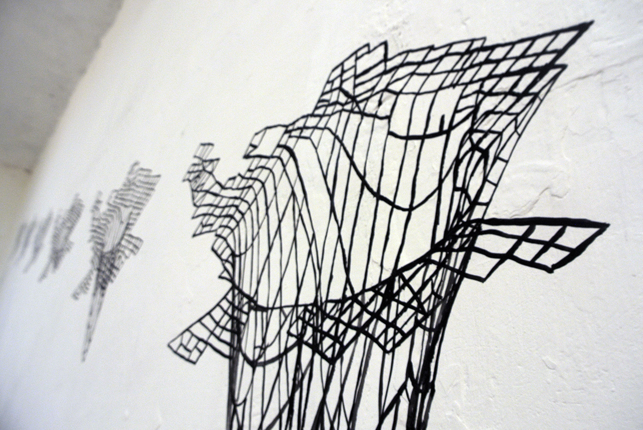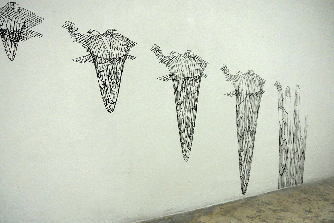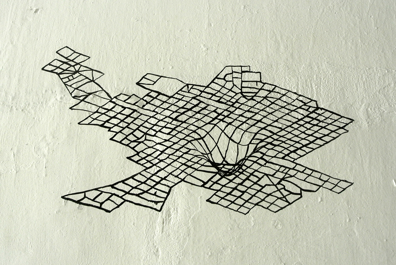 Le Yucatán est un pays plat, cependant ses habitants ont toujours eu une relation de «verticalité» avec la terre : celle de l’inframonde. Ici ce lieu a bien une existence physique car le territoire doit se concevoir sur plusieurs plans dont les «cénotes» sont les interfaces. Ce concept d’interfaces est aussi présent dans le monde informatique souvent représenté par la grille virtuelle. Si l’on regarde Mérida vue du ciel, c’est bien une multitude de grilles qui nous apparait. c’est le centre de Mérida qui s’effondre sur lui-même. Cela peut-être abordé comme une cartographie virtuelle de ma propre connaissance du centre de la ville, grandissant au fur et à mesure de la résidence. Elle peut aussi représenter ce désir de connexion du monde des hommes avec l’inframonde, peut-être jusqu’à la dissolution et la fusion de l’un dans l’autre.