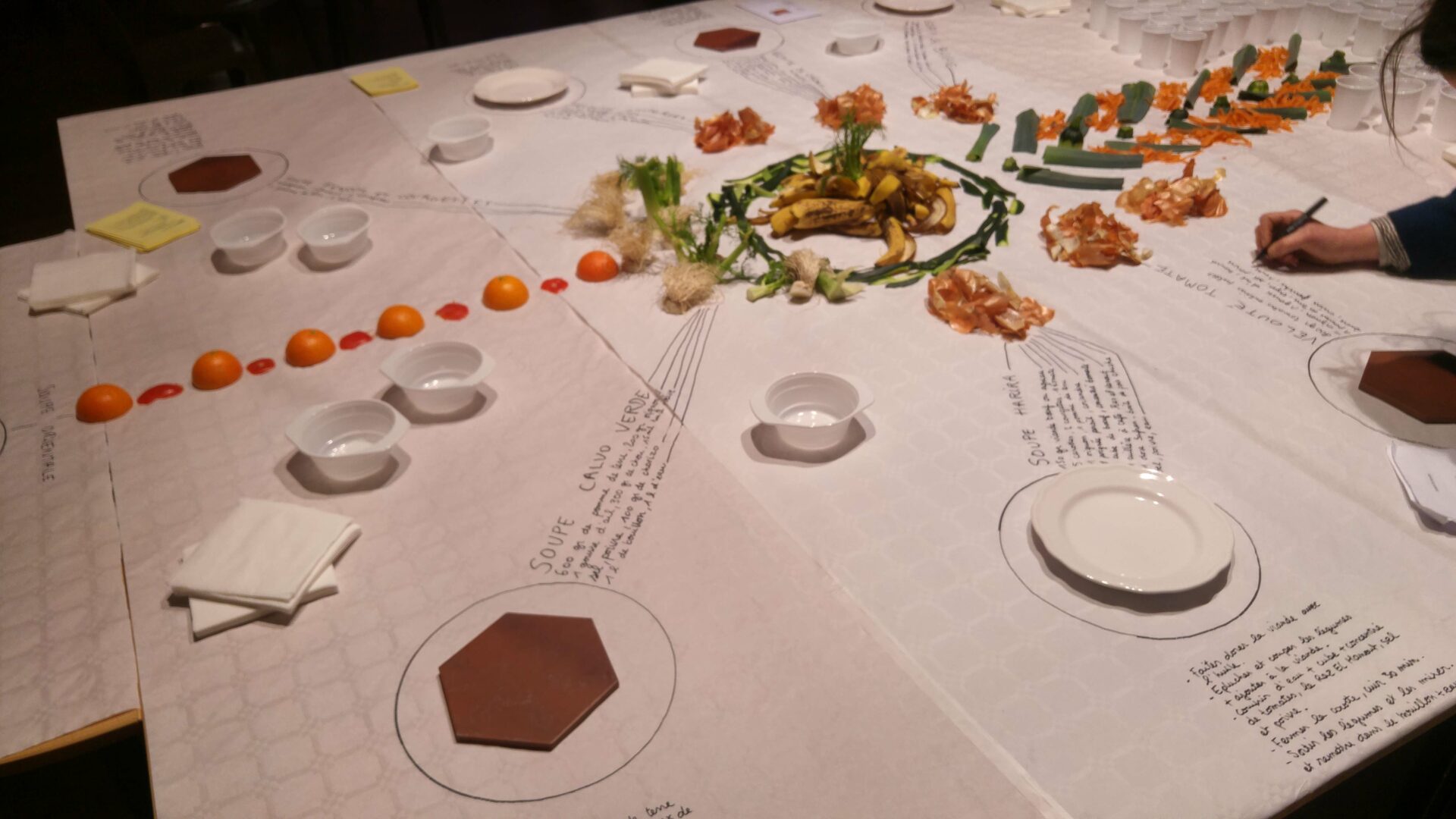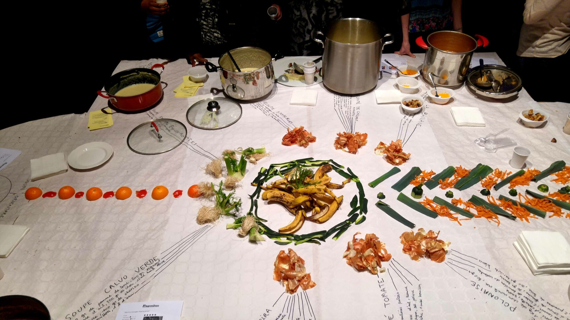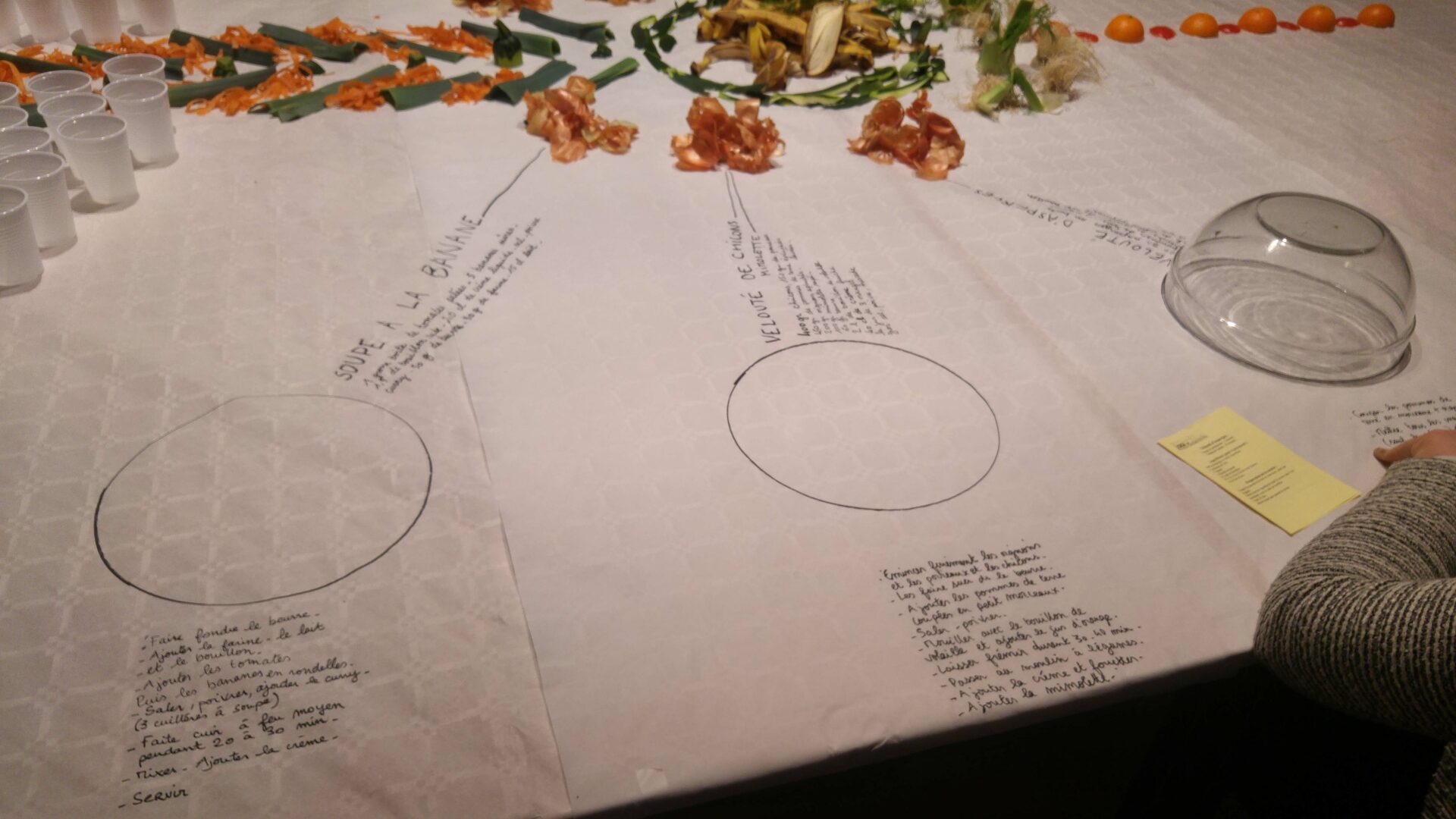 Pour cette édition 2017 les artistes de C.LE.A ont décidés de mettre en scène l’espace de l’événement et en offrir ainsi une nouvelle vision. Cette fois-ci la table est devenu support de compositions faites d’épluchures des différents fruits et légumes ayant servis à l’élaboration des soupes. Puis les recettes elles-mêmes ont trouvées leur place, inscrite à la main à coté des soupières, le tout filmé et re-projeté en direct sur un écran géant au fond de la salle. Les participants de l’événement pouvaient, tout en dégustant les soupes, prendre part à une composition graphique, se modifiant au gré du service des soupes colorées, des tâches sur la nappe, des mains et visages entraperçus au dessus de la table.