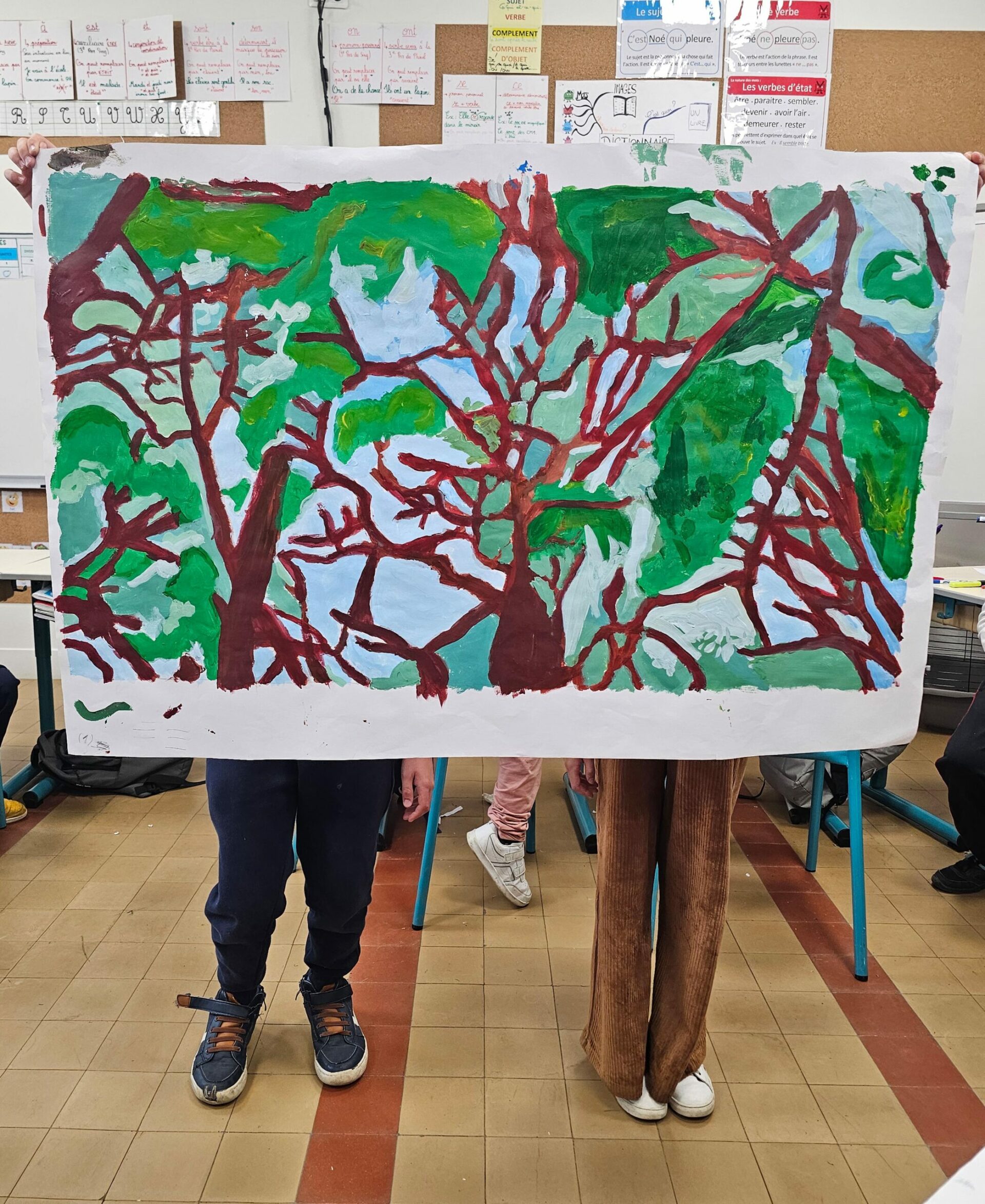 Au cours d’une marche en boucle, les enfants ont été invités à se dissimuler dans le paysage, puis à réagir à l’approche de la caméra comme le ferait un animal surpris par la présence humaine : se cacher, s’éloigner, disparaître. La vidéo ainsi obtenue a donné lieu à une série de captures d’écran, utilisées ensuite comme supports pour un travail de peinture collectif mené par les élèves et l’artiste.
