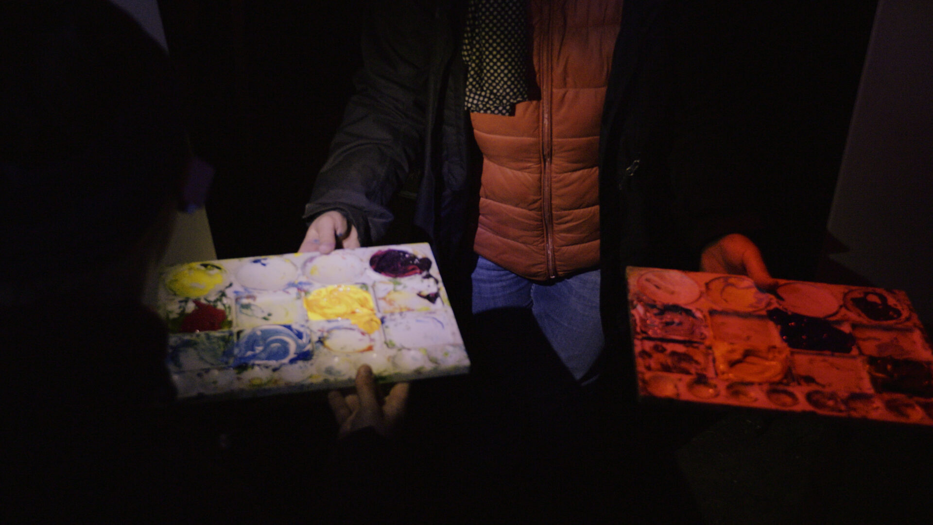 Les palettes, préparées en amont et distribuées sans aucune indication, rendaient le geste pictural purement intuitif. L’acte de peindre se fondait alors dans un rapport sensible aux contrastes et aux tonalités.