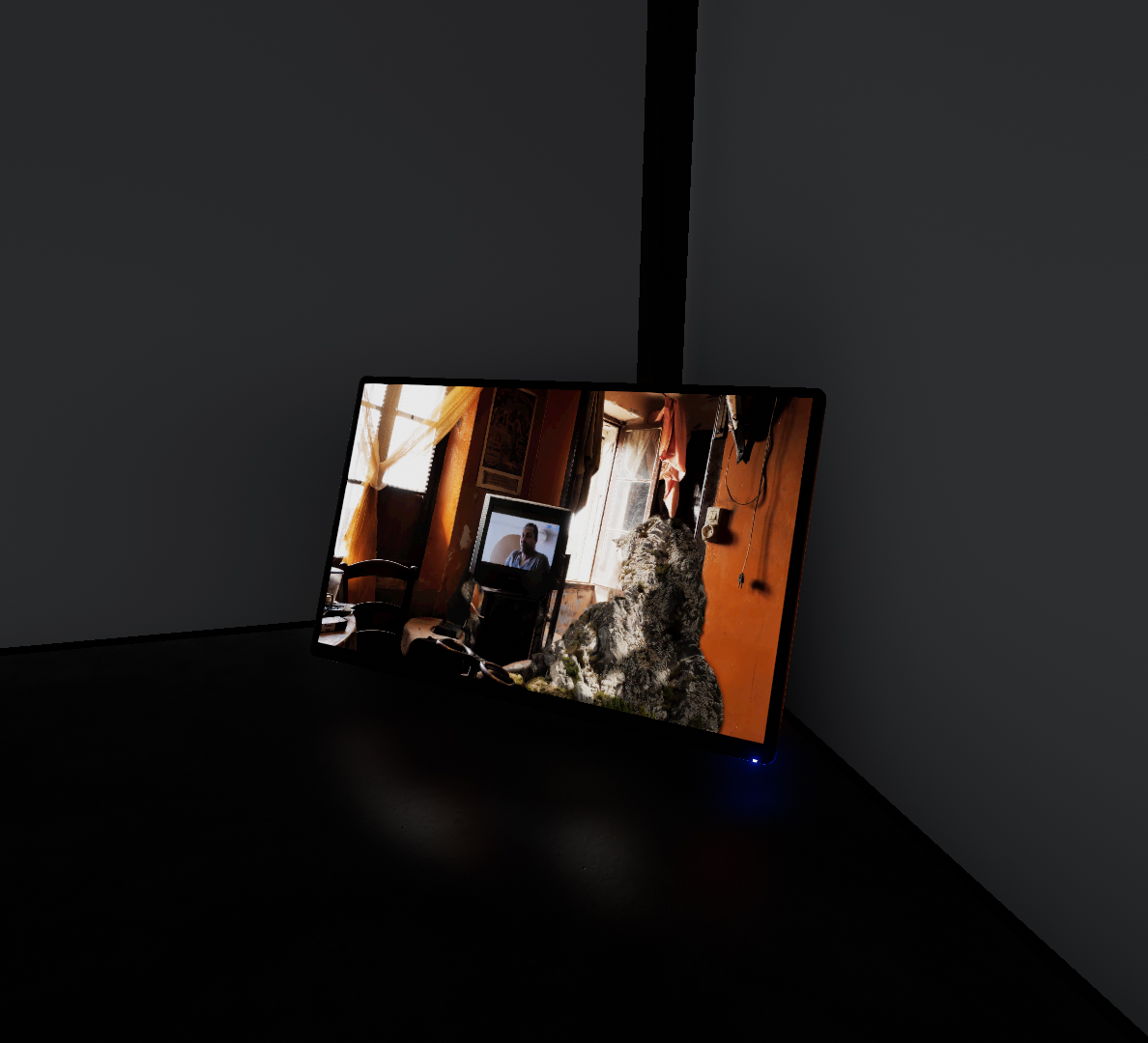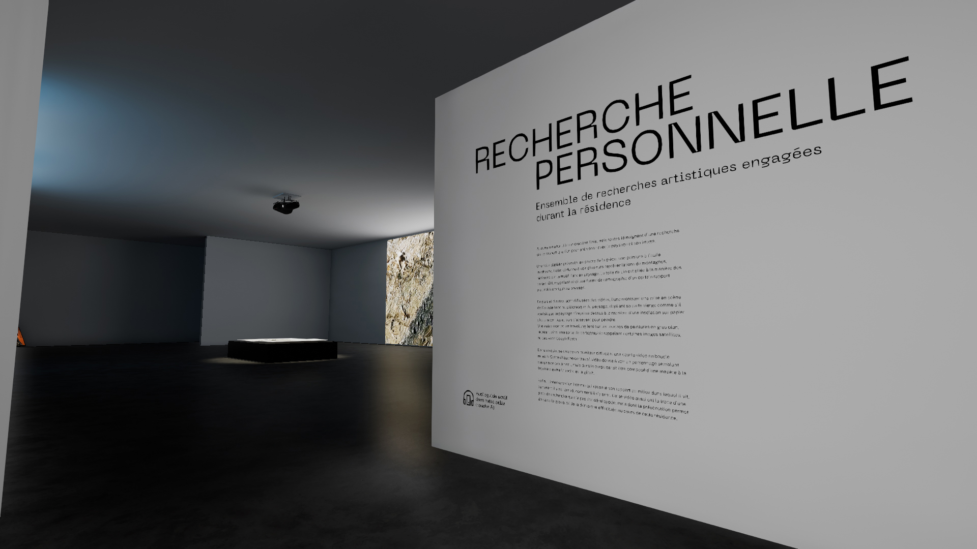 Dans un coin, se trouve un moniteur diffusant une courte vidéo en boucle muette. On y voit un personnage semblant s’exprimer oralement, mais dont le corps parait être composé d’une matière à la frontière entre la roche et le glitch. Cette ébauche de travail vidéo, témoigne d’une direction que l’artiste a commencer à explorer dans sa résidence sans pour autant la continuer.