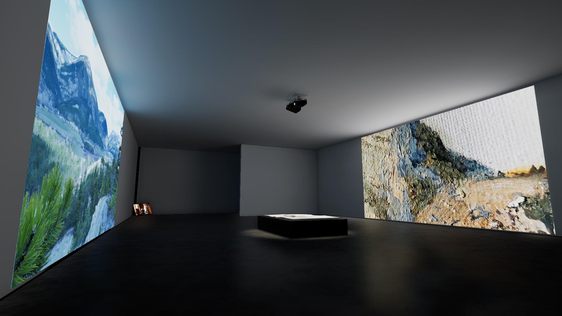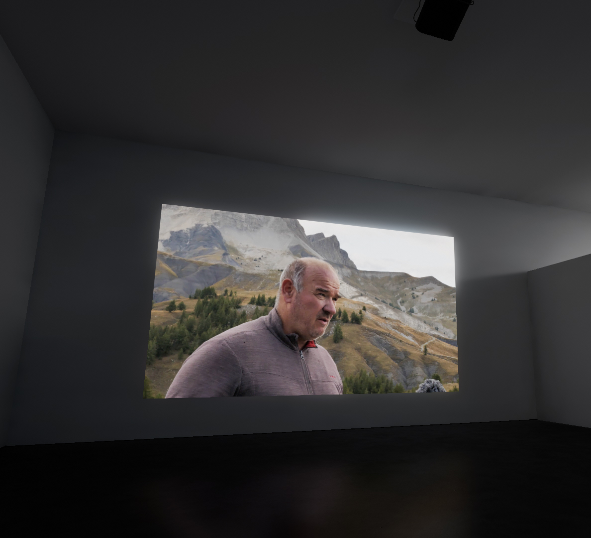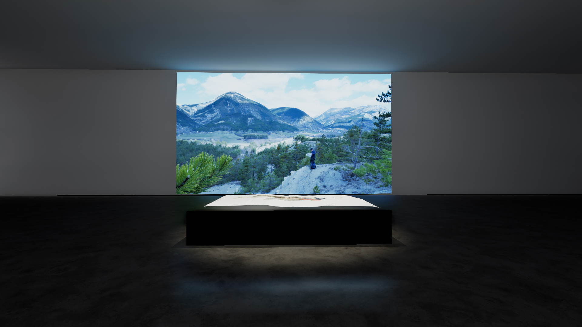 De part et d’autre, sont diffusées des vidéos, l’une montrant une mise en scène de l’artiste face au pittoresque du paysage, dépliant sa carte vierge comme s’il voulait que le paysage s’imprime dessus à la manière d’une insolation sur papier photo argentique, puis s’asseyant pour peindre.