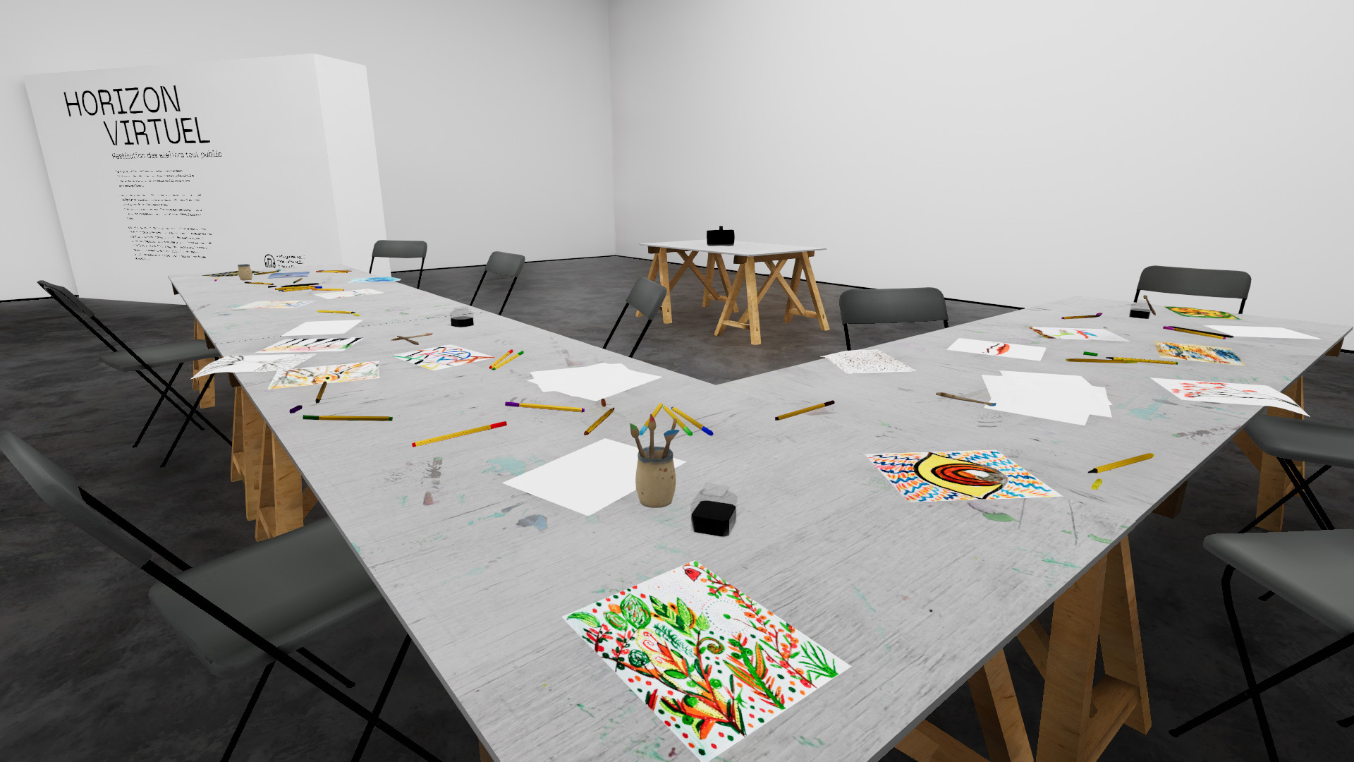 autre manière : non pas en deux dimensions, mais en trois, c’est-à-dire, comme s’ils y étaient totalement plongés. Leurs dessins sont ainsi passés du format plan et limité de la feuille A4, à une vision à 360° et englobante. Ce passage générant ainsi une nouvelle interprétation du dessin et une nouvelle image à découvrir.