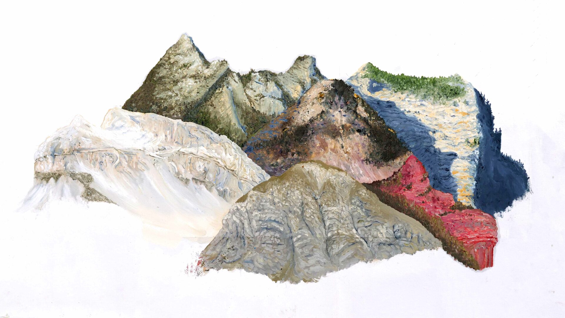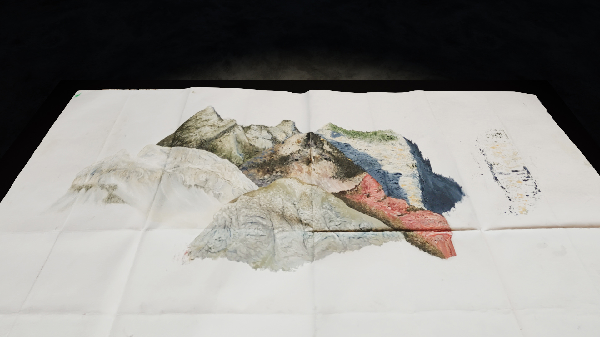 Une toile dépliée présente, au centre de la pièce, une peinture à l’huile inachevée. Celle-ci donne à voir plusieurs représentations de montagnes, réalisées sur le motif, face au paysage. La toile de Lin est pliée à la manière des cartes IGN, rappelant ainsi une forme de cartographie d’un certain rapport pictural historique au paysage.