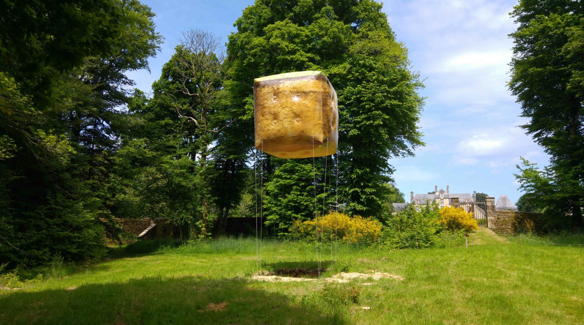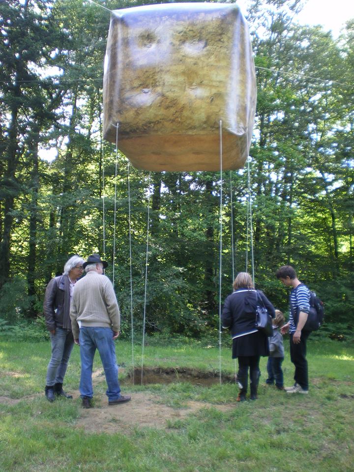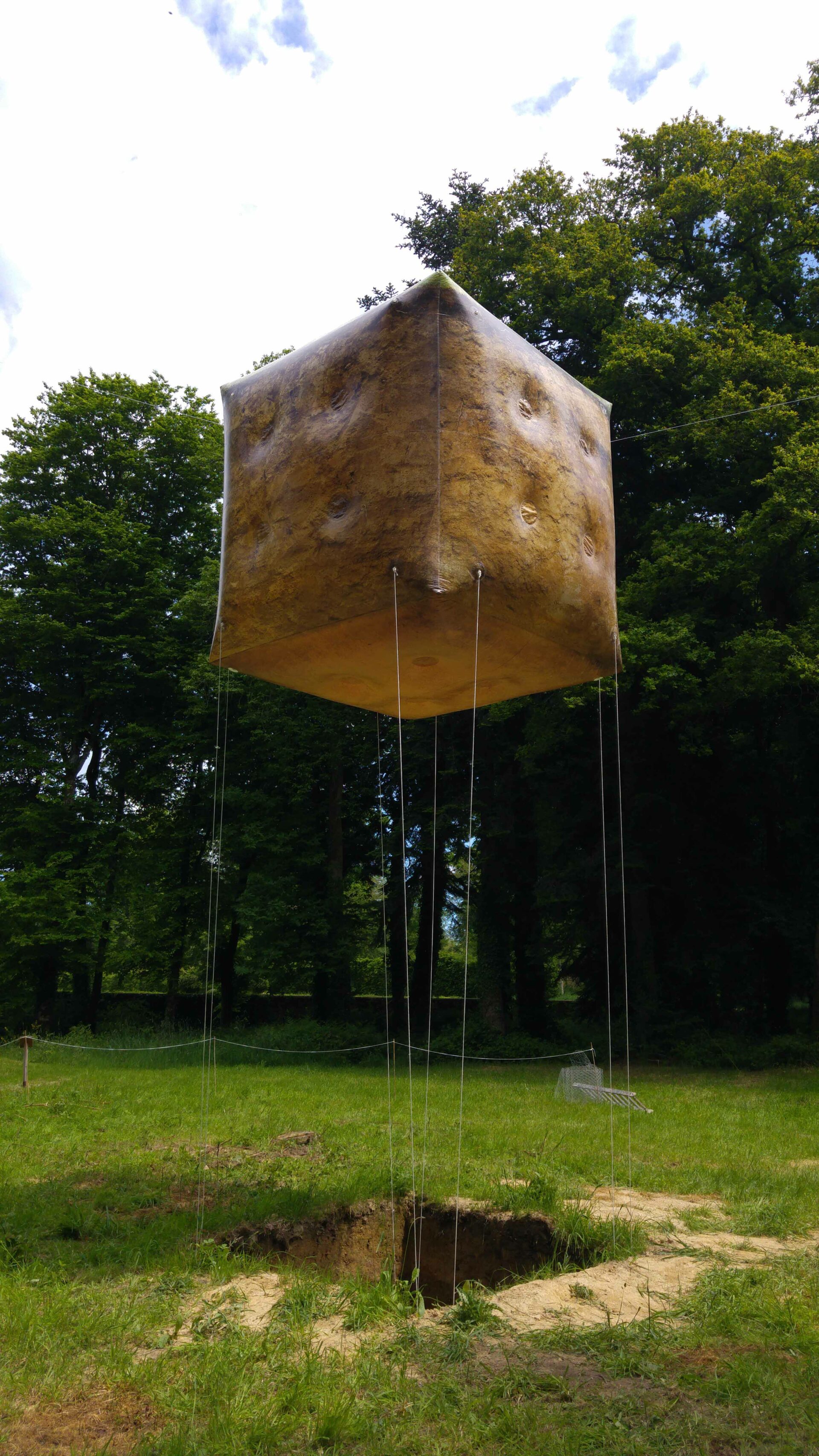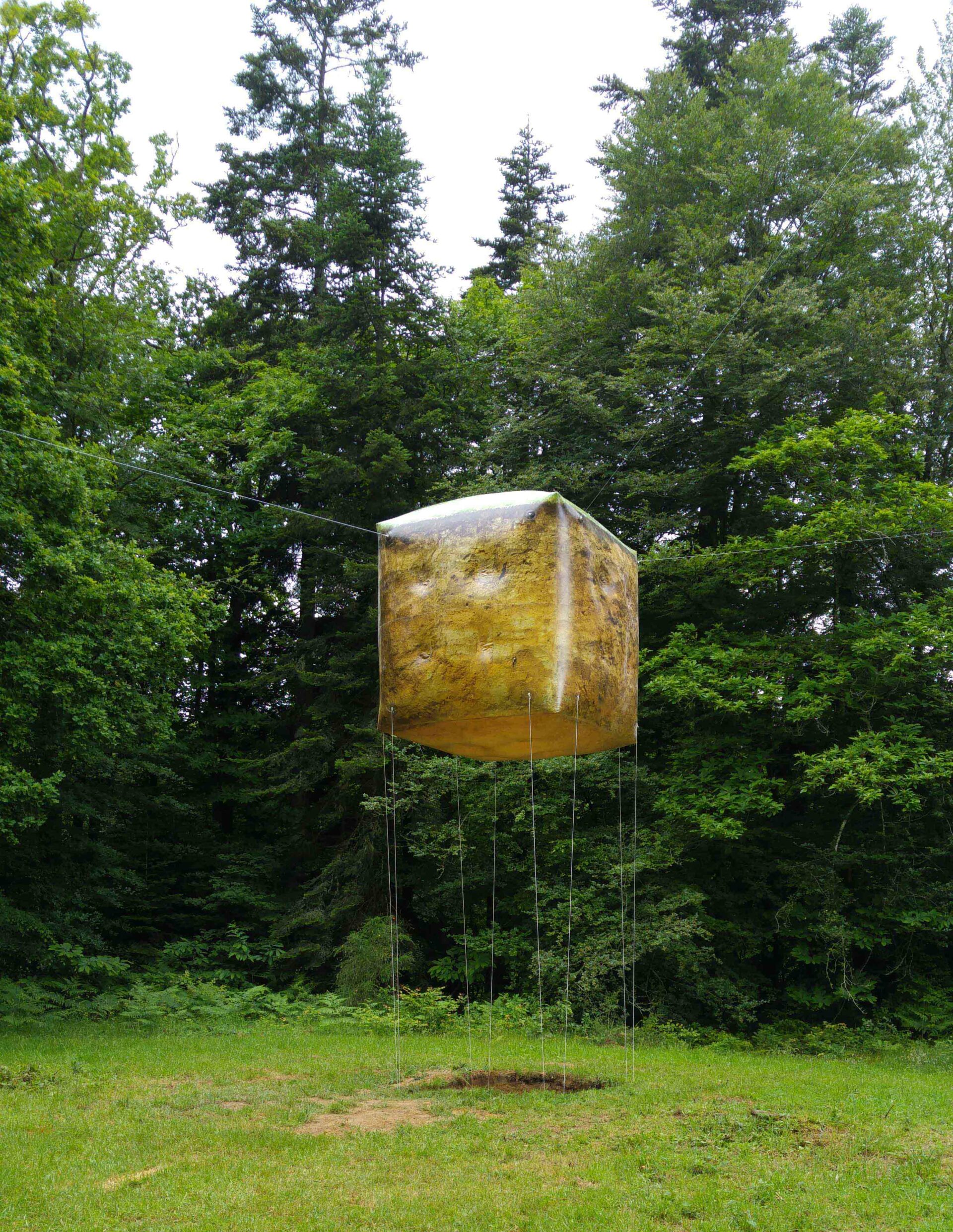 Présentée au sein du parc, cette installation met en place un dialogue avec ce jardin et son domaine. C’est à travers les notions de parcelle et de maîtrise de la nature que s’articule le projet en question : Un bloc de terrain est extrait de la clairière au abords du jardin, cette soustraction donnant naissance à un trou de 2 mètres de profondeur. Les 8 mètres cube de terre extraits se retrouvent «transformés» en une structure flottante au dessus de leur emplacement d’origine. Ce ballon d’hélium figure ainsi le passage d’une matière solide, naturelle et concrète à un objet burlesque, artificiel, et aérien.