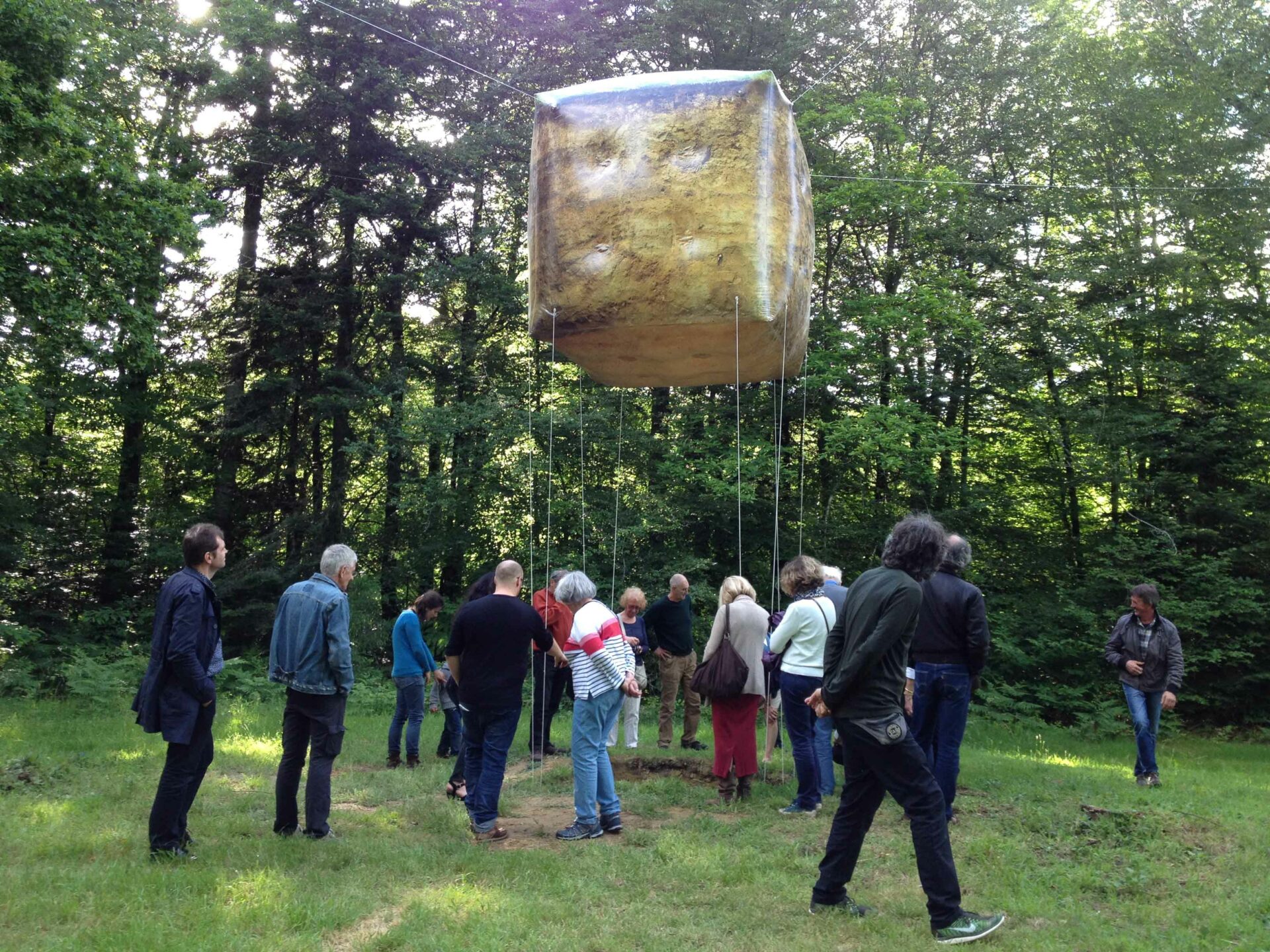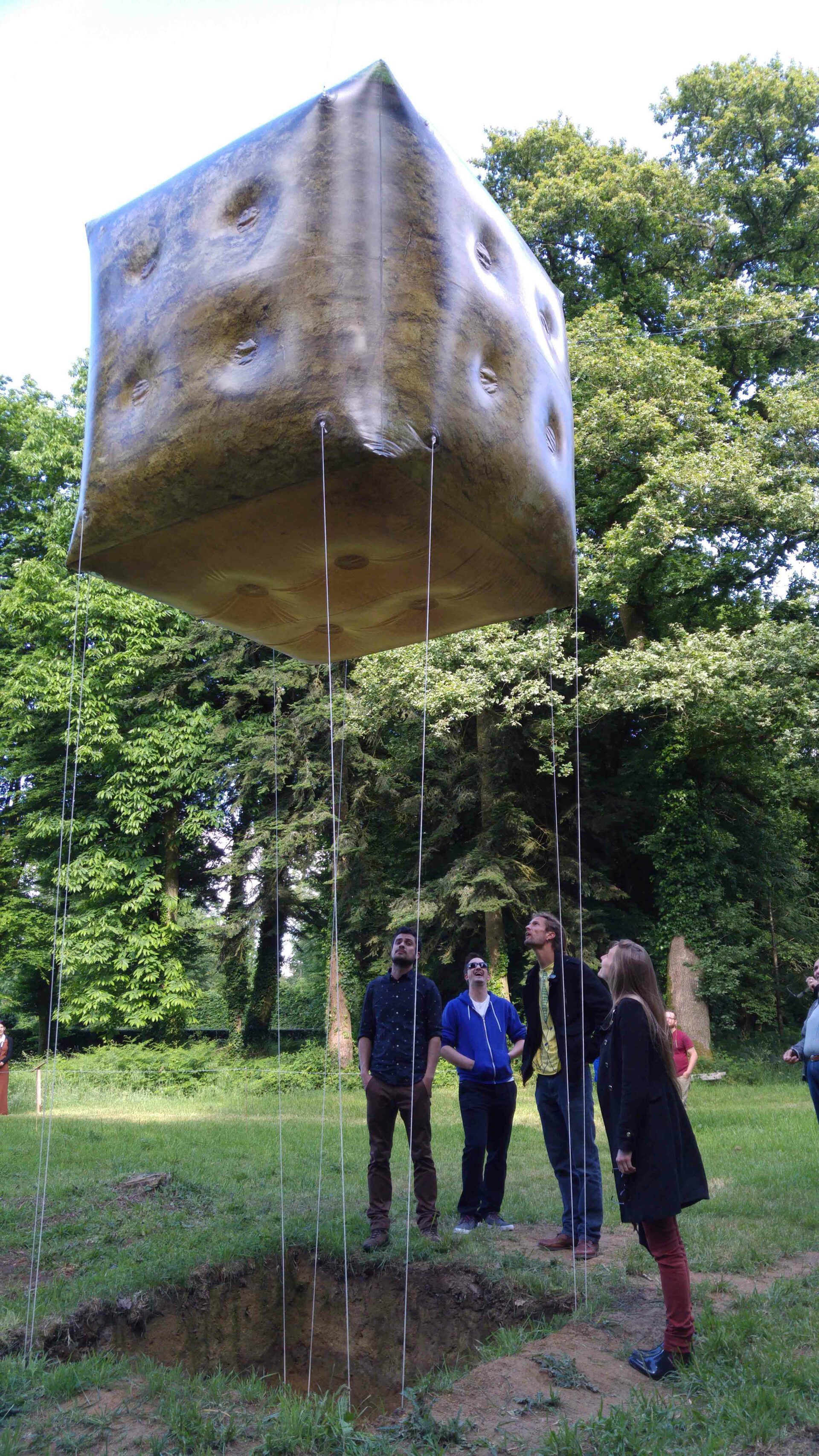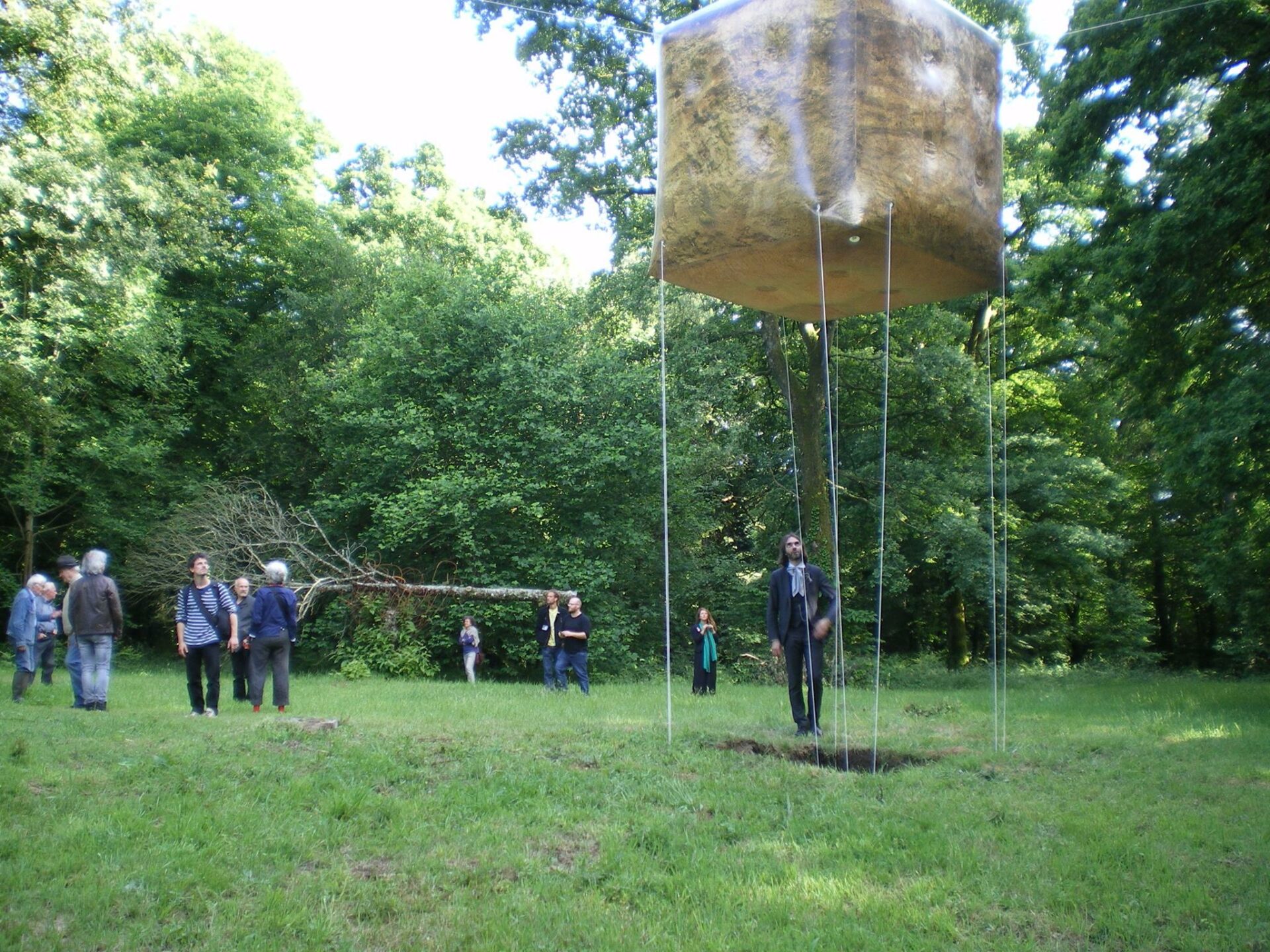 Présentée au sein du parc, cette installation met en place un dialogue avec ce jardin et son domaine. C’est à travers les notions de parcelle et de maîtrise de la nature que s’articule le projet en question : Un bloc de terrain est extrait de la clairière au abords du jardin, cette soustraction donnant naissance à un trou de 2 mètres de profondeur. Les 8 mètres cube de terre extraits se retrouvent «transformés» en une structure flottante au dessus de leur emplacement d’origine. Ce ballon d’hélium figure ainsi le passage d’une matière solide, naturelle et concrète à un objet burlesque, artificiel, et aérien.