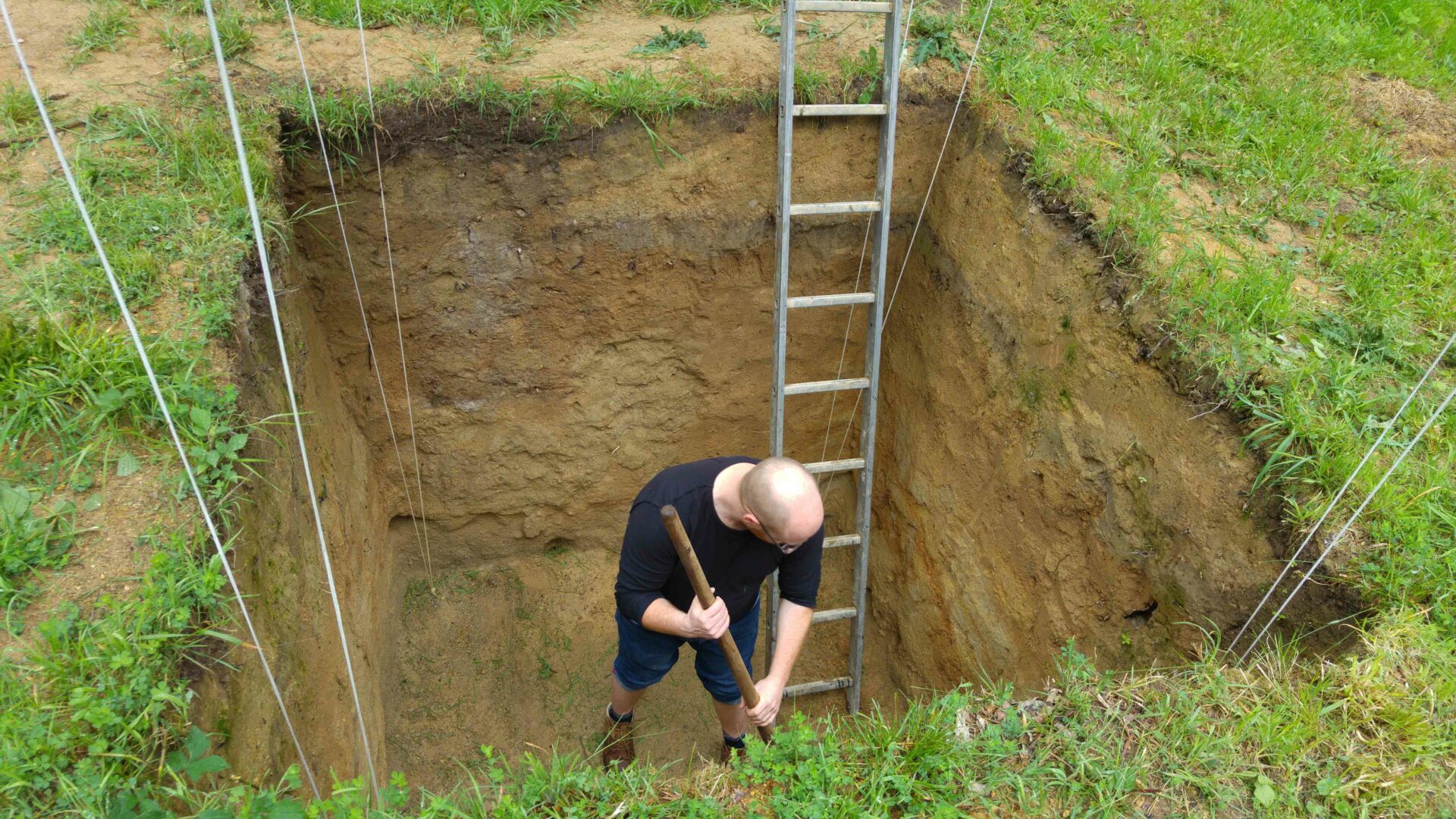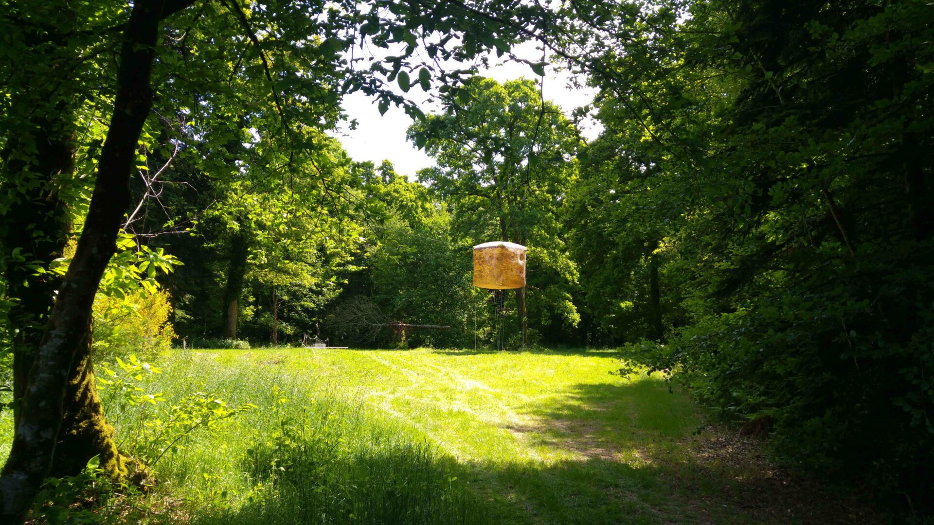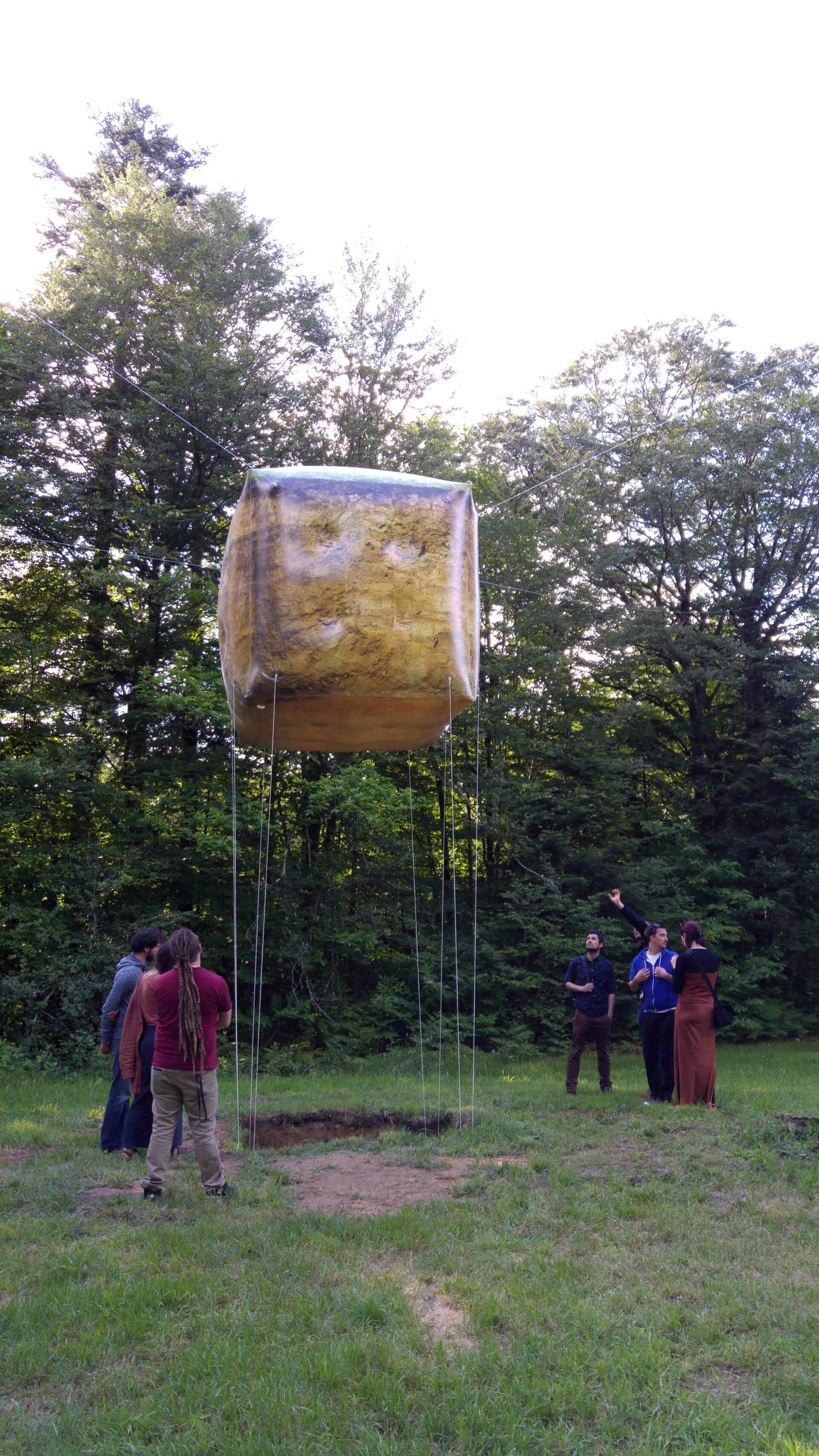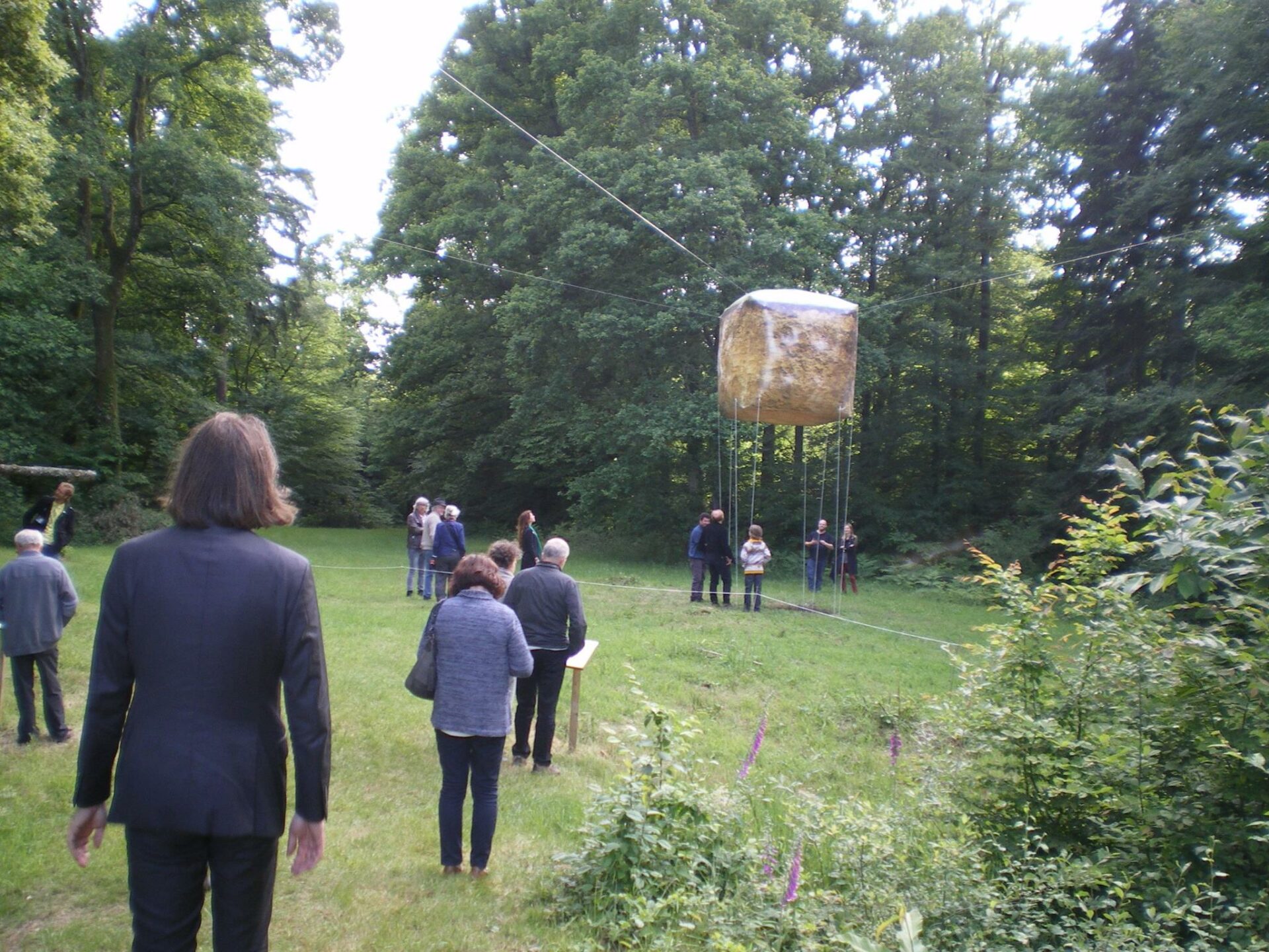 Présentée au sein du parc, cette installation met en place un dialogue avec ce jardin et son domaine. C’est à travers les notions de parcelle et de maîtrise de la nature que s’articule le projet en question : Un bloc de terrain est extrait de la clairière au abords du jardin, cette soustraction donnant naissance à un trou de 2 mètres de profondeur. Les 8 mètres cube de terre extraits se retrouvent «transformés» en une structure flottante au dessus de leur emplacement d’origine. Ce ballon d’hélium figure ainsi le passage d’une matière solide, naturelle et concrète à un objet burlesque, artificiel, et aérien.
