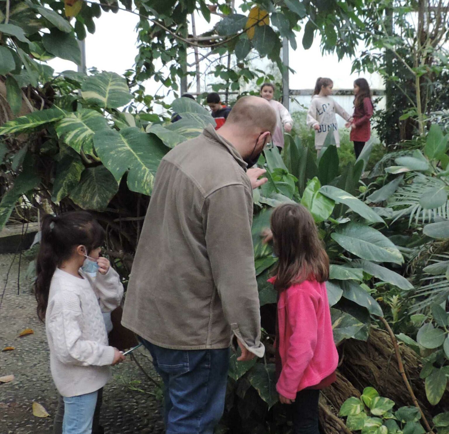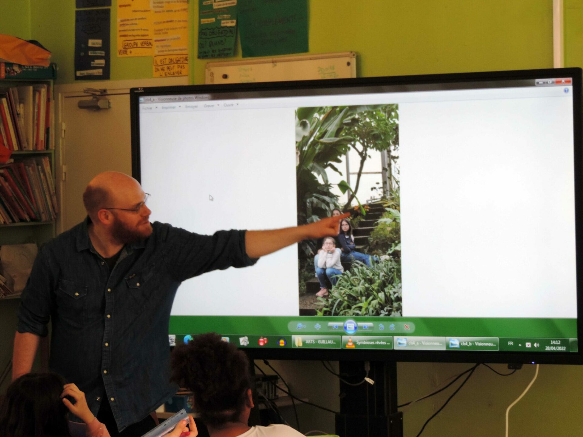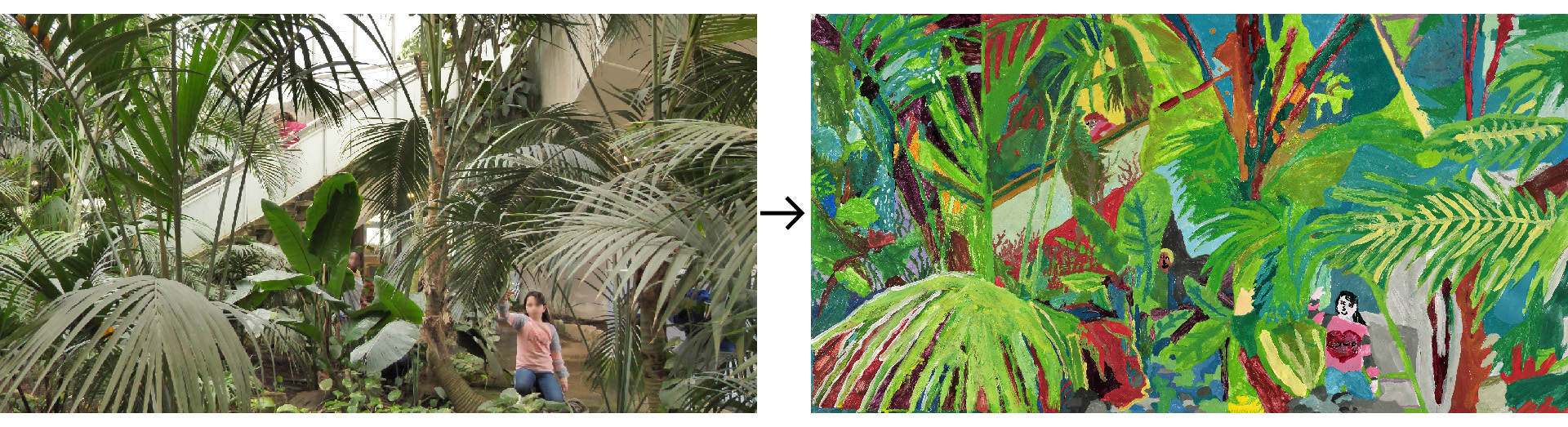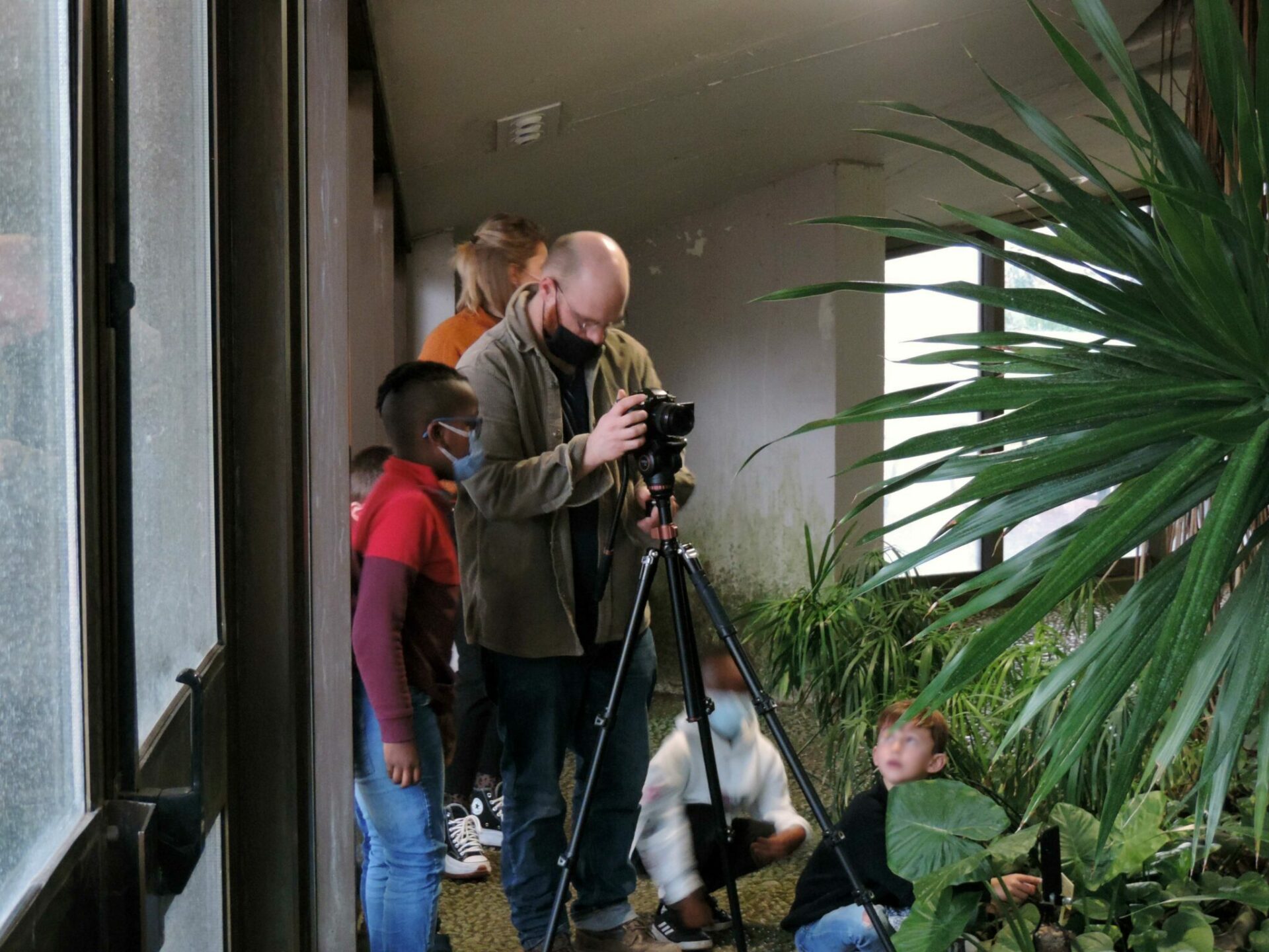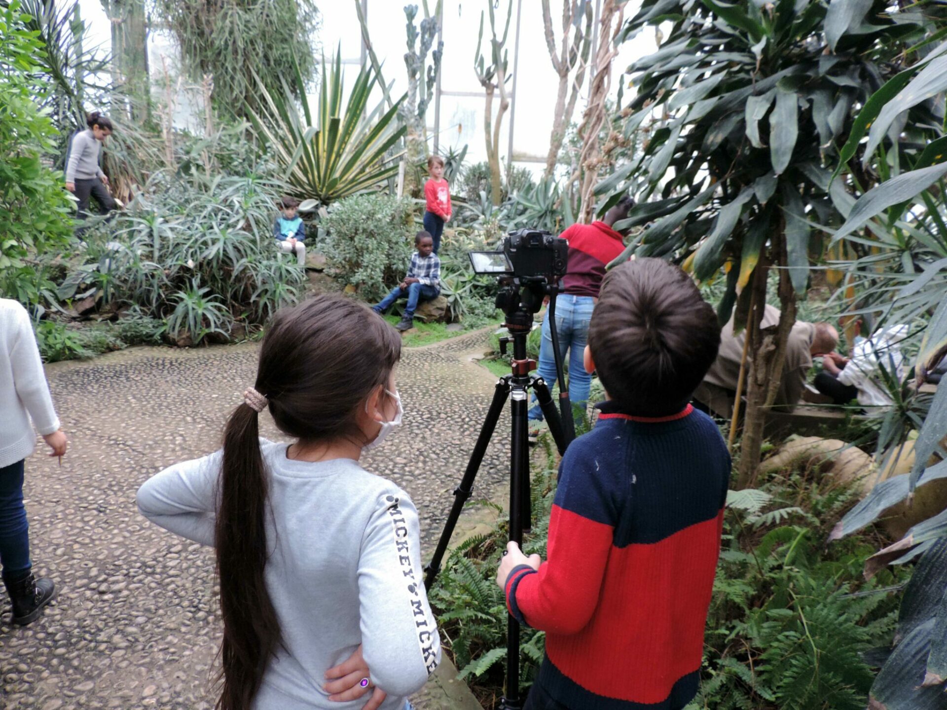 Cette démarche constitua à mettre en scène les différents « modèles » au sein du cadre foisonnant de la serre. Entre trois et cinq enfants sélectionnés devaient se positionner entre les multiples fougères, troncs, lianes, et autres feuilles géantes que forme ce théâtre luxuriant. Les autres s’attelaient à les filmer et les dessiner sur le motif. Chaque groupe constituait ainsi une série de portraits animés d’élèves, posant comme pouvaient le faire les modèles des peintres classiques. Cette manœuvre initiale pouvait déjà être vue comme le reflet d’un premier essai de « symbiose » avec l’environnement végétal.