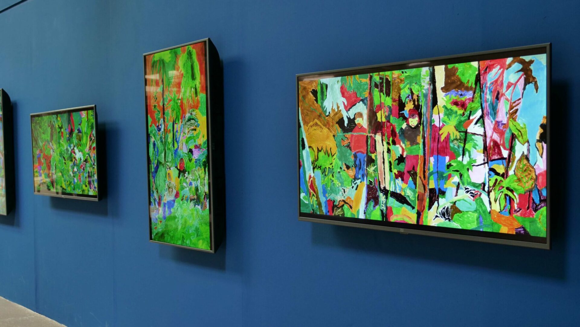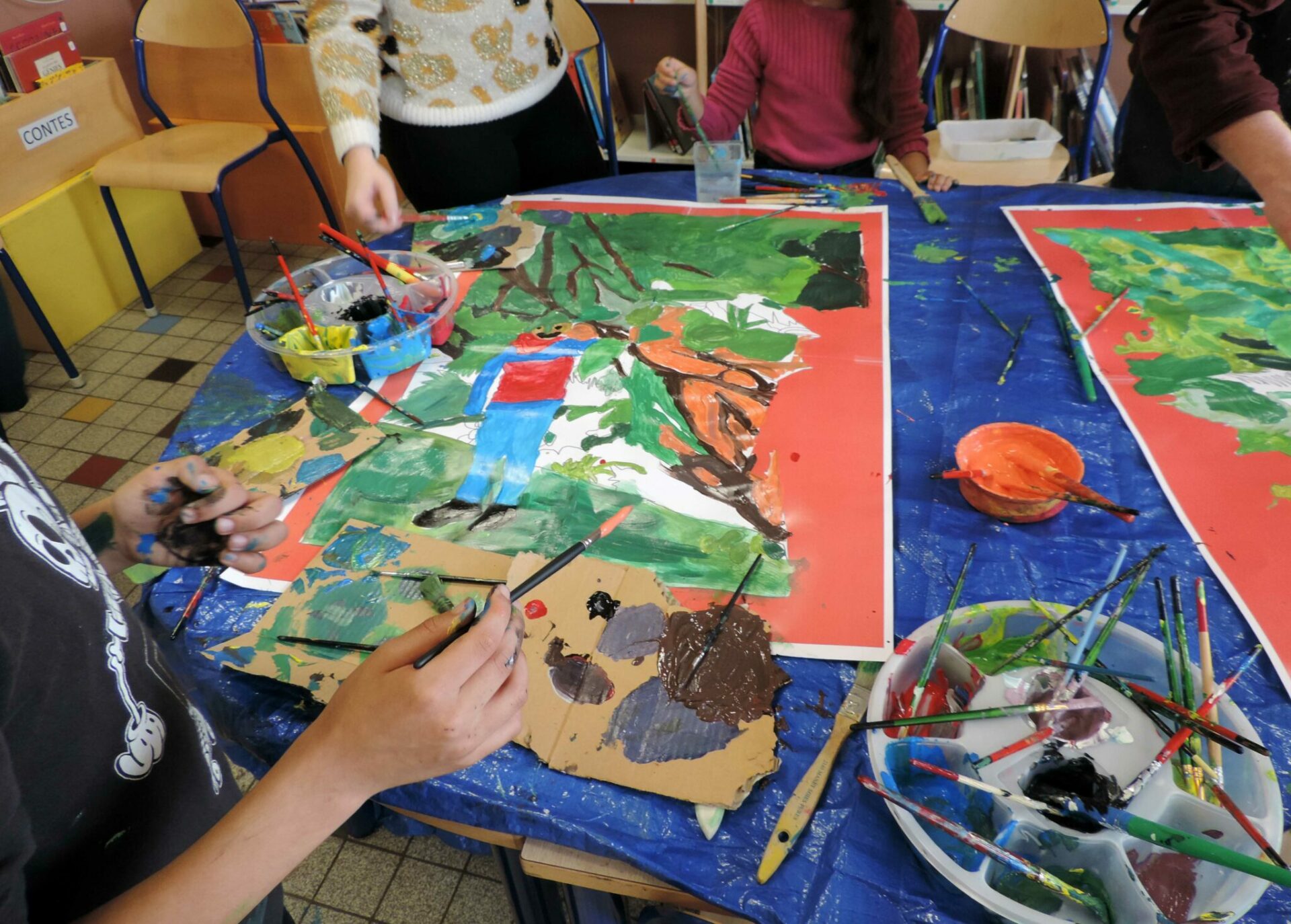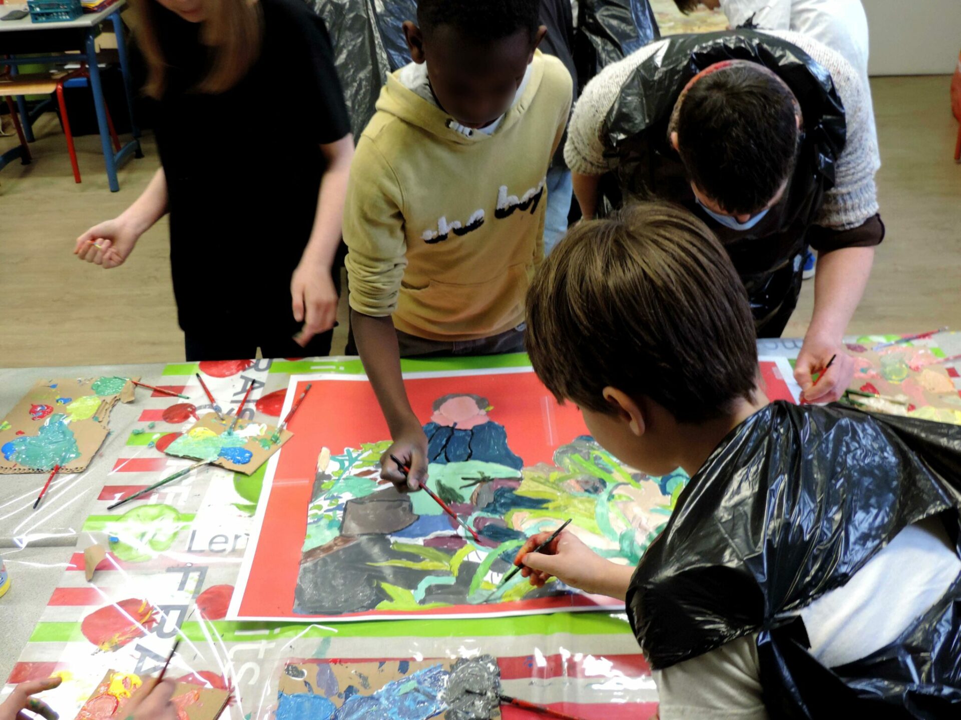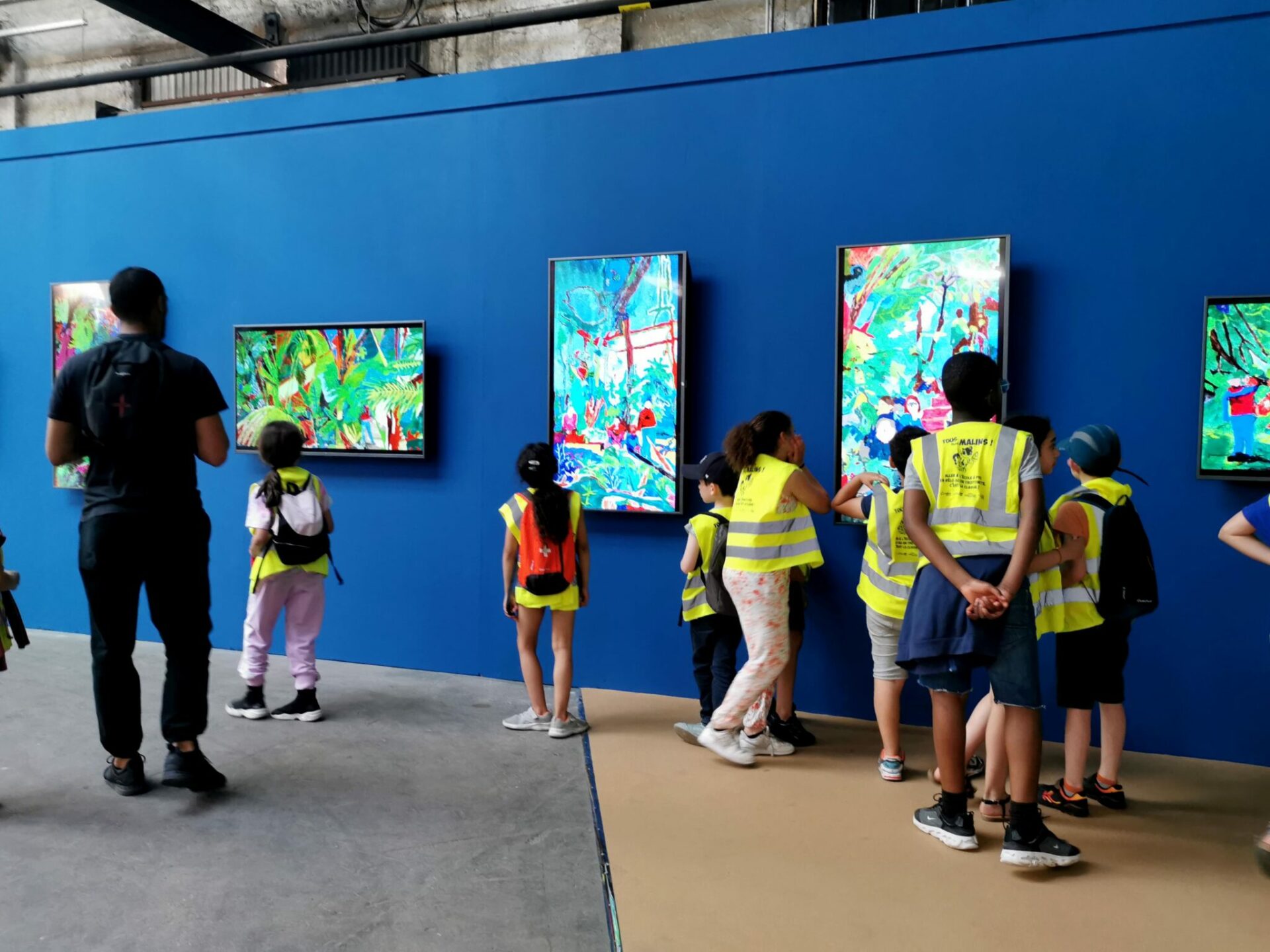 De retour en classe quelques semaines plus tard, l’idée était de peindre le souvenir de cette expérience sur grand format. Chaque groupe d’élèves composés de quatre à six personnes se sont affairés à réaliser des peintures collectives. Chacune de ces images, composées d’après une capture d’écran des vidéos précédentes, apparaissaient autant dans un mélange de remémoration des couleurs que dans une libre interprétation artistique.