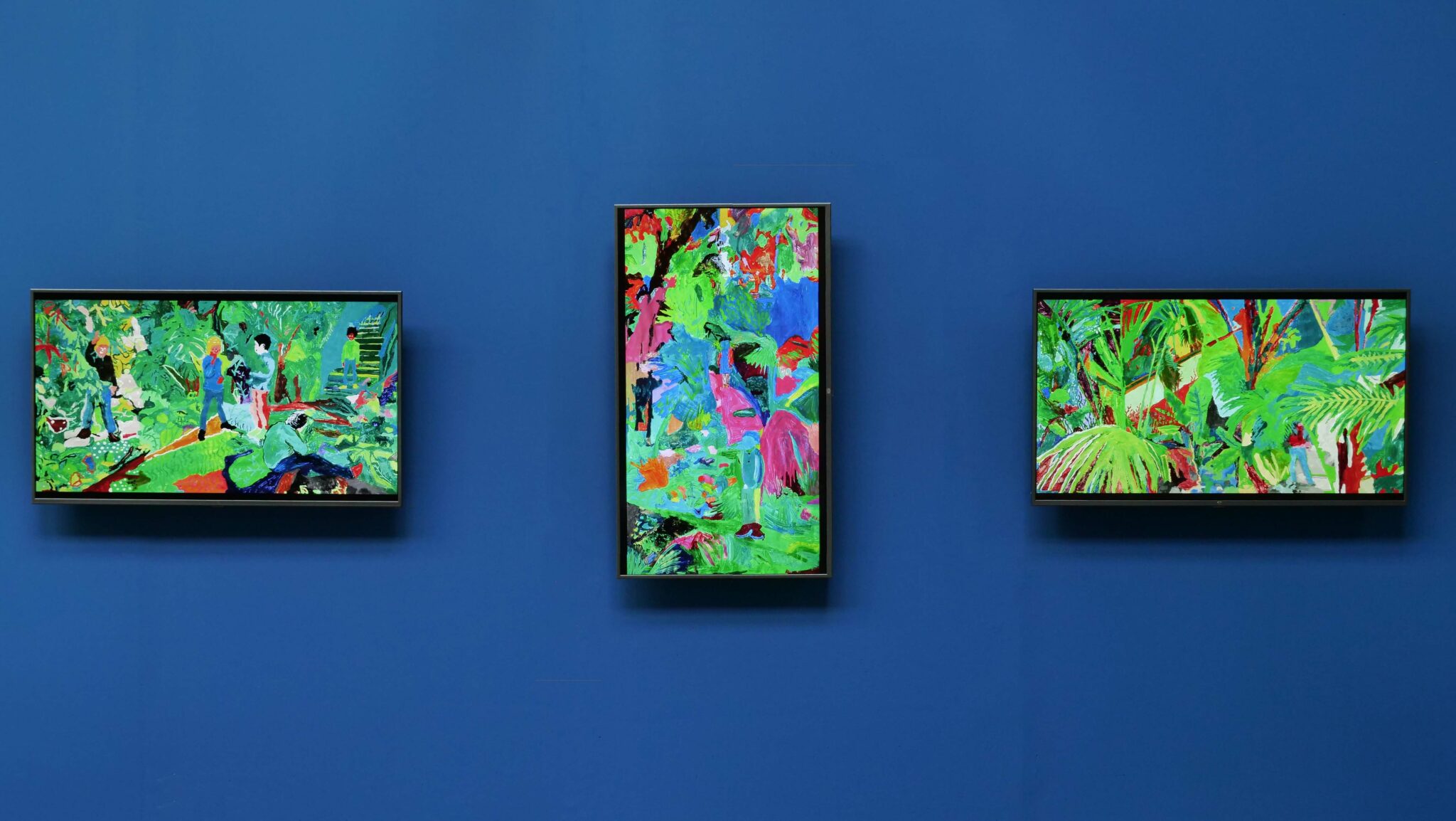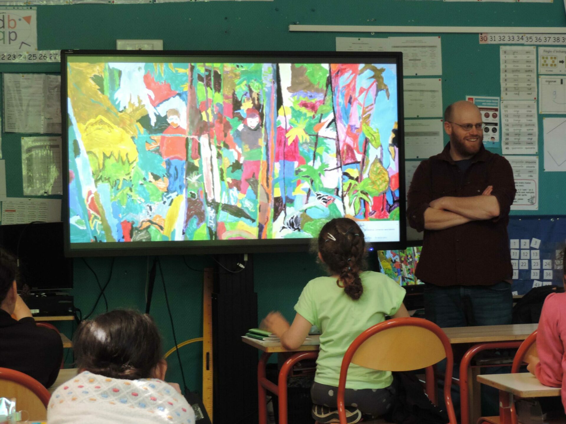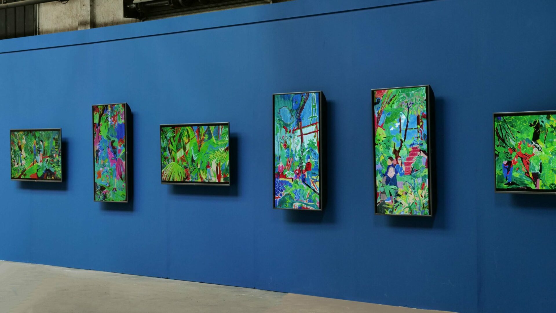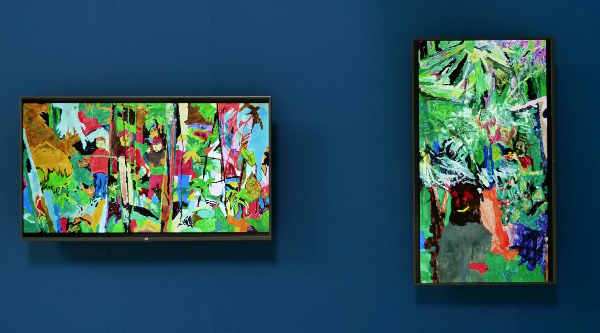 De retour en classe quelques semaines plus tard, l’idée était de peindre le souvenir de cette expérience sur grand format. Chaque groupe d’élèves composés de quatre à six personnes se sont affairés à réaliser des peintures collectives. Chacune de ces images, composées d’après une capture d’écran des vidéos précédentes, apparaissaient autant dans un mélange de remémoration des couleurs que dans une libre interprétation artistique.