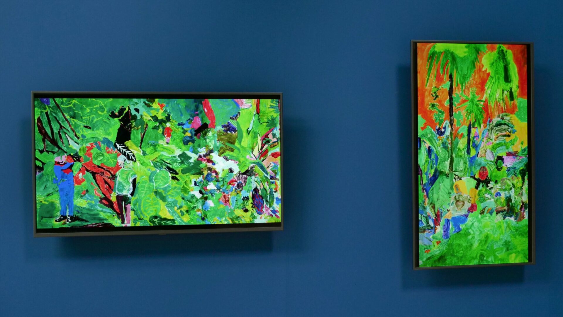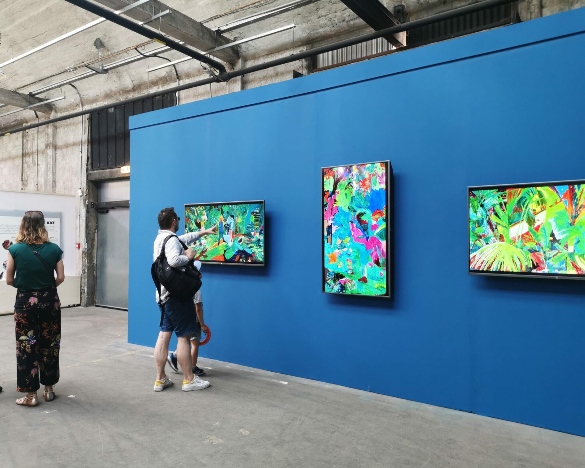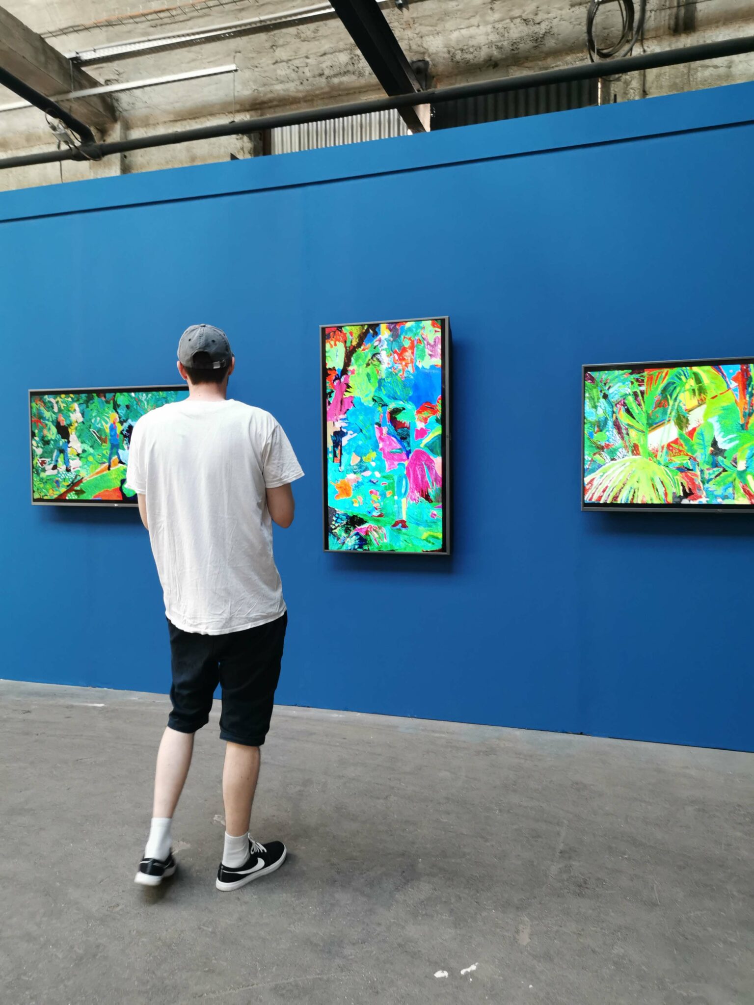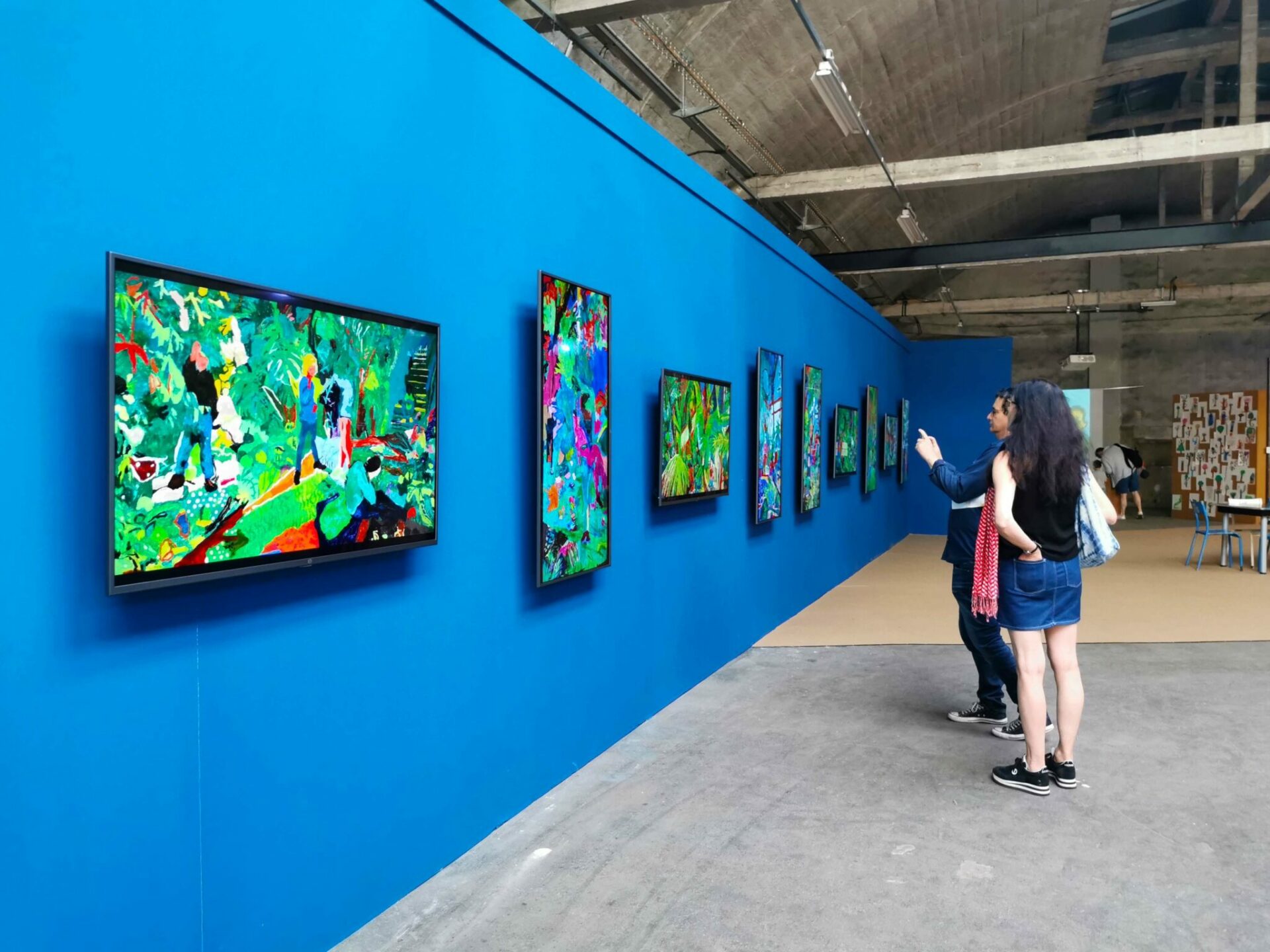 De retour en classe quelques semaines plus tard, l’idée était de peindre le souvenir de cette expérience sur grand format. Chaque groupe d’élèves composés de quatre à six personnes se sont affairés à réaliser des peintures collectives. Chacune de ces images, composées d’après une capture d’écran des vidéos précédentes, apparaissaient autant dans un mélange de remémoration des couleurs que dans une libre interprétation artistique.