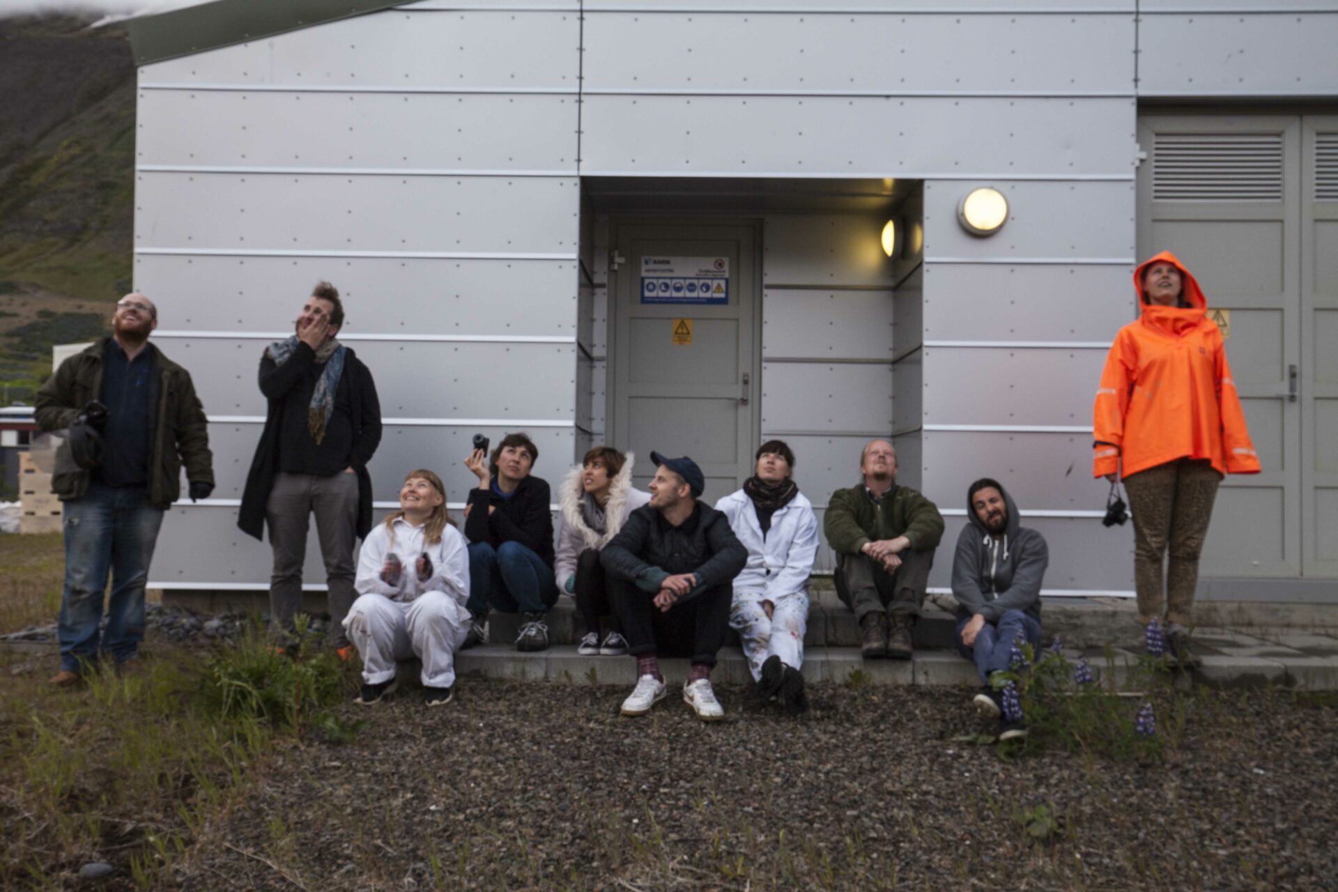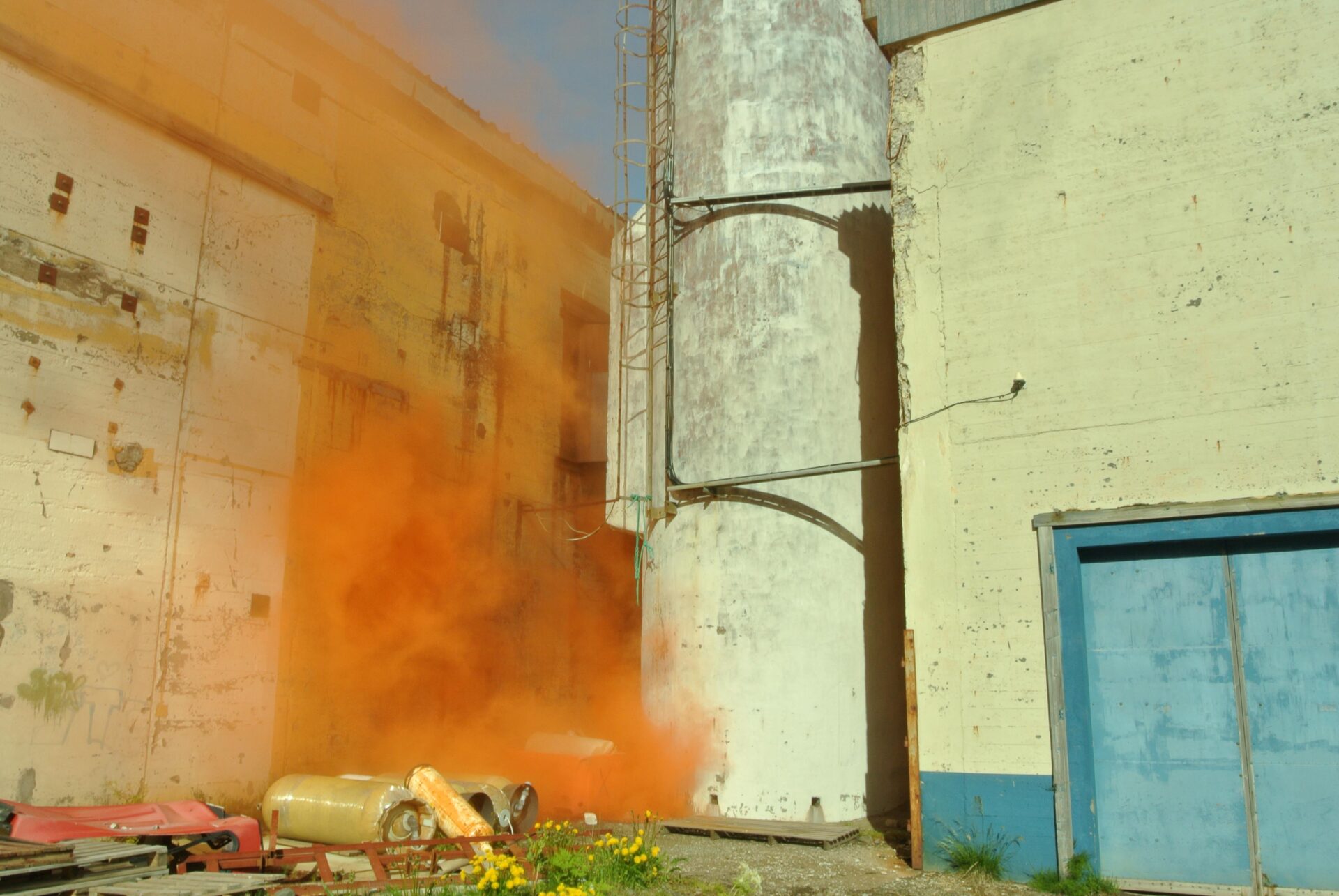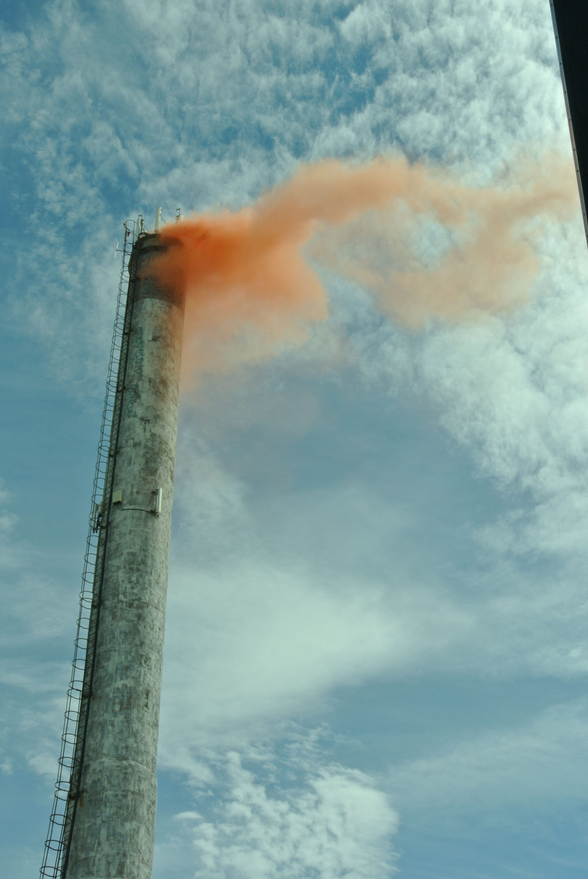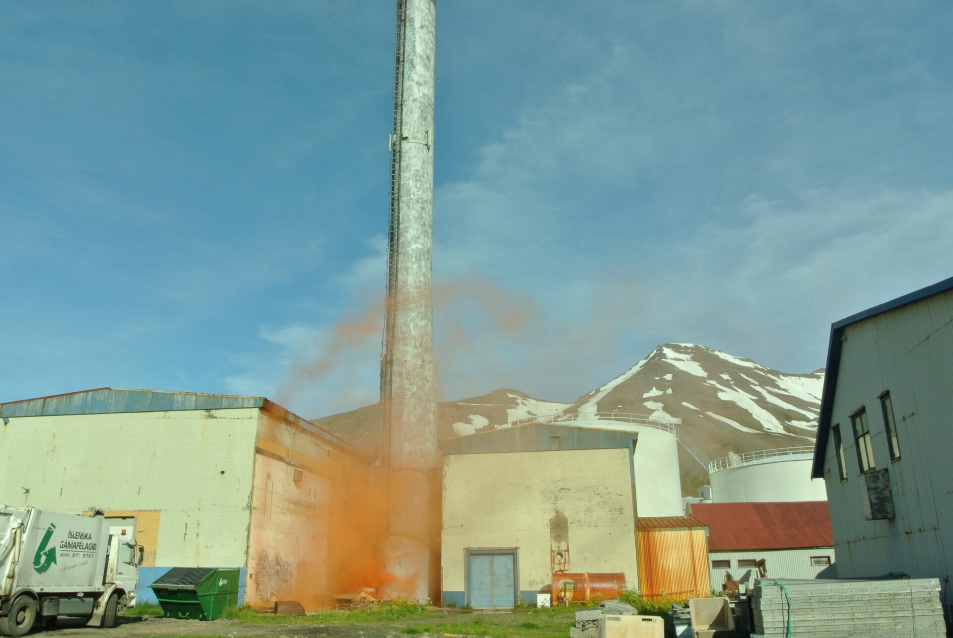 À l’époque des grandes pêches aux harengs, la ville de Siglufjörður était tout les jours emplie d’une odeur nauséabonde de poisson. Lorsque quelqu’un se plaignait de cette odeur on lui répondait : « Ce n’est pas l’odeur du poisson, c’est celle de l’argent ! ». De nos jours la pêche est beaucoup moins intense mais l’ancienne cheminée de l’usine de poisson est toujours présente au sein de la ville, pour les habitants elle est restée un élément quotidien du paysage.Ce qui nous a intéressé ici, c’est d’essayer de «réactiver» cette cheminée en lui redonnant sa fonction première: évacuer de la fumée. Nous avons donc utilisé de vieux fumigènes de secours dont sont habituellement équipés les bateaux de pêche. Ils ont tous été enclenchés simultanément dans la cheminée de l’usine. Peu de temps après, un grand nuage de fumée orange en est sorti. Les cars de touristes nouveaux venus se sont retrouvés pris dans un étrange brouillard qui a envahi la ville le temps d’un instant. Cette fumée a permis de créer un lien subtil entre le passé industriel de la ville et ses touristes devenus les nouveaux porteurs de « l’odeur de l’argent ! »