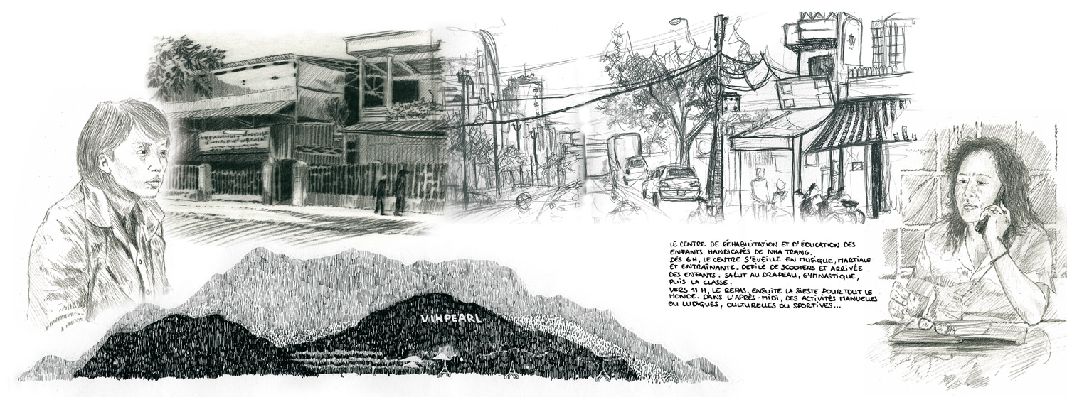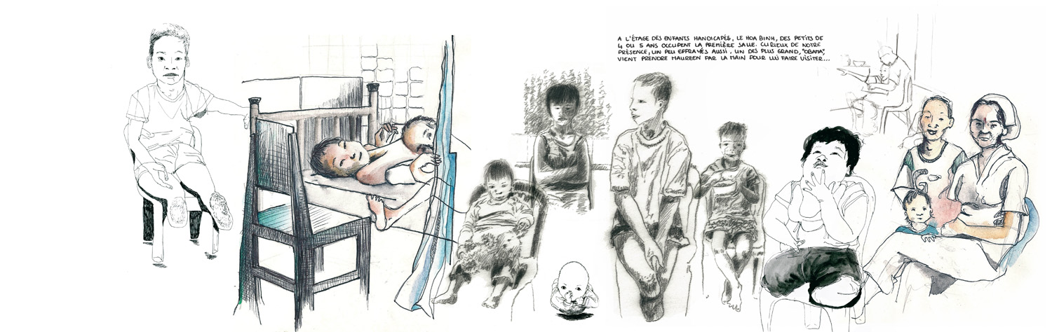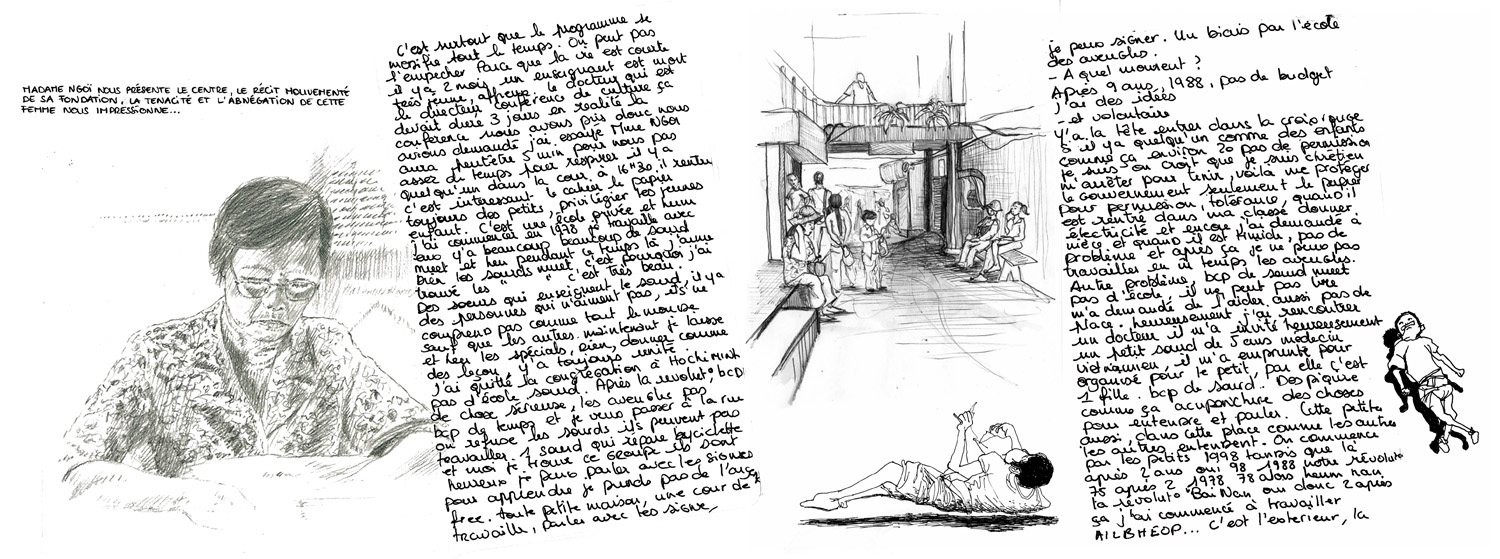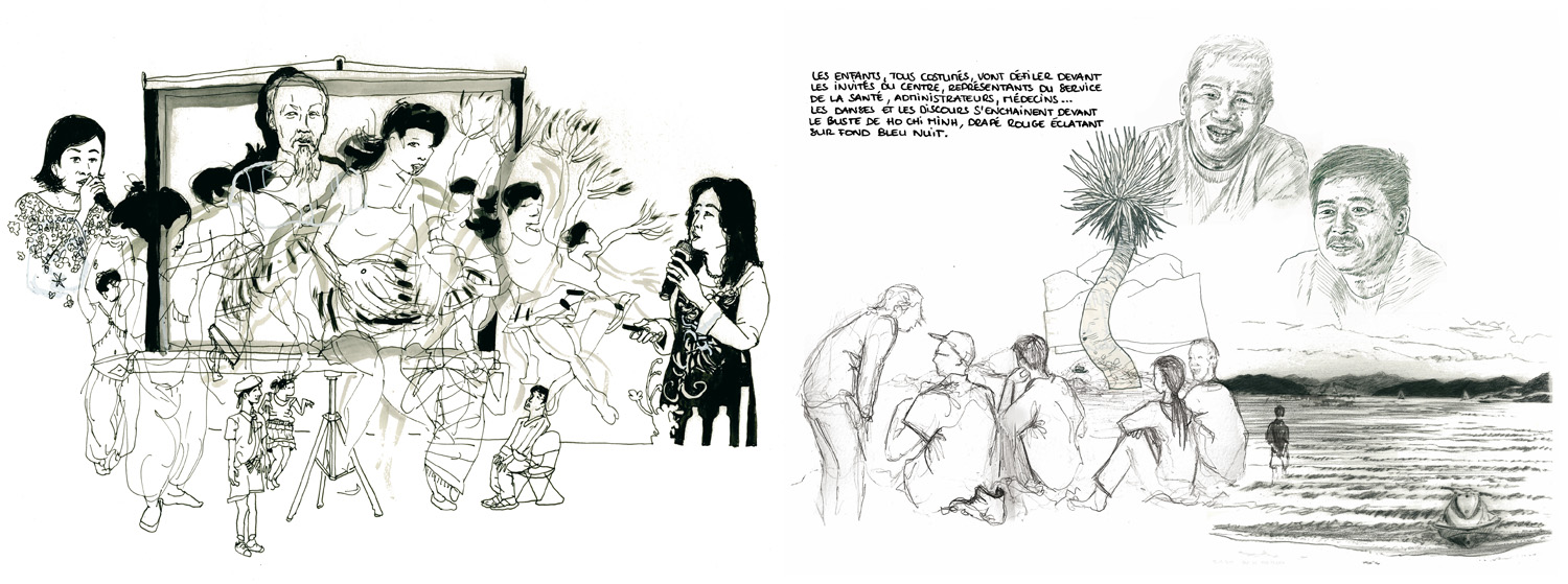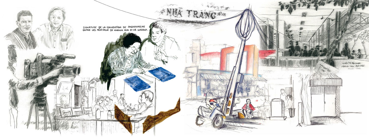 Au début de l’année 2011, deux étudiants de l’école supérieure d’art, accompagnés d’un enseignant, ont suivi une mission médicale de l’ONG L’APPEL( appel au développement pour les enfants du monde ), associée au CHBS-Lorient. Portant sur le programme «Naissances et handicap au Viet Nam», cette mission s’est déroulée à Ho Chi Minh ville et dans la province de Khanh Hoa. L’objectif pour les étudiants était d’enregistrer la mémoire de cet échange professionnel, médical et culturel en réalisant un travail de dessin. Ils présentent aujourd’hui l’ouvrage né de ce projet, dans le cadre du mois de mai du Viet Nam : un carnet de voyage, édité et vendu au profit de L’APPEL.